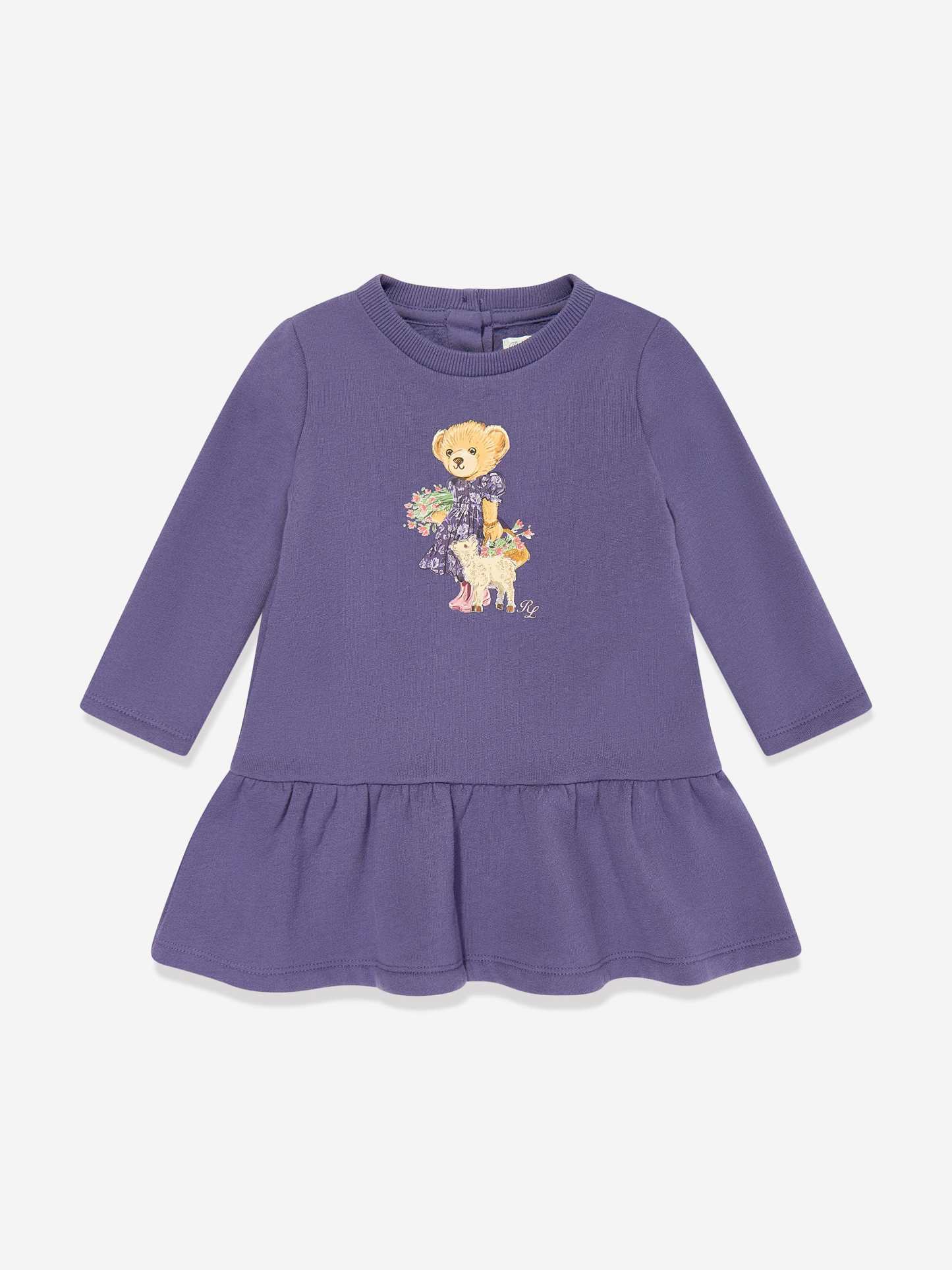 Ralph Lauren depict high quality and Ivy League sensibility into their beautifully crafted aesthetics. This baby girls juneberry dress is a captivating addition to her wardrobe. Crafted in high quality cotton jersey with a flared hem, adorable teddy bear graphic and back button fastening.