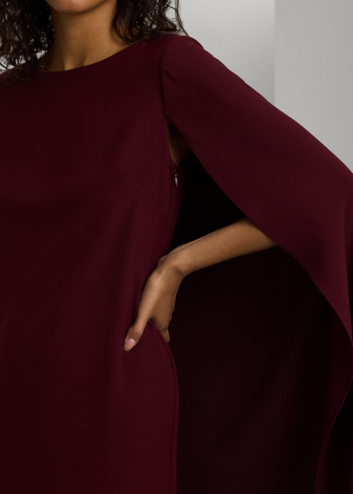 - Rounded neckline. Concealed left-side-seam zipper with a hook-and-eye closure.