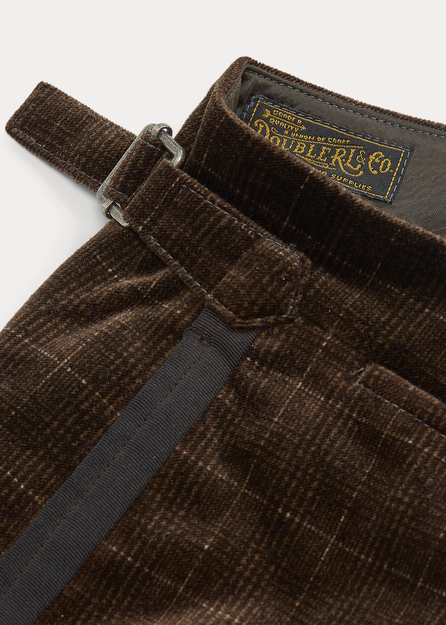 - Belt loops. Side adjusters. Button fly with a buttoned closure. Interior buttons for braces. Corozo buttons.