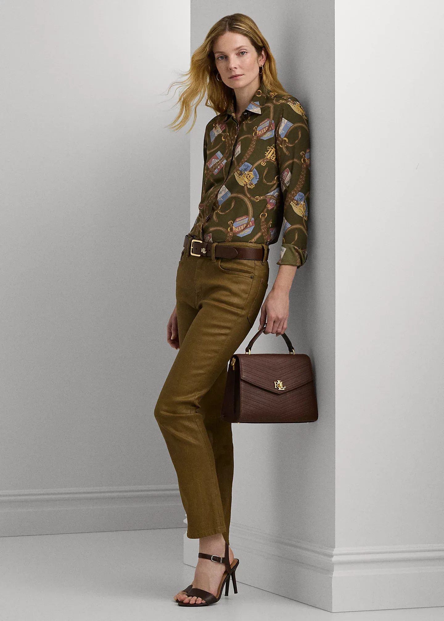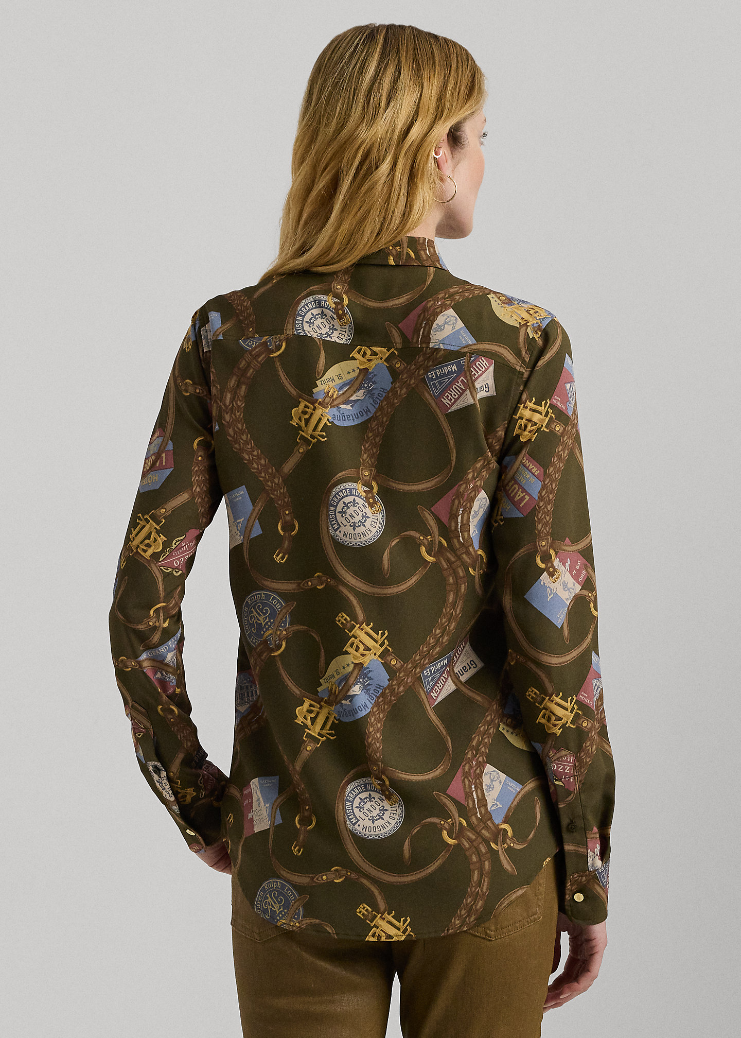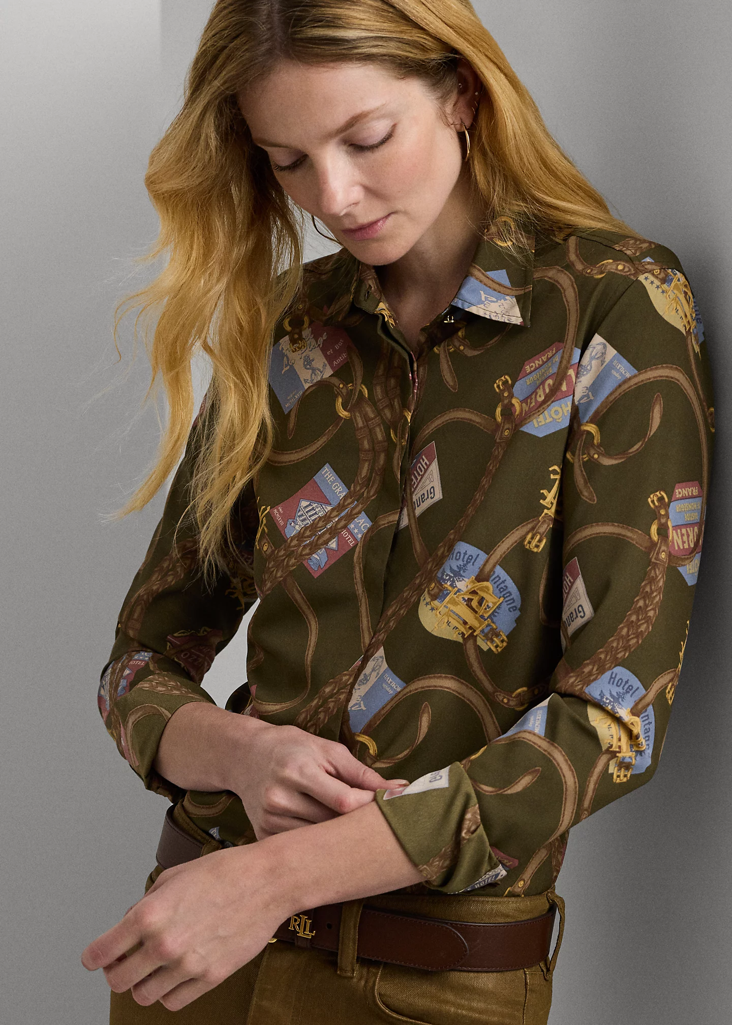 - Long sleeves with buttoned barrel cuffs. Gold-tone “LRL”-engraved buttons at the collar and cuffs.