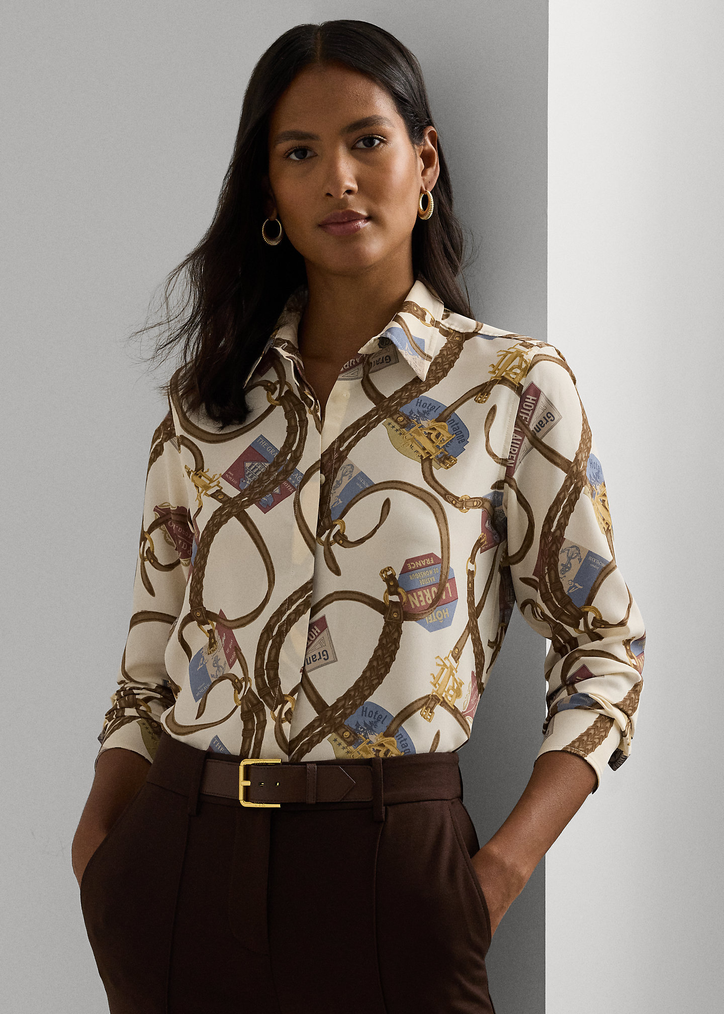 - Point collar. Concealed buttoned placket. “Lauren Ralph Lauren”–engraved buttons.