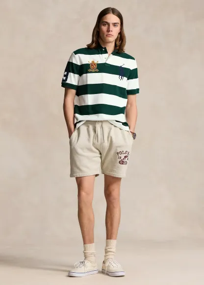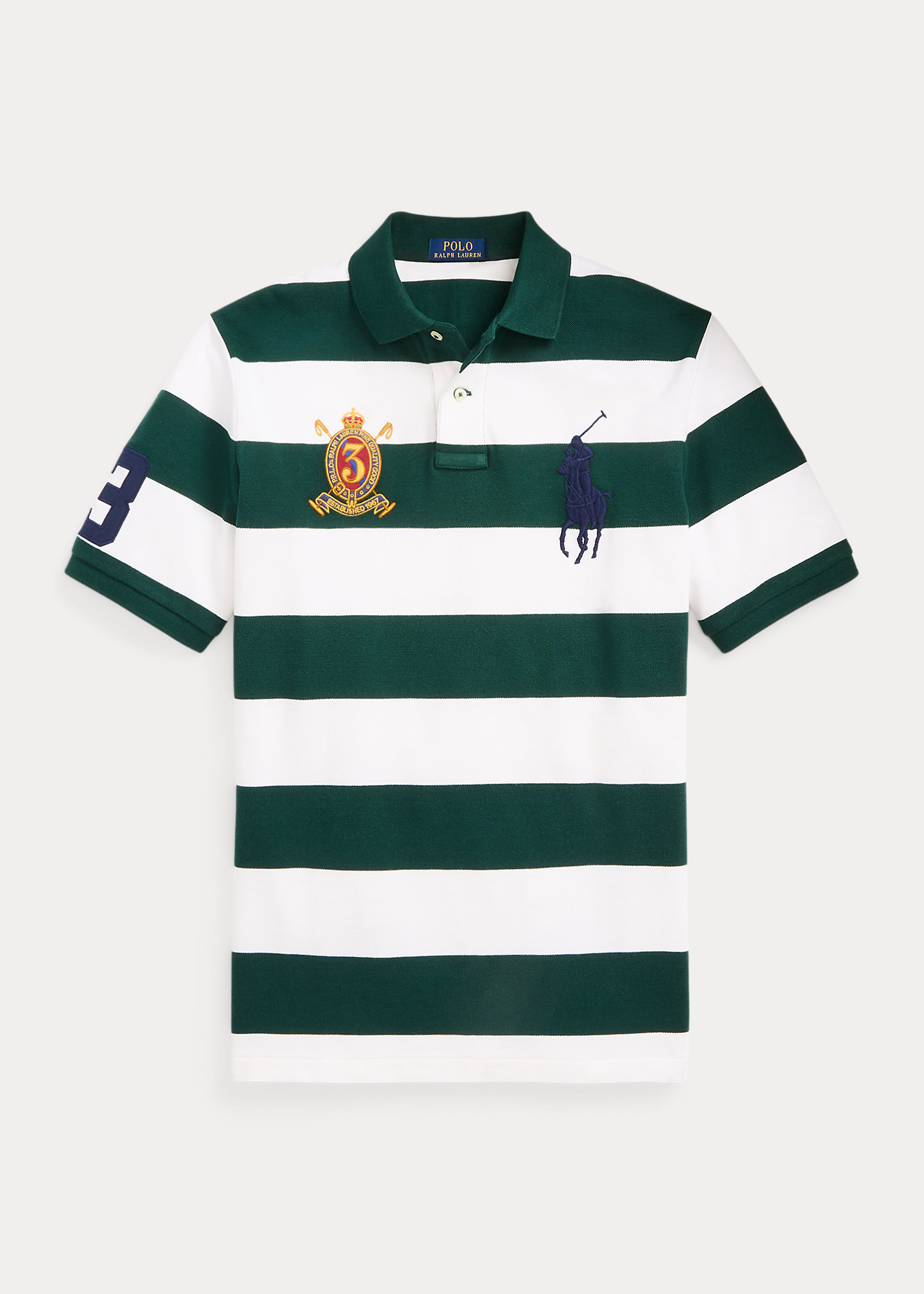 - “P.R.L. Co. Ralph Lauren Fine Quality Goods,” “Established 1967,” “3,” two crossed mallets, and a crown embroidered at the right chest. Even vented hem.