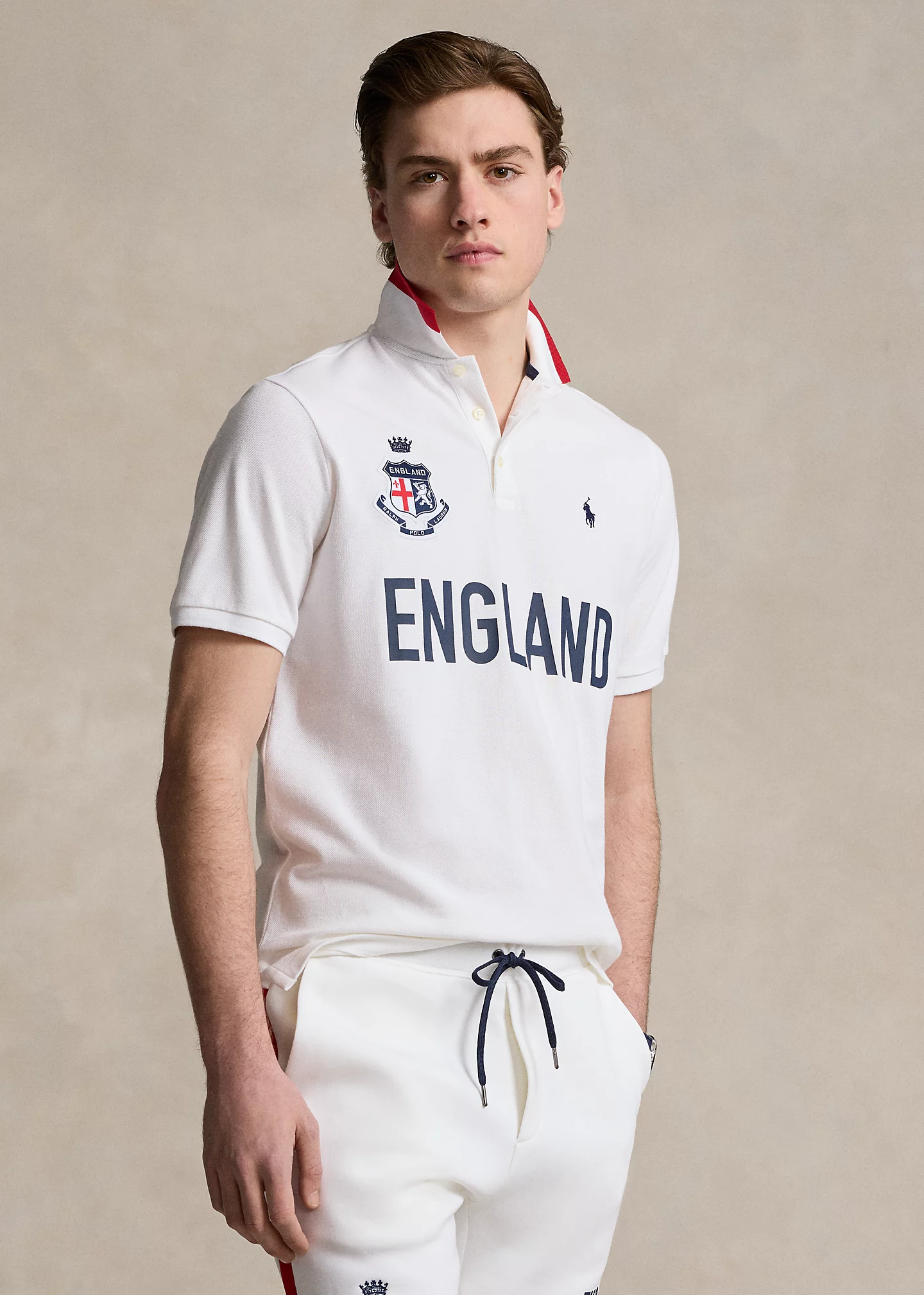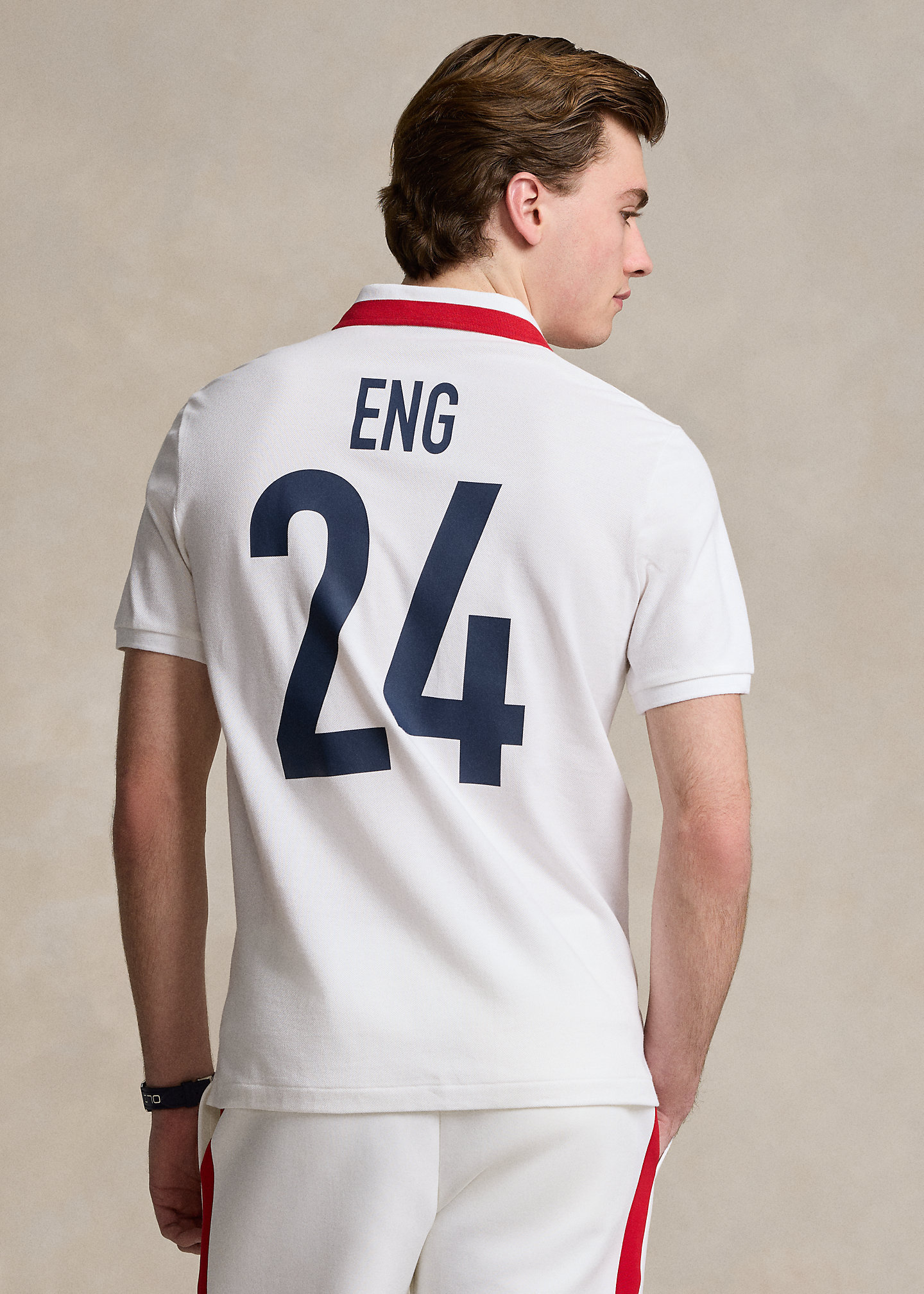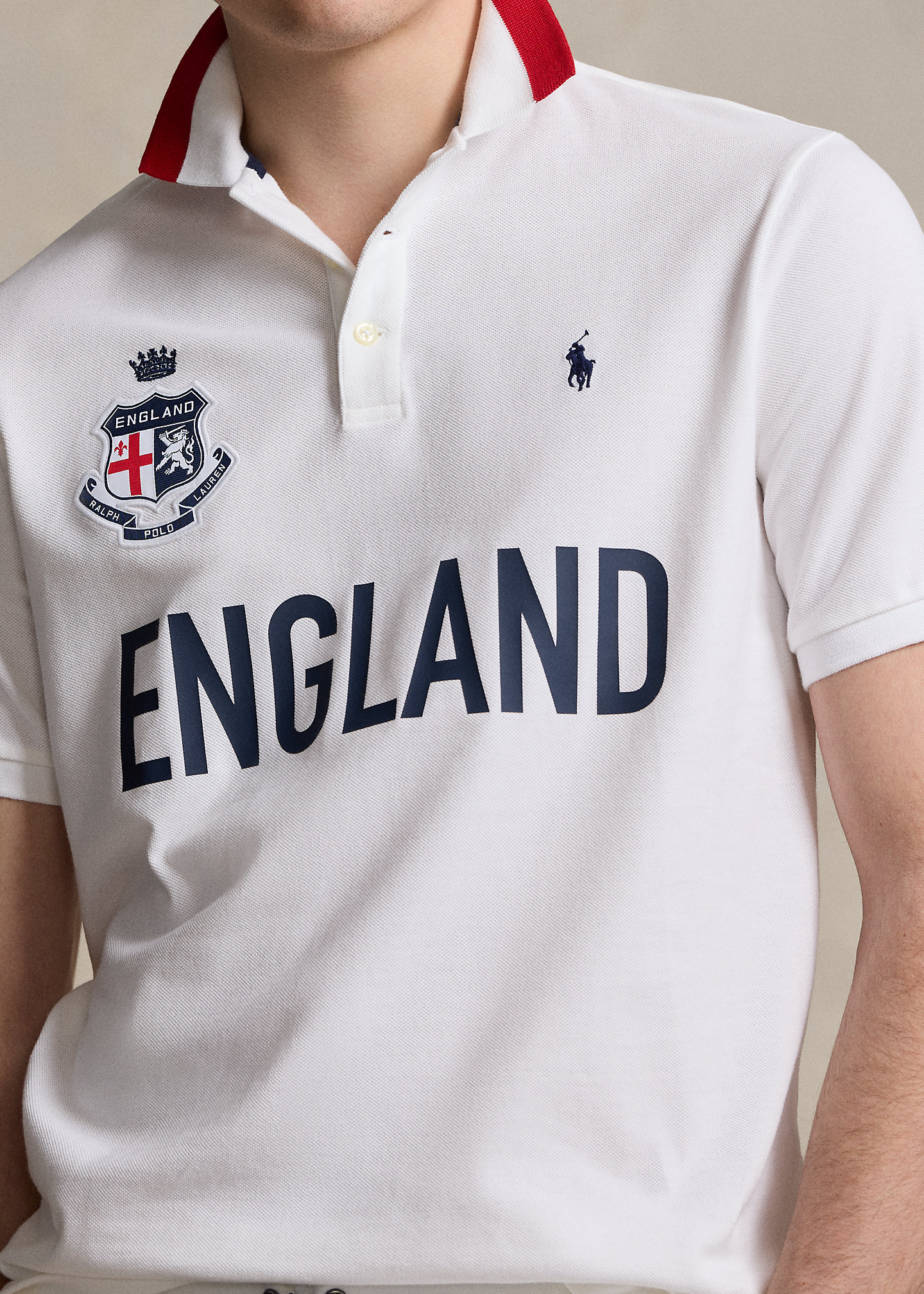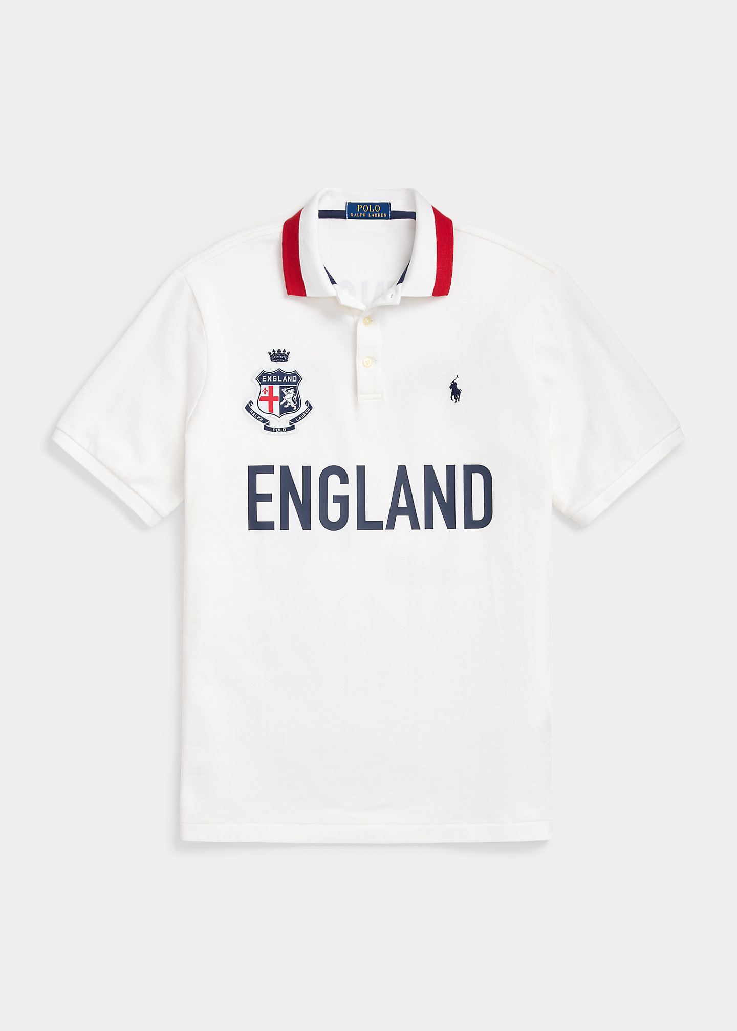 - “England” shield patch with a “Polo Ralph Lauren” banner and crown embroidery at the right chest. “England” printed at the center front. “ENG 24” printed at the center-back. Even vented hem.