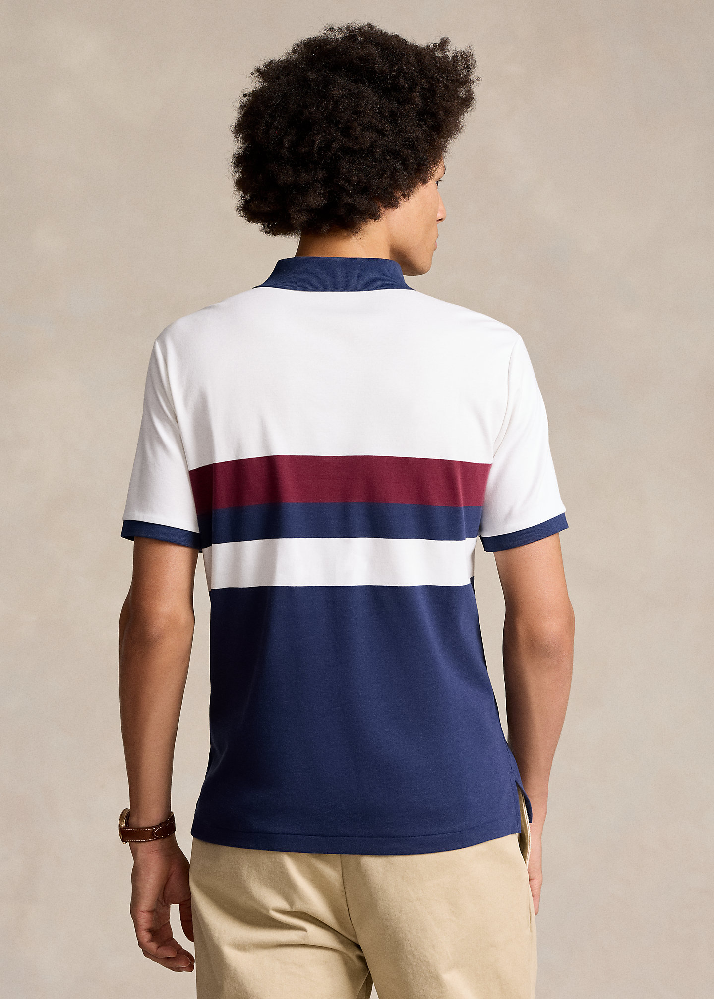 - Ribbed Polo collar. Three-button placket.