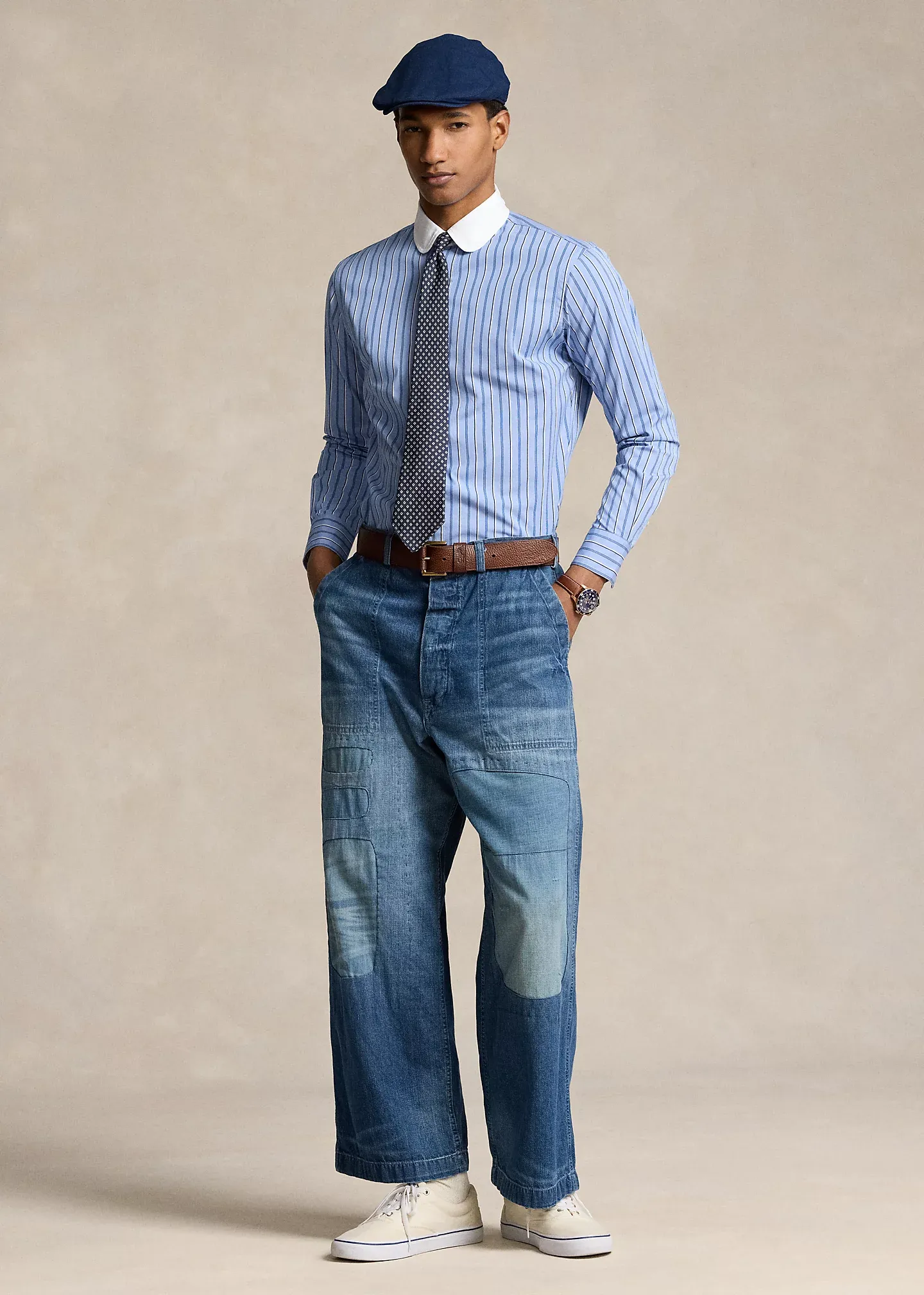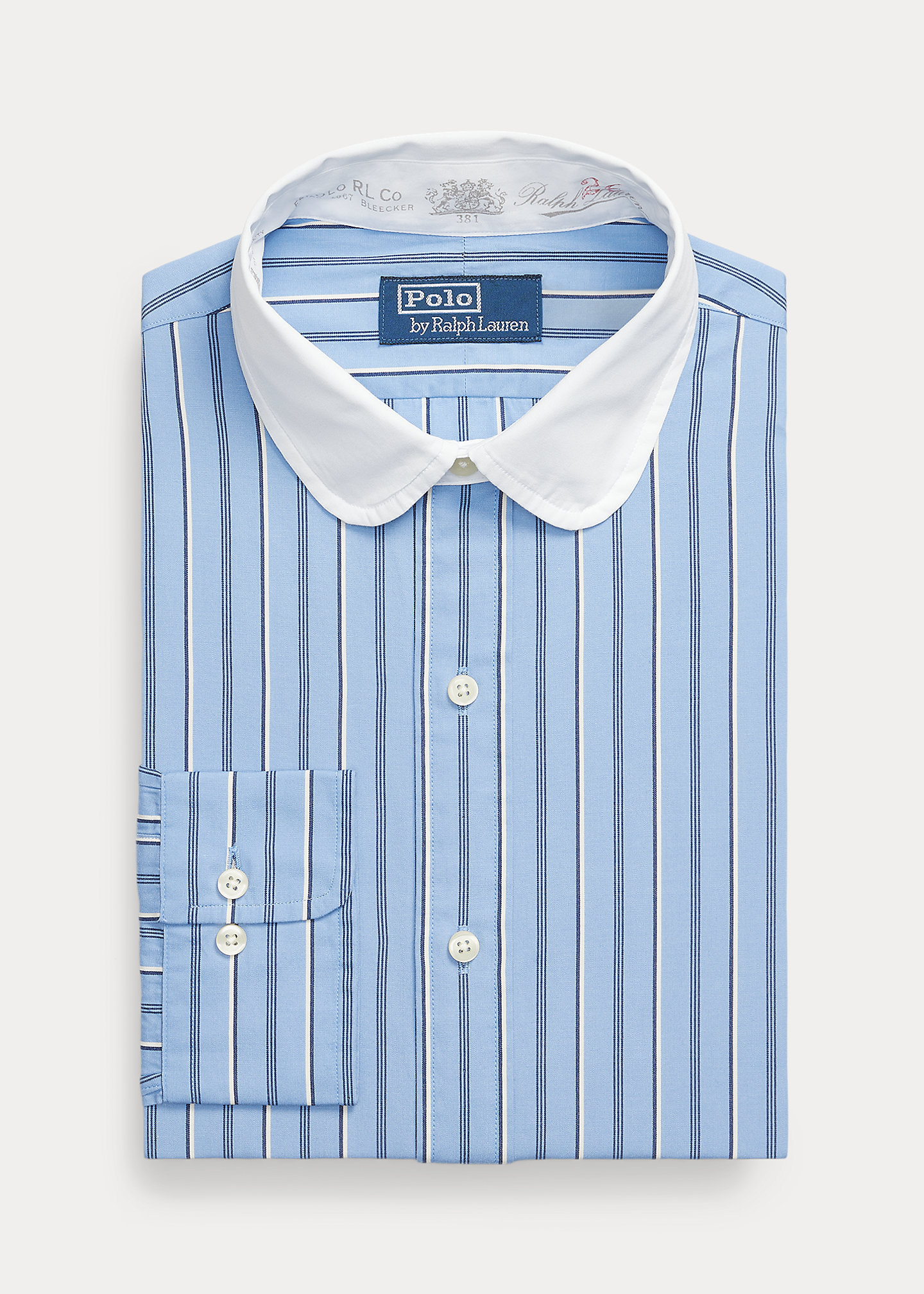 - Contrasting club collar. Buttoned placket. Last buttonhole is stitched horizontally for a superior hold.