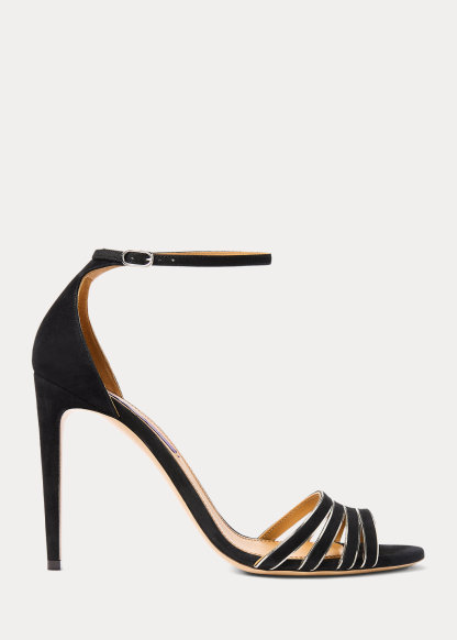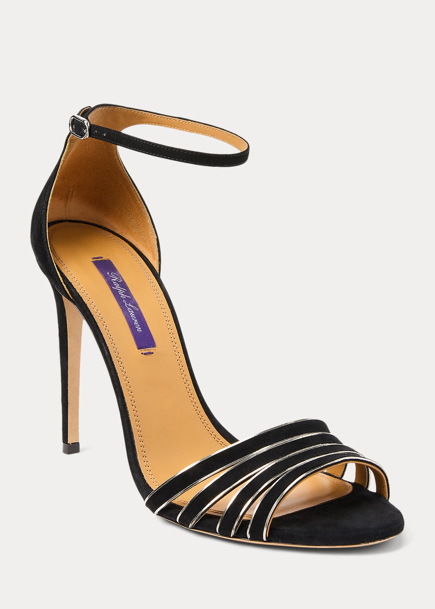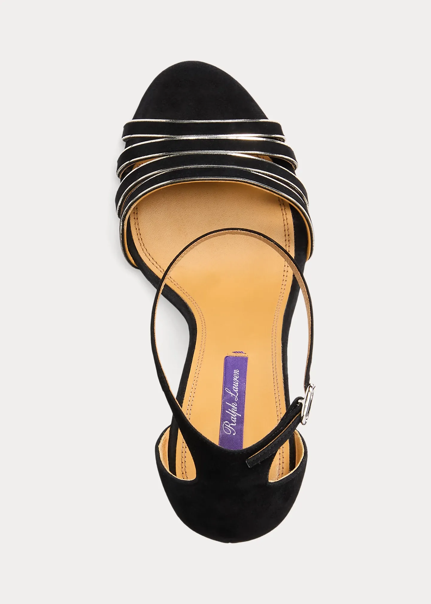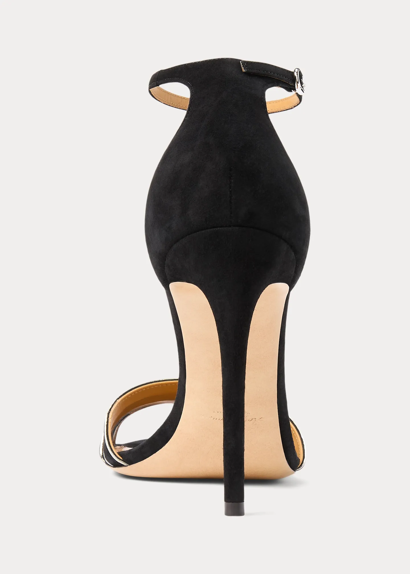 - Buckled ankle strap. Oval-shaped, silver-tone brass buckle.