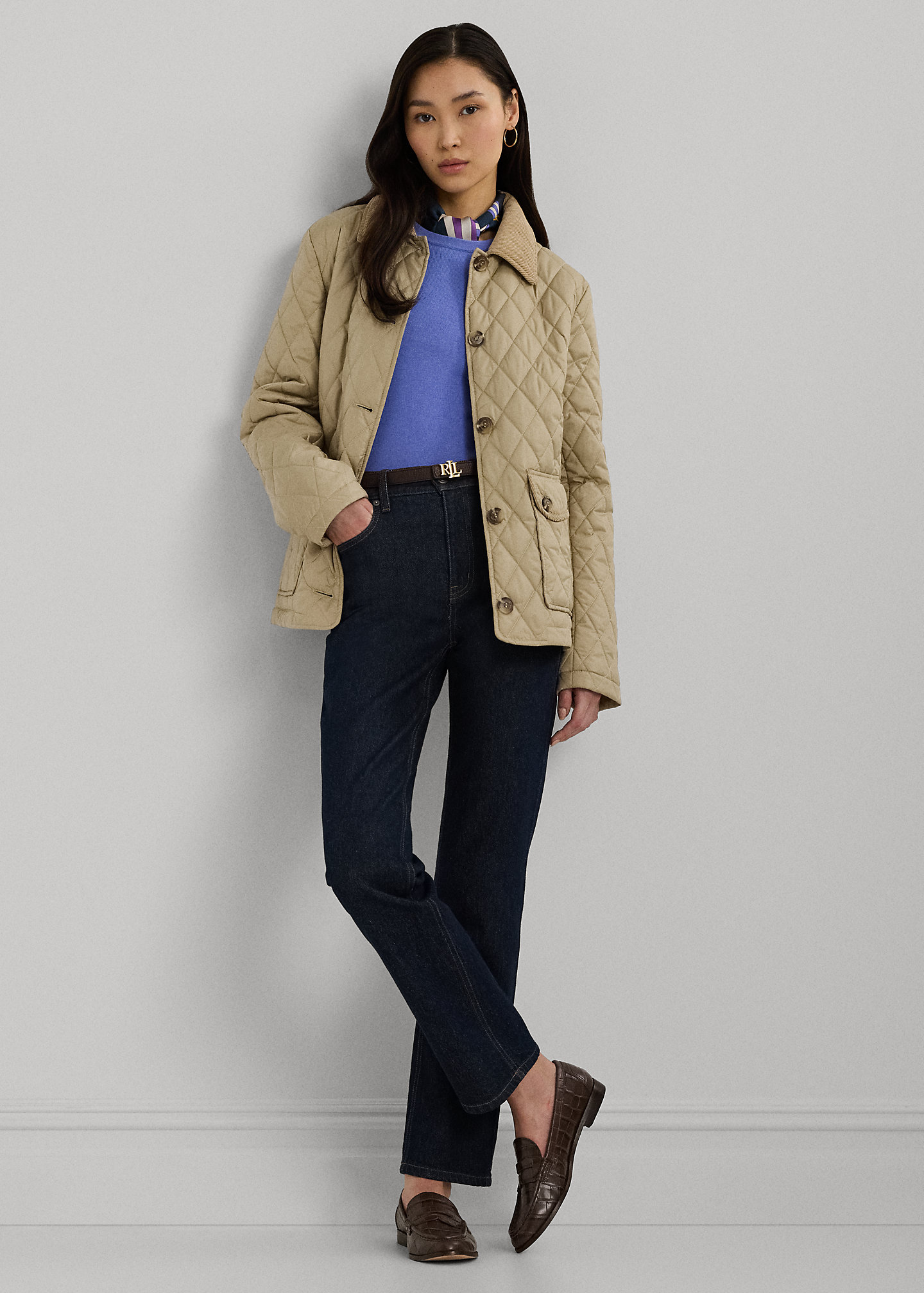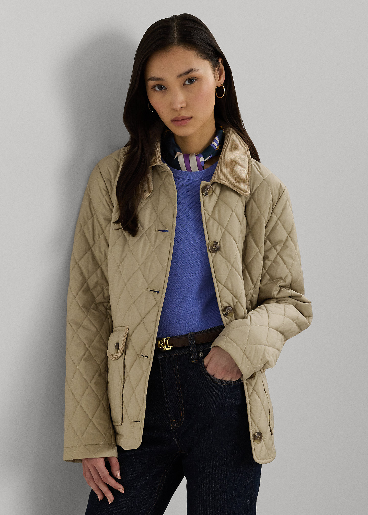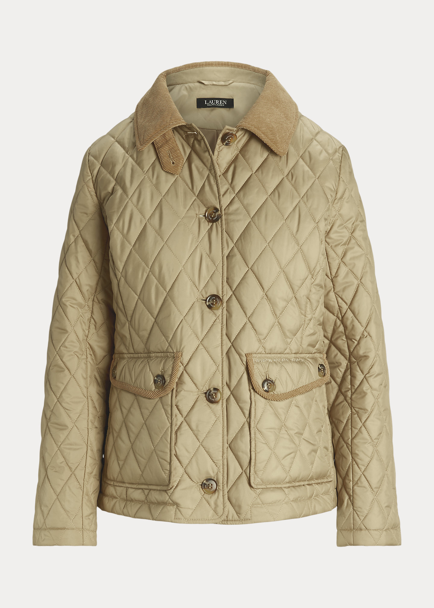 - Corduroy spread collar with a buttoned throatlatch. Buttoned placket. “Lauren Ralph Lauren”–engraved horn-effect buttons.