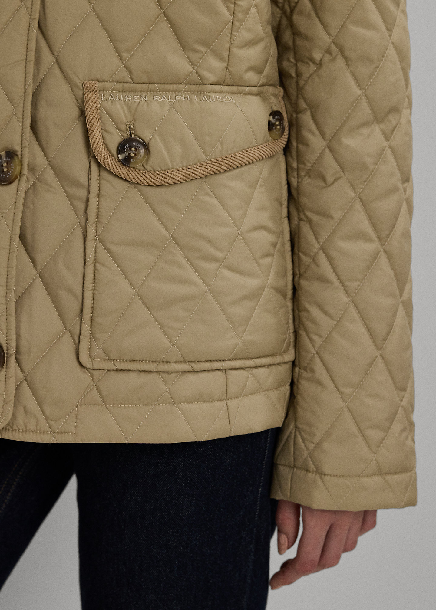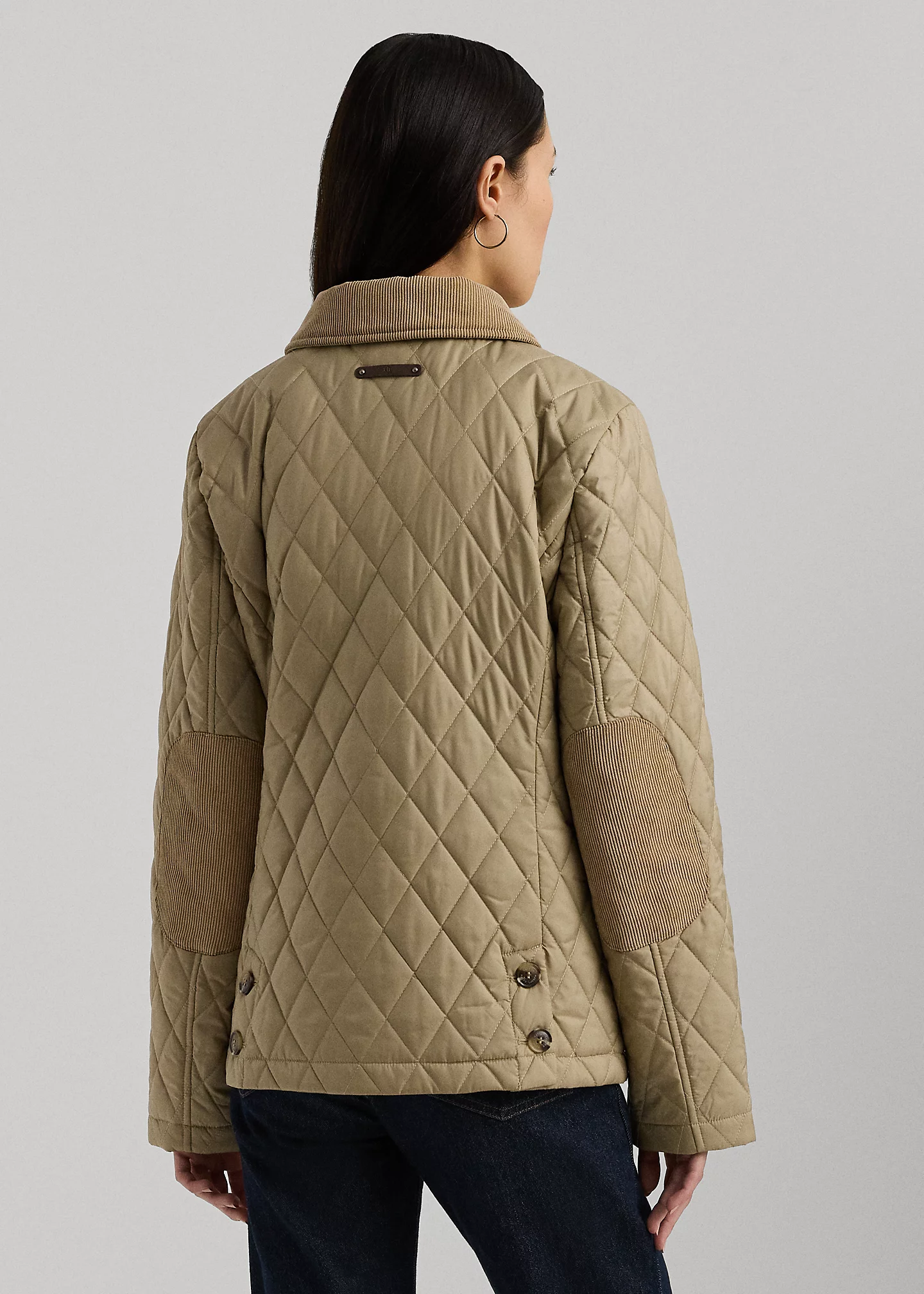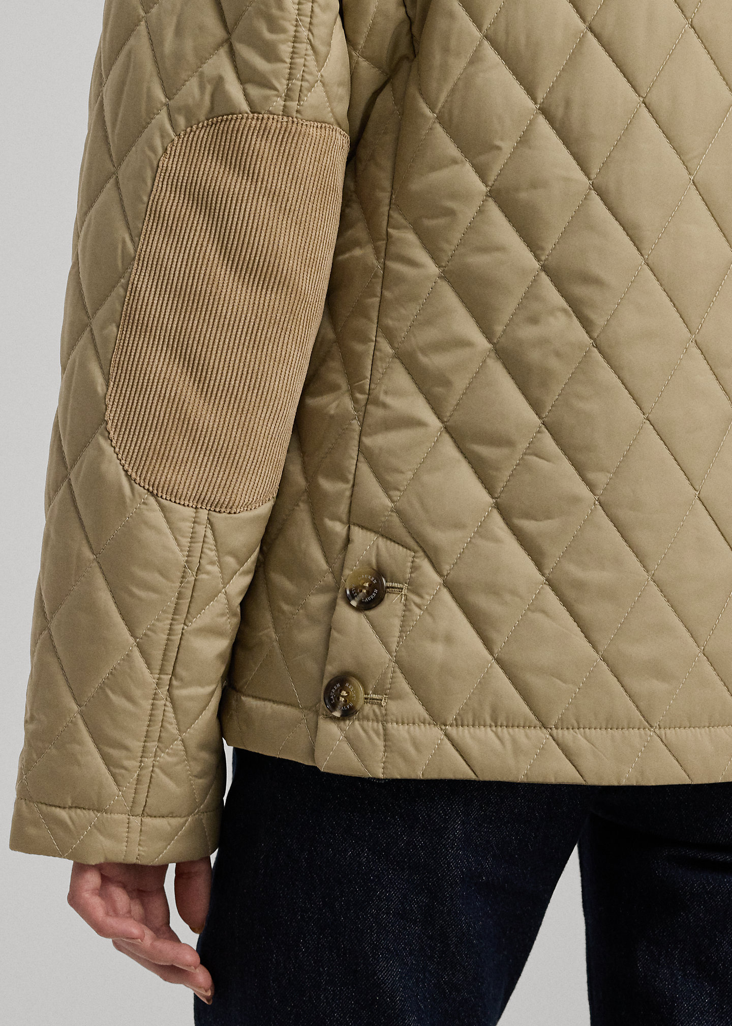 - Long sleeves. Corduroy elbow patches. Two front waist buttoned-flap patch pockets. Tonal “Lauren Ralph Lauren”–embroidered logo at the left pocket flap.