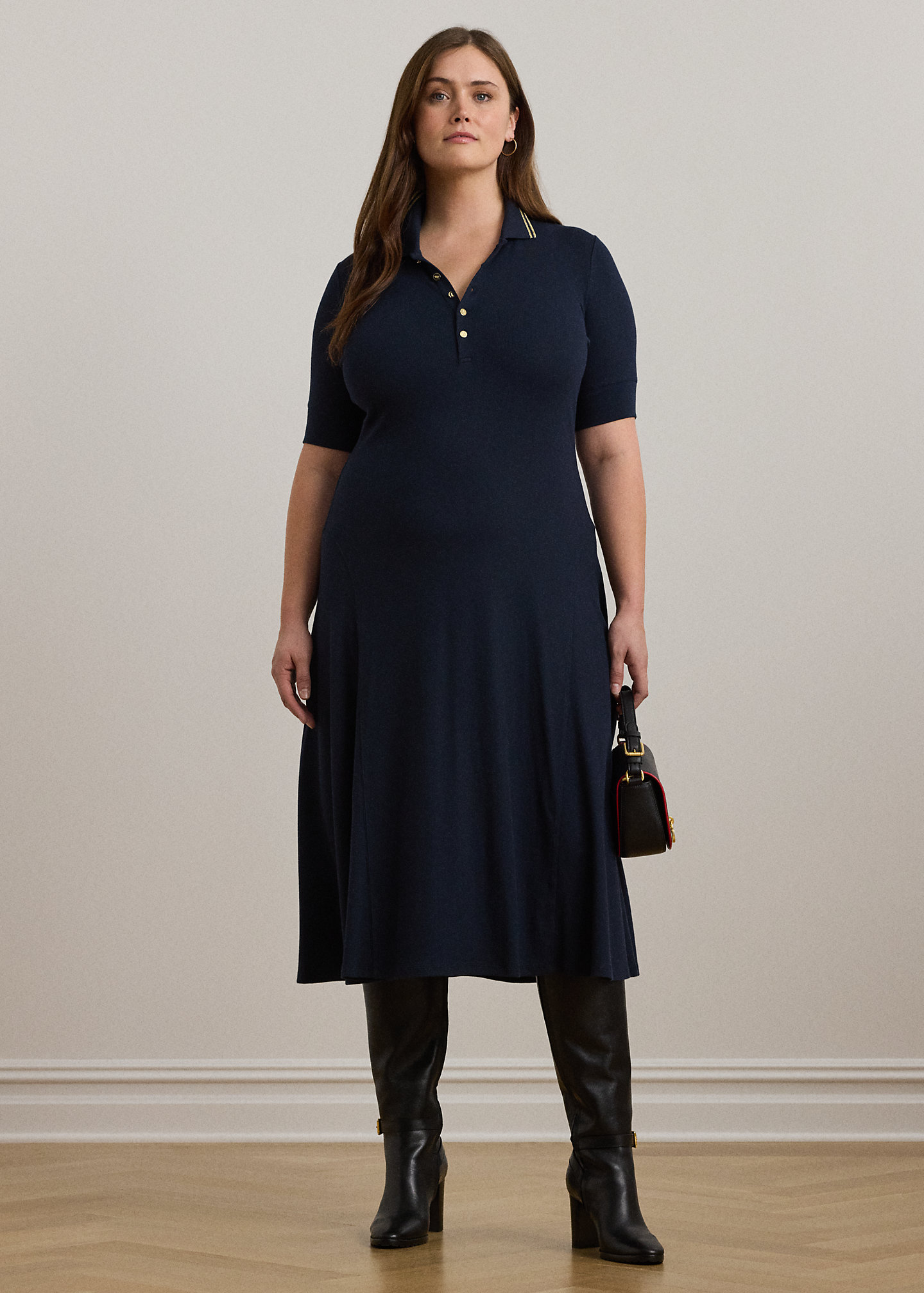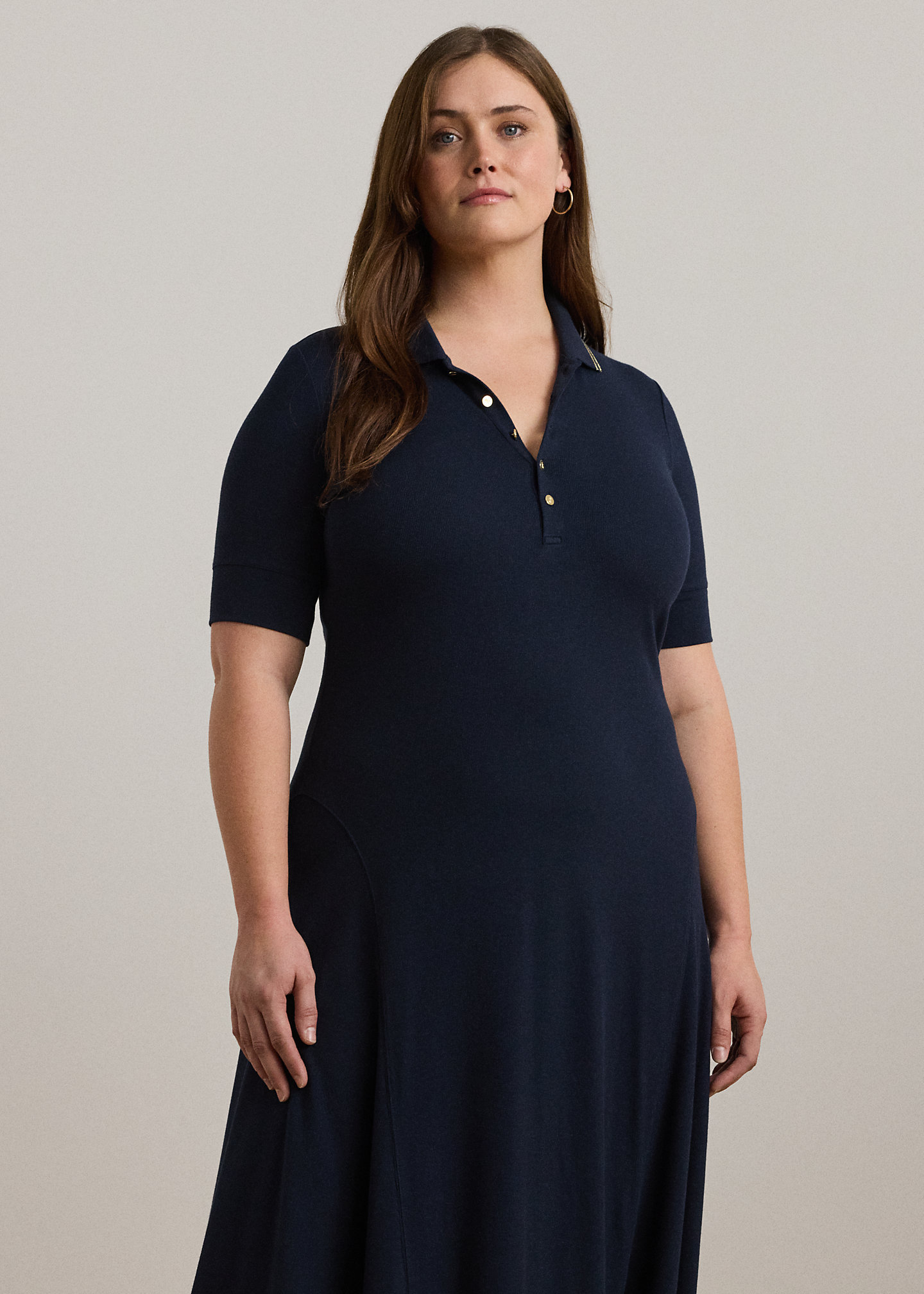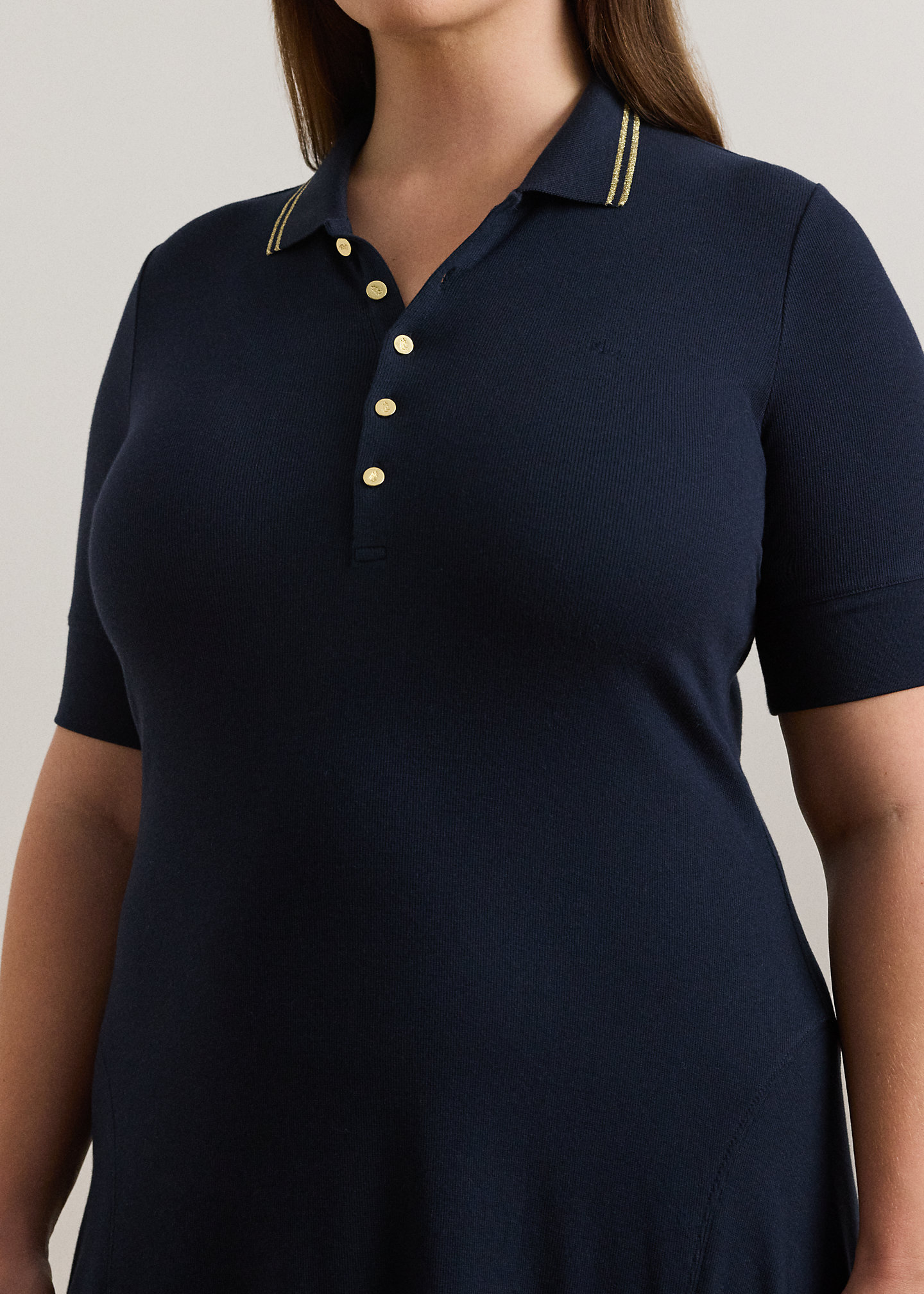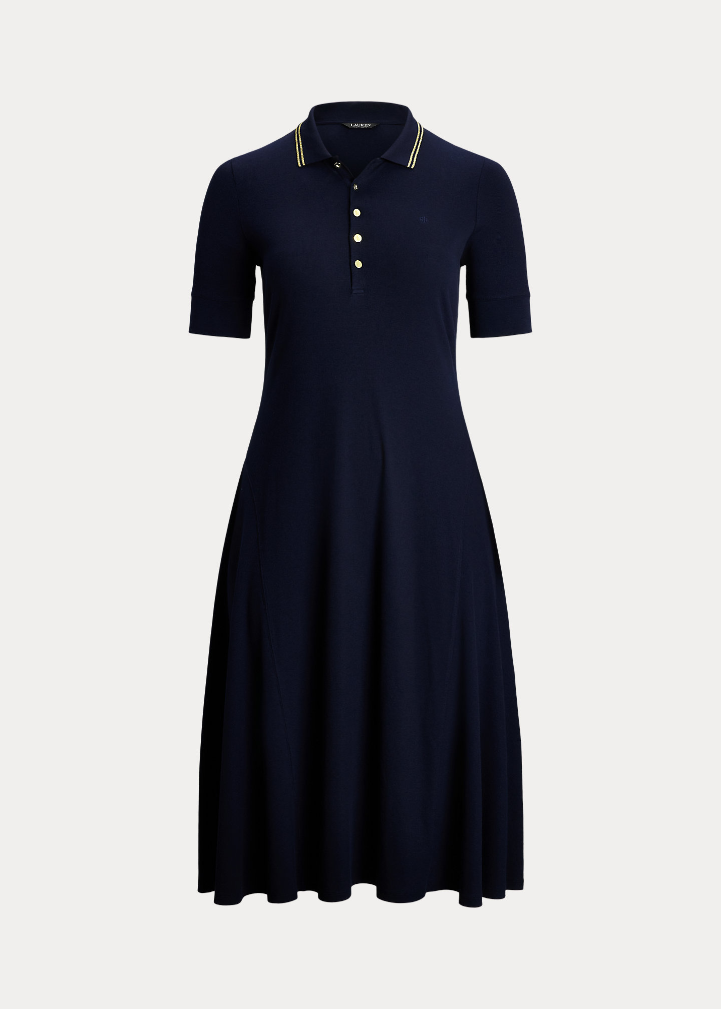 - Ribbed Polo collar. Buttoned quarter-placket. “LRL”-engraved metal buttons.