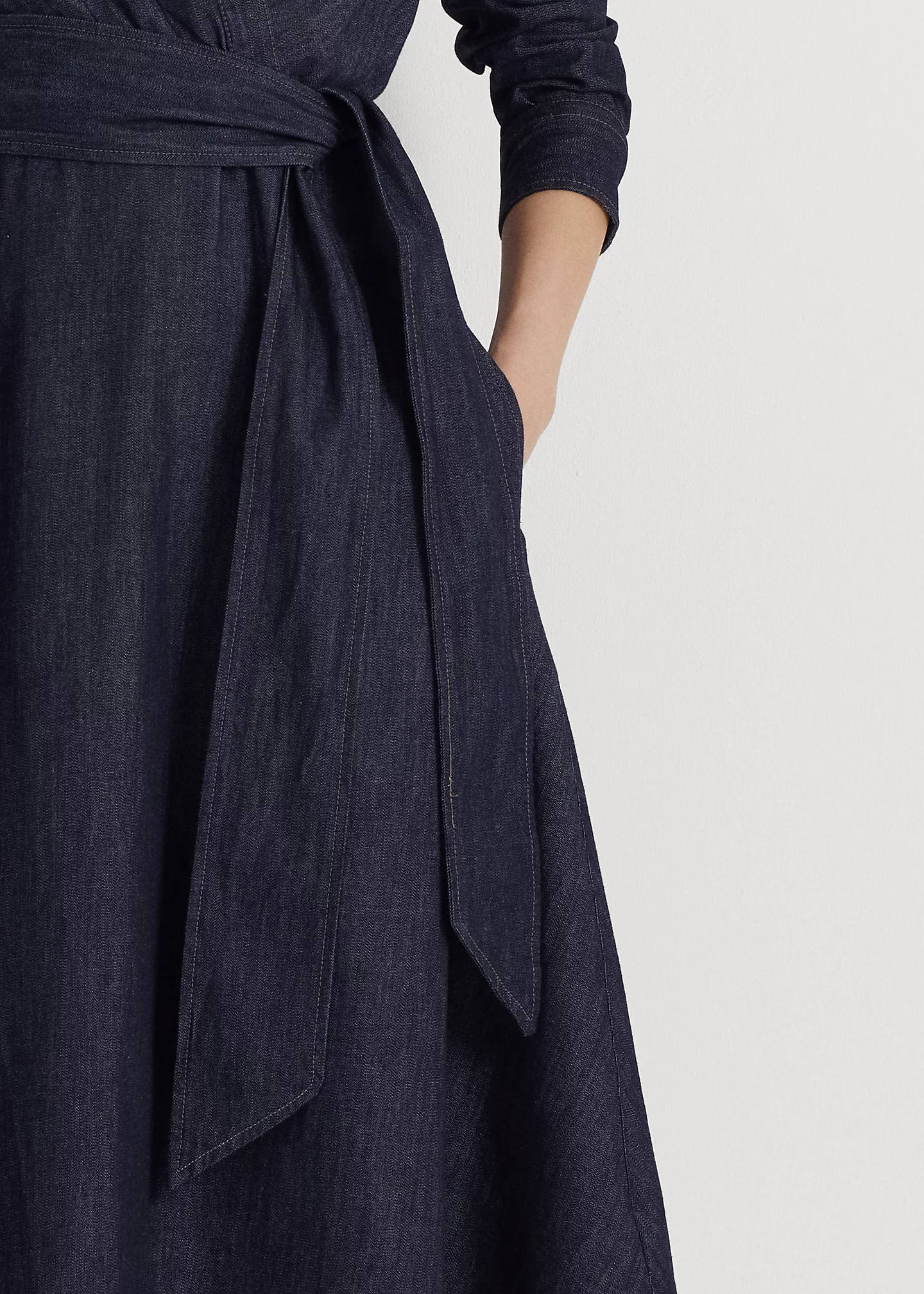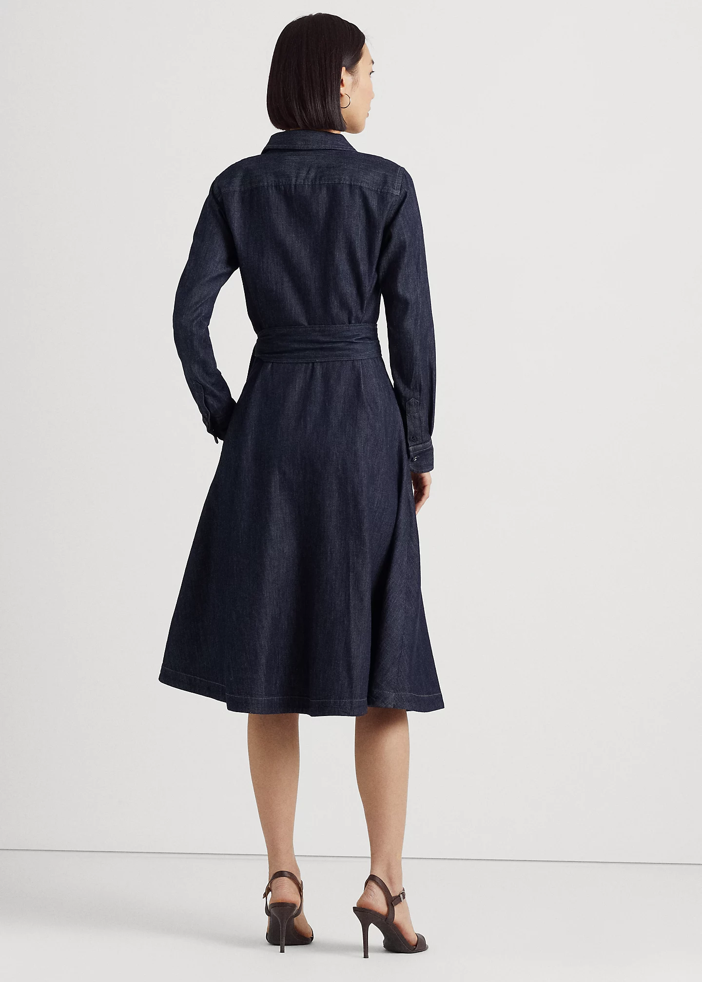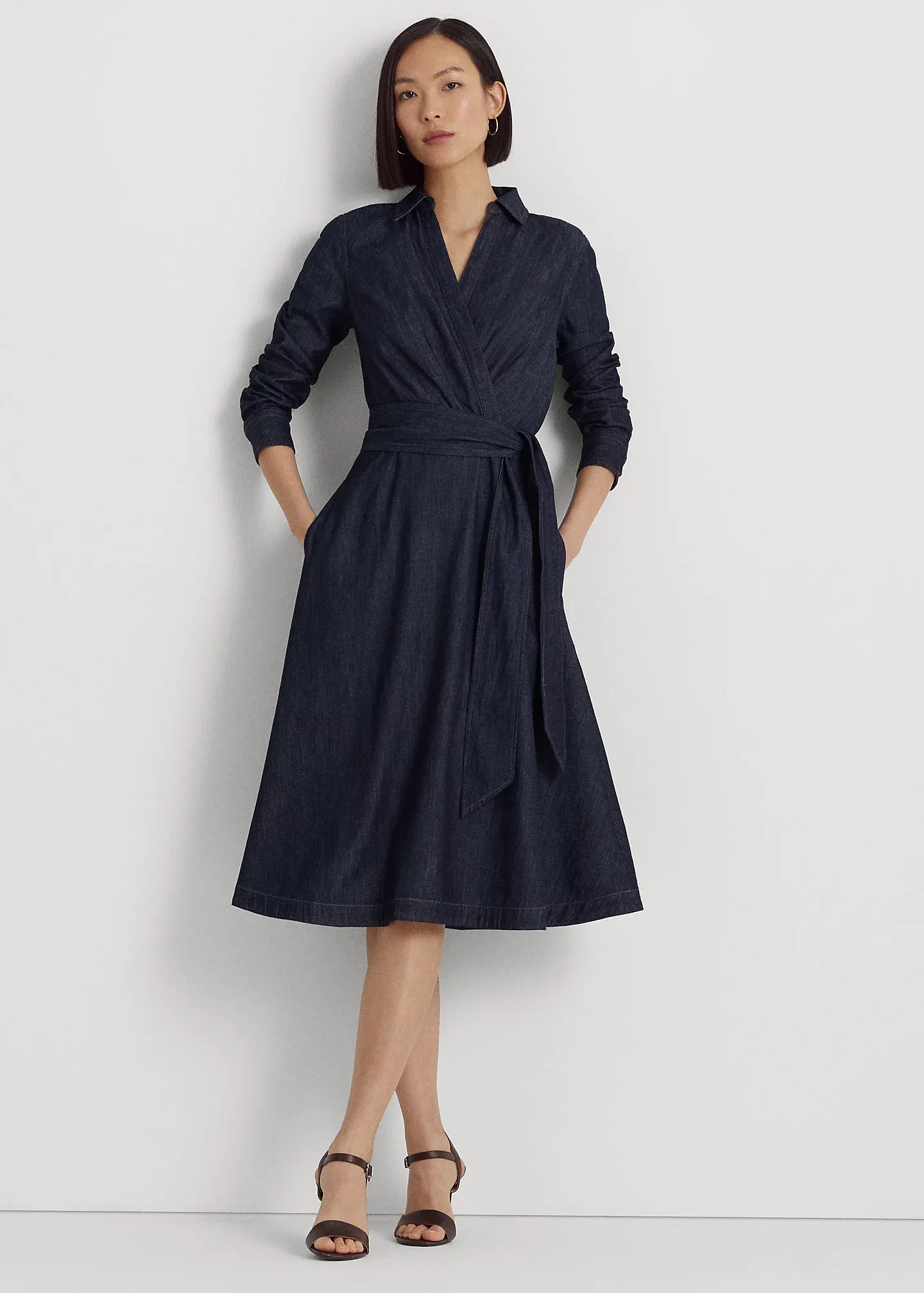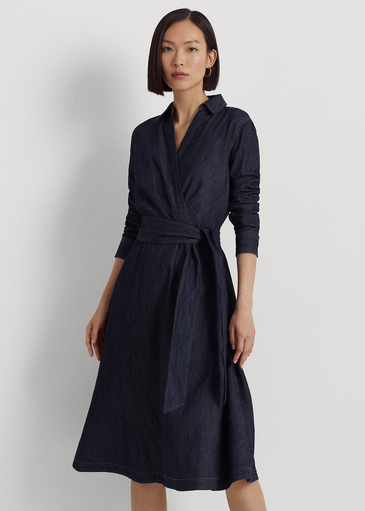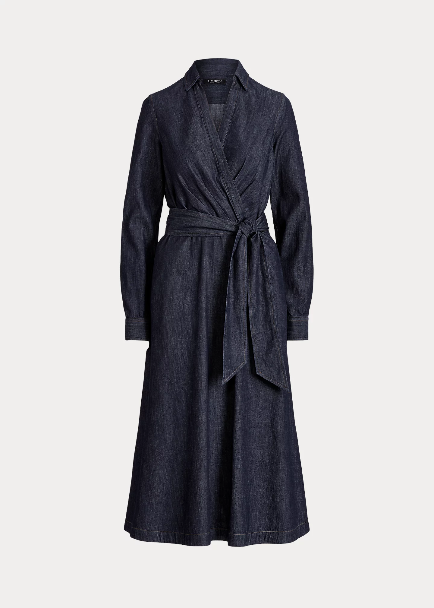 - Long sleeves with buttoned barrel cuffs. "LRL"-engraved buttons. Side on-seam pockets. Faux-wrap bodice. Back waist darts. Threaded belt loops. Comes with a removable self-belt.