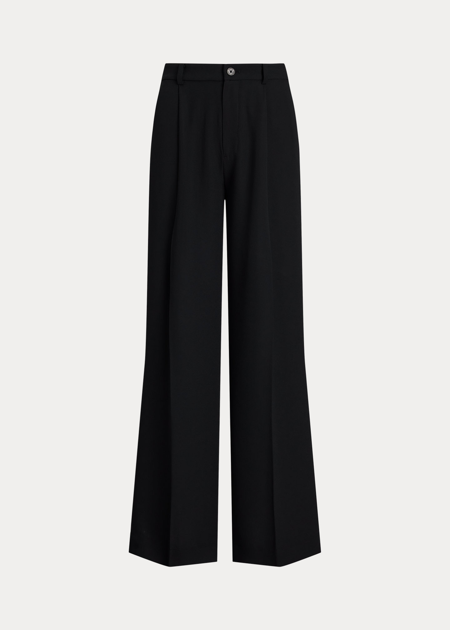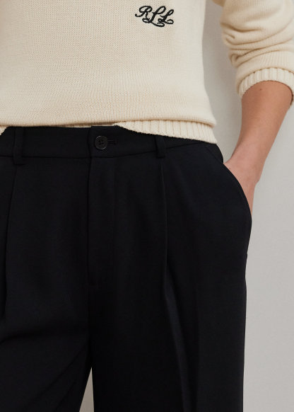 - Pleating at the front waist. Creases run down the front and back of each leg.