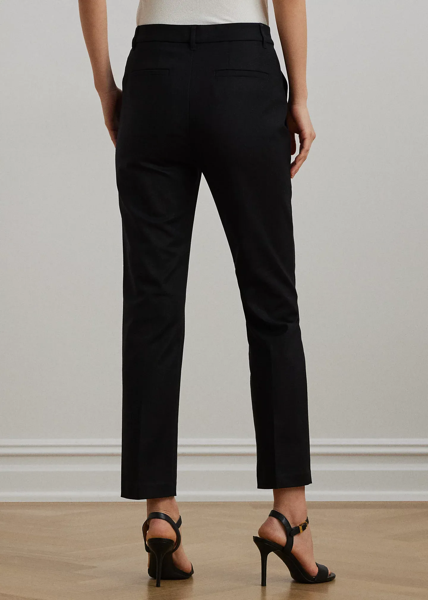 - Two front angled pockets. Back waist welt pockets. Back waist darts. Creases run down the front and back of each leg.