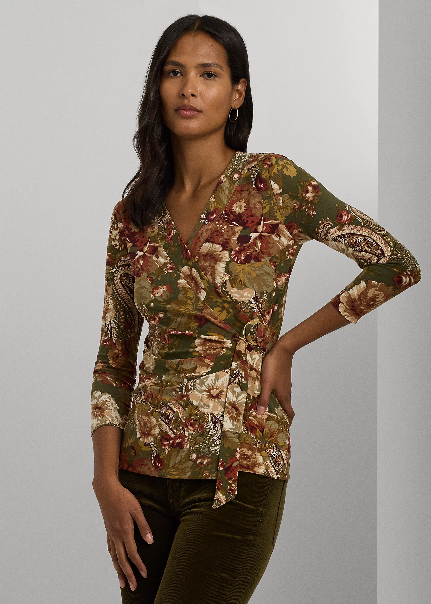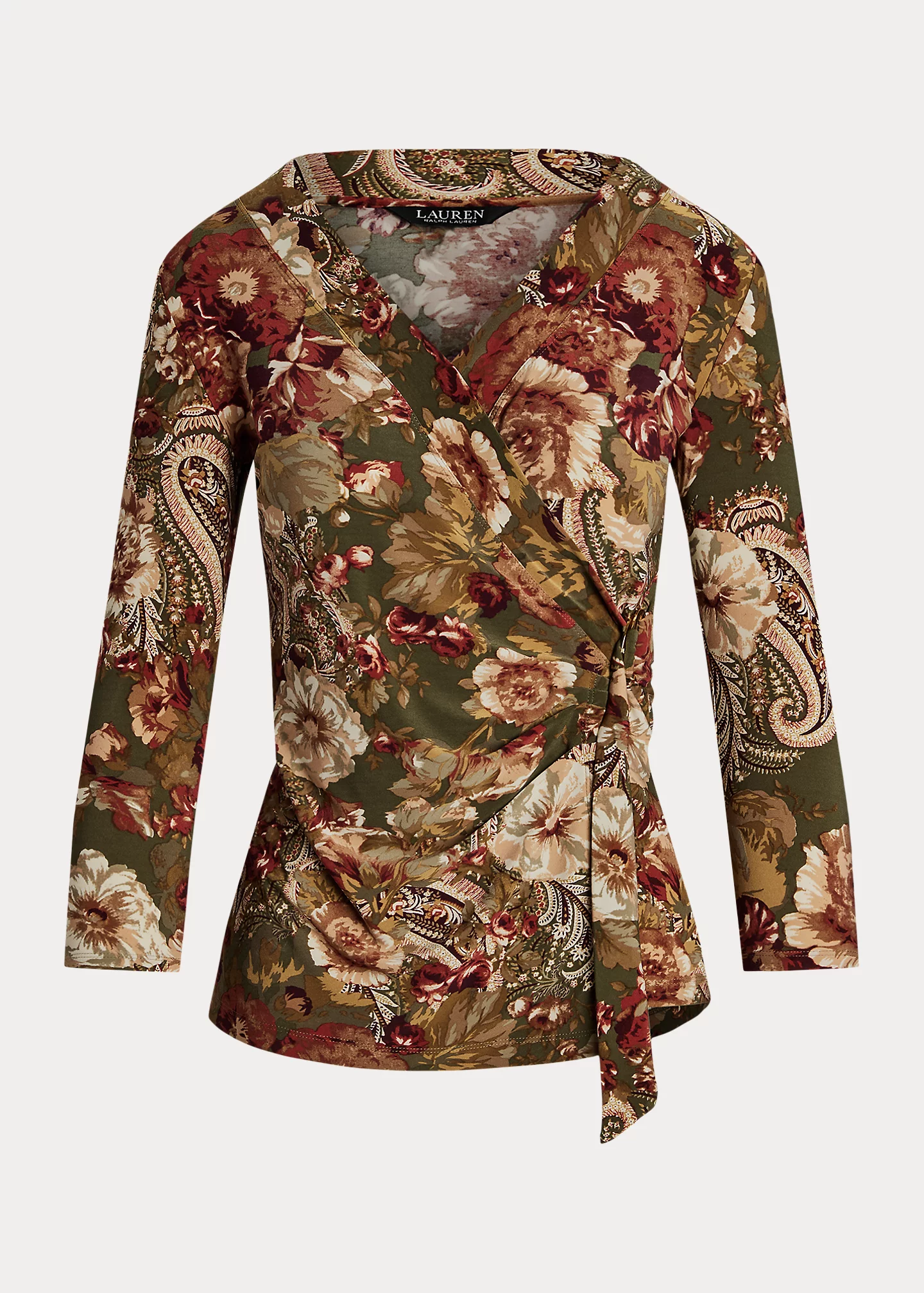 - Surplice neckline. Faux-wrap overlay with a self-tie closure at the left waist. “LRL”-engraved metal D-ring.