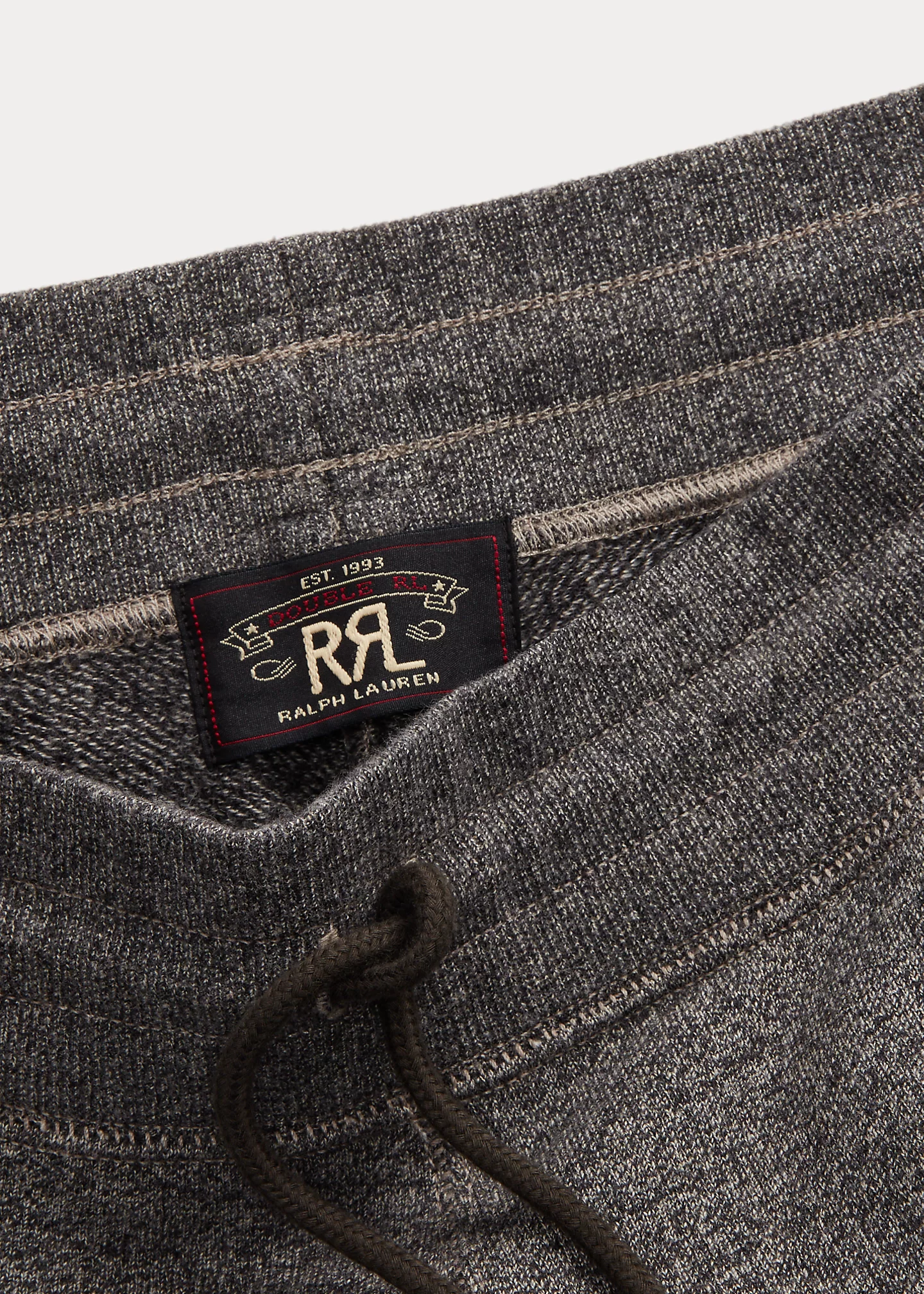 - Ribbed drawstring waistband. “RRL & Company Sporting Supplies New York” and a winged-logo label at the back waist.
