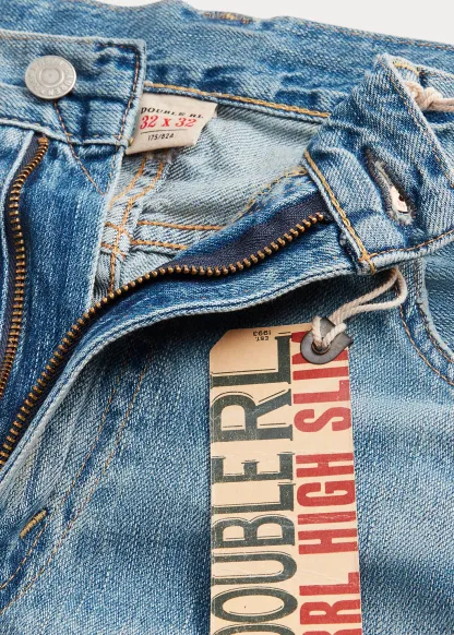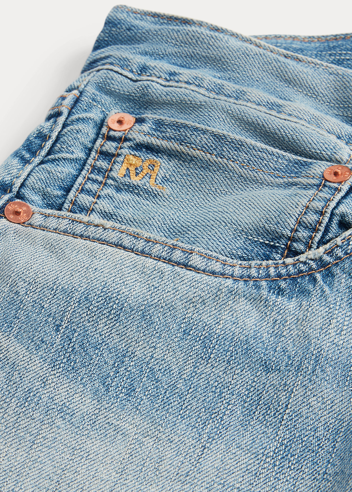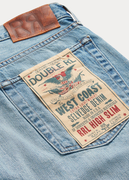 - American-made buttons, rivets, and washer burrs. Five-pocket styling. “RRL” embroidery at the coin pocket. Natural twill pocket lining.