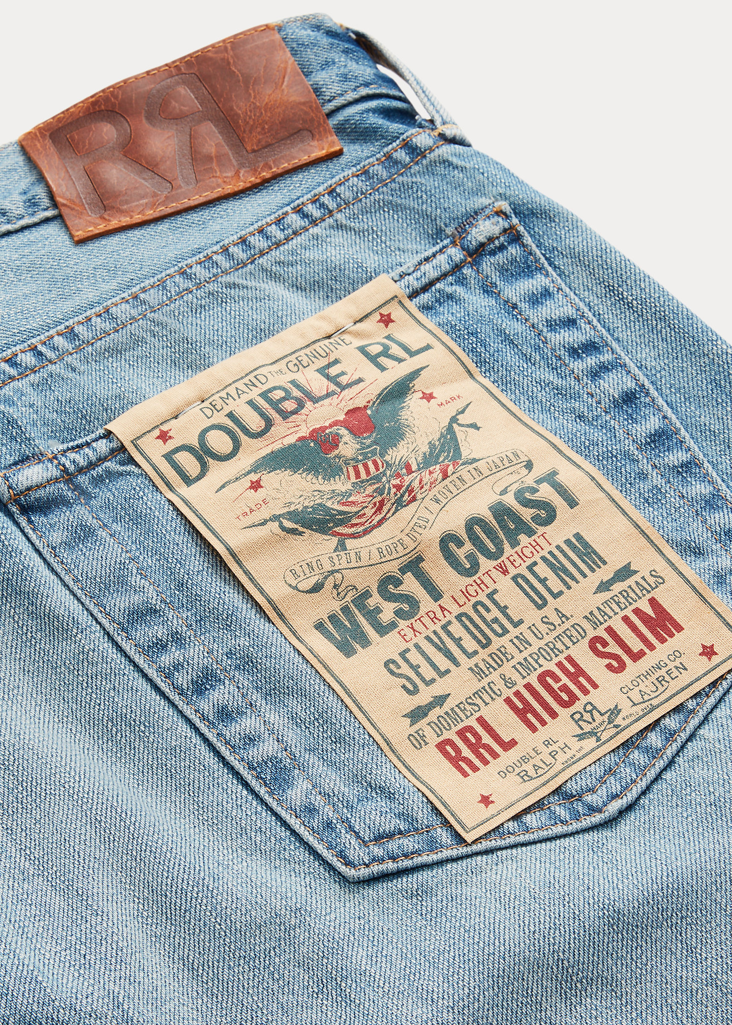 - Leather “RRL”-debossed logo label at the back right waist.