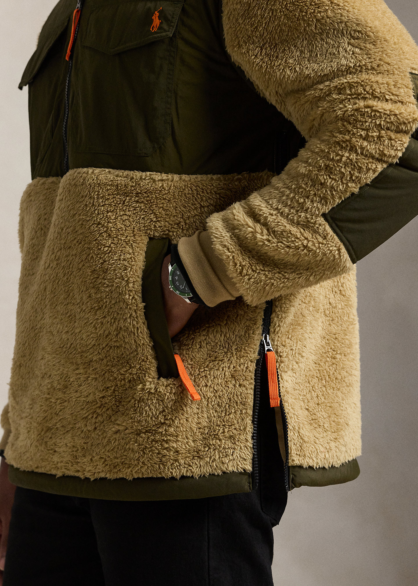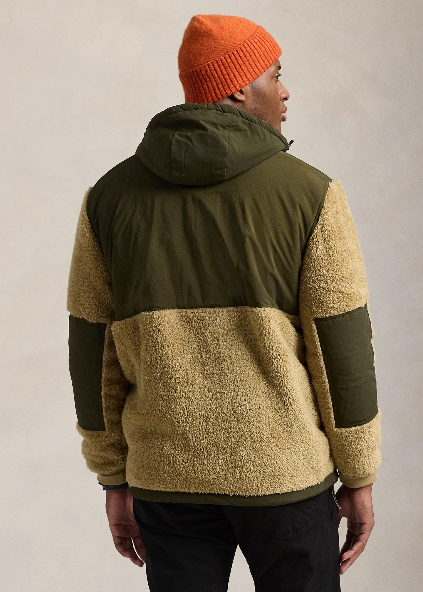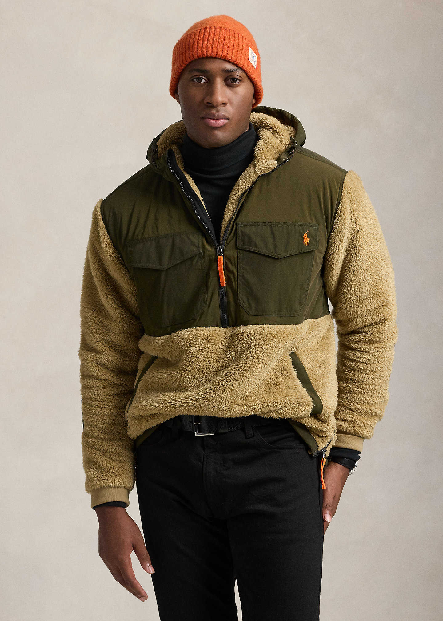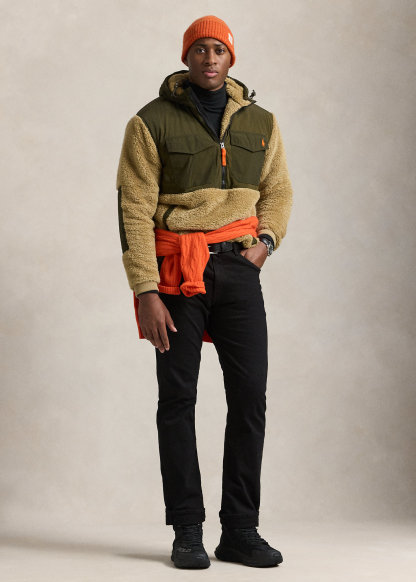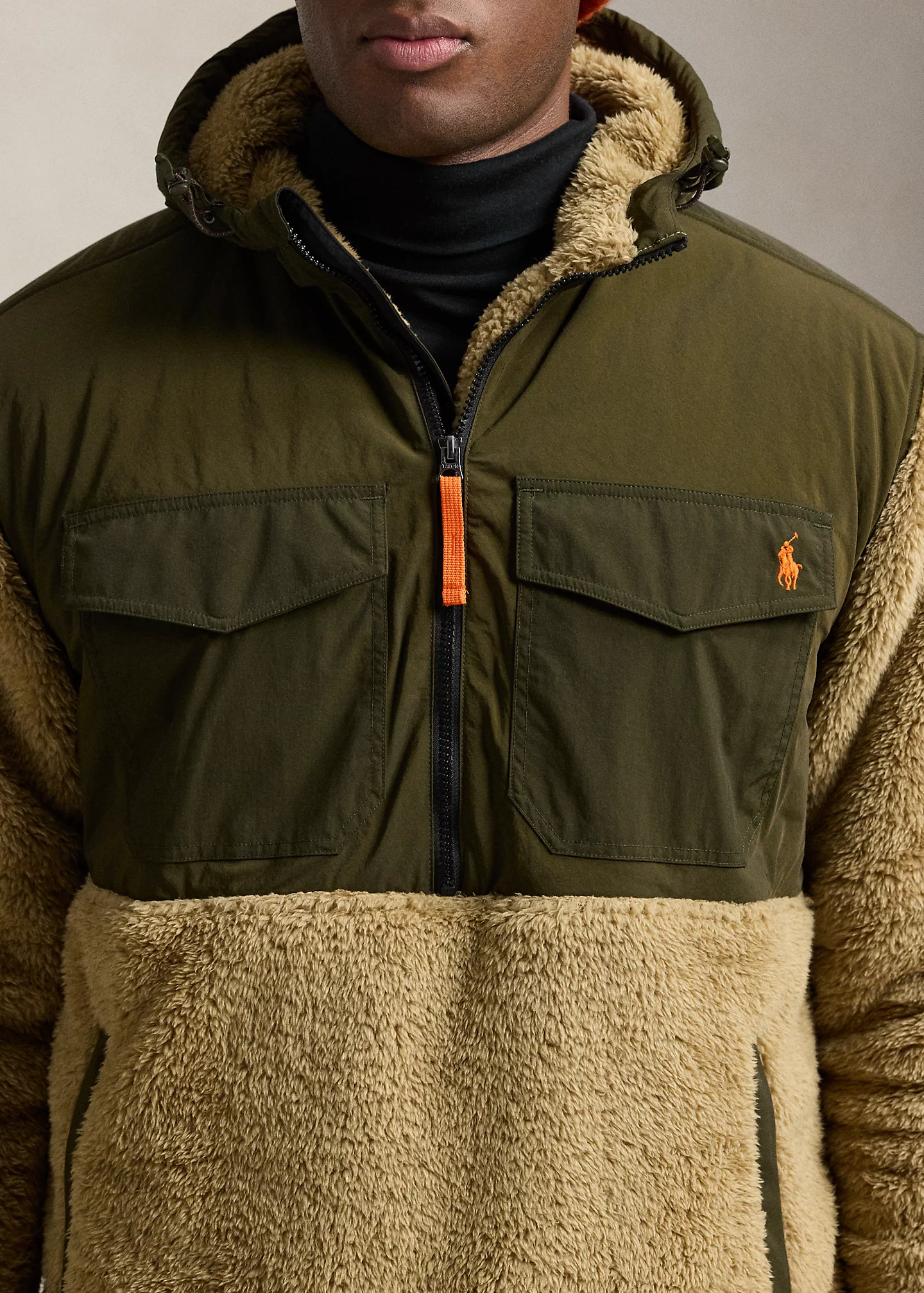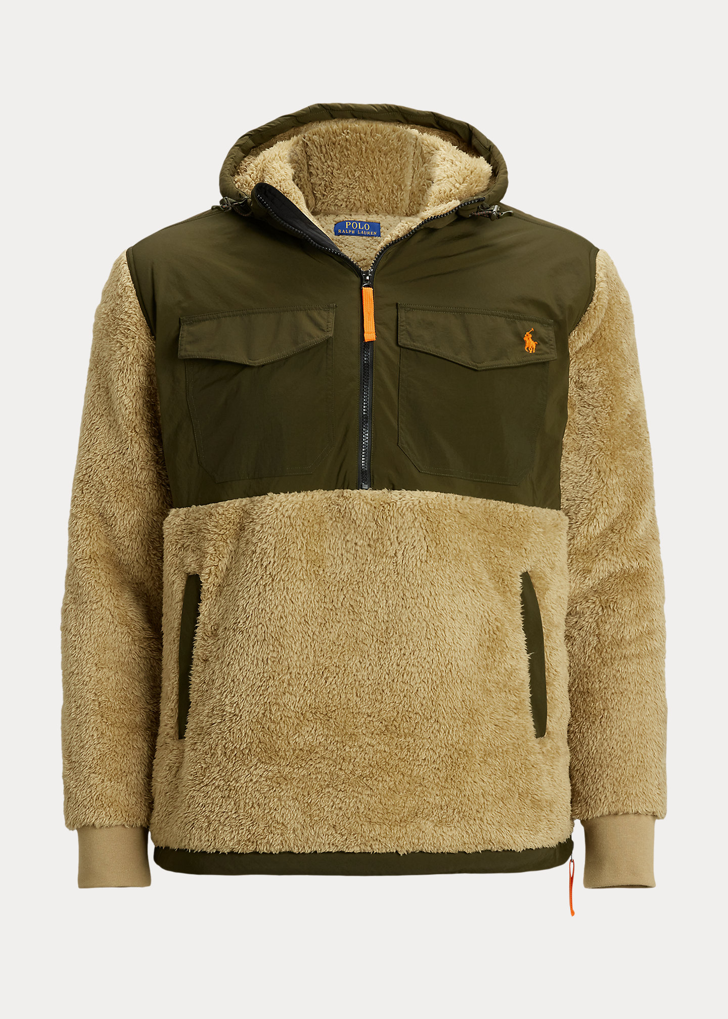 - Drawcord hood. Half-zip placket with a flap at the top that prevents chafing. Woven overlay at the hood and upper body.