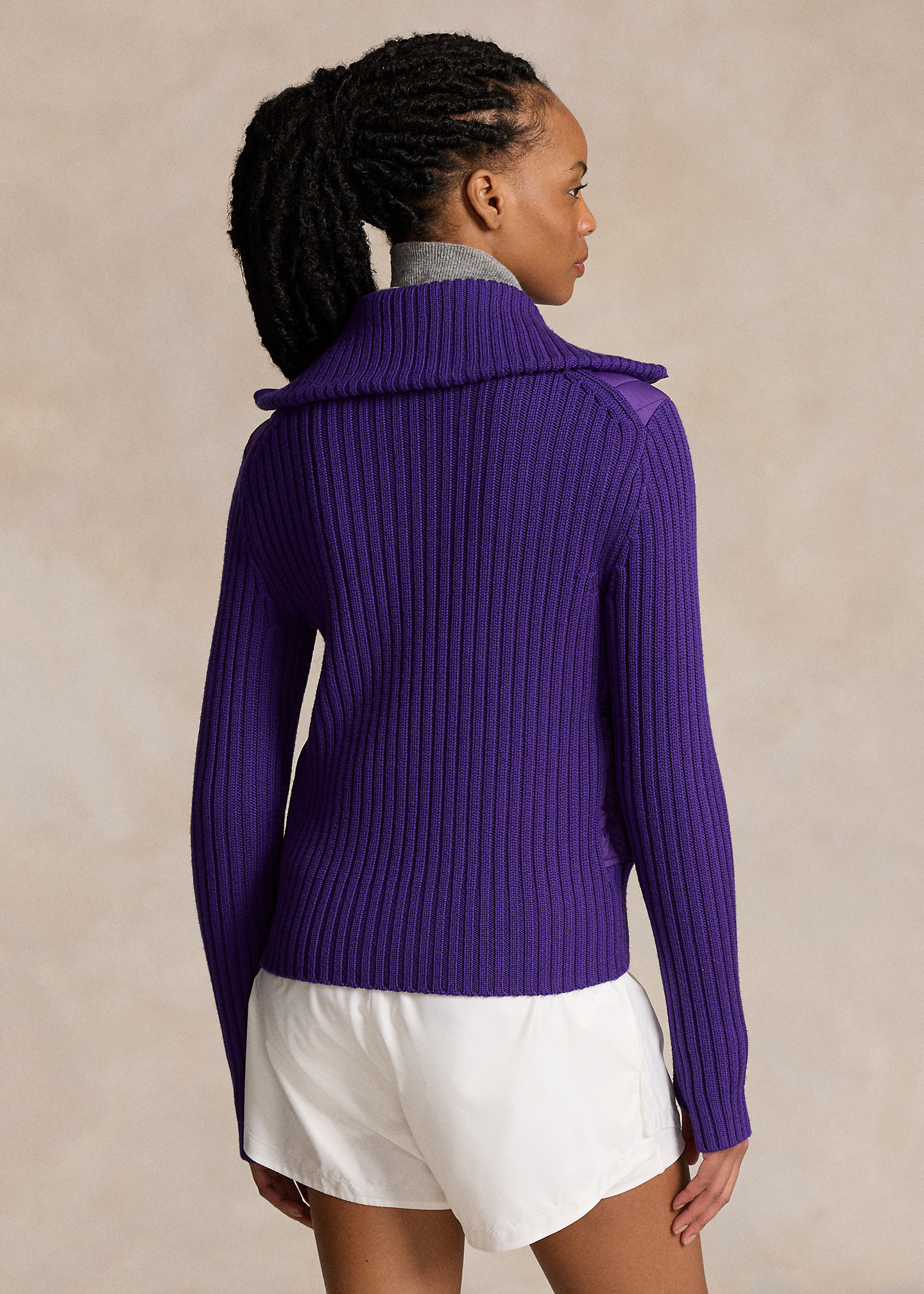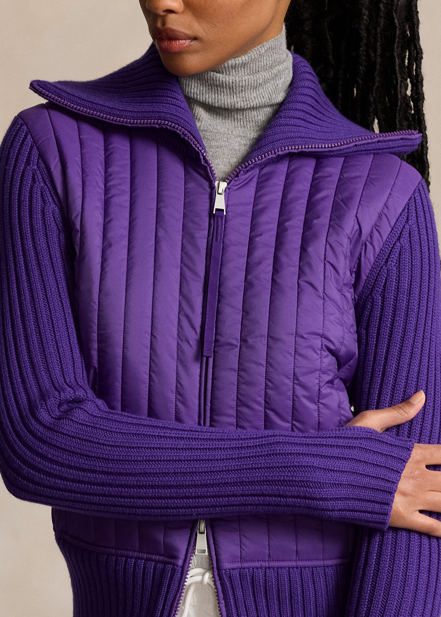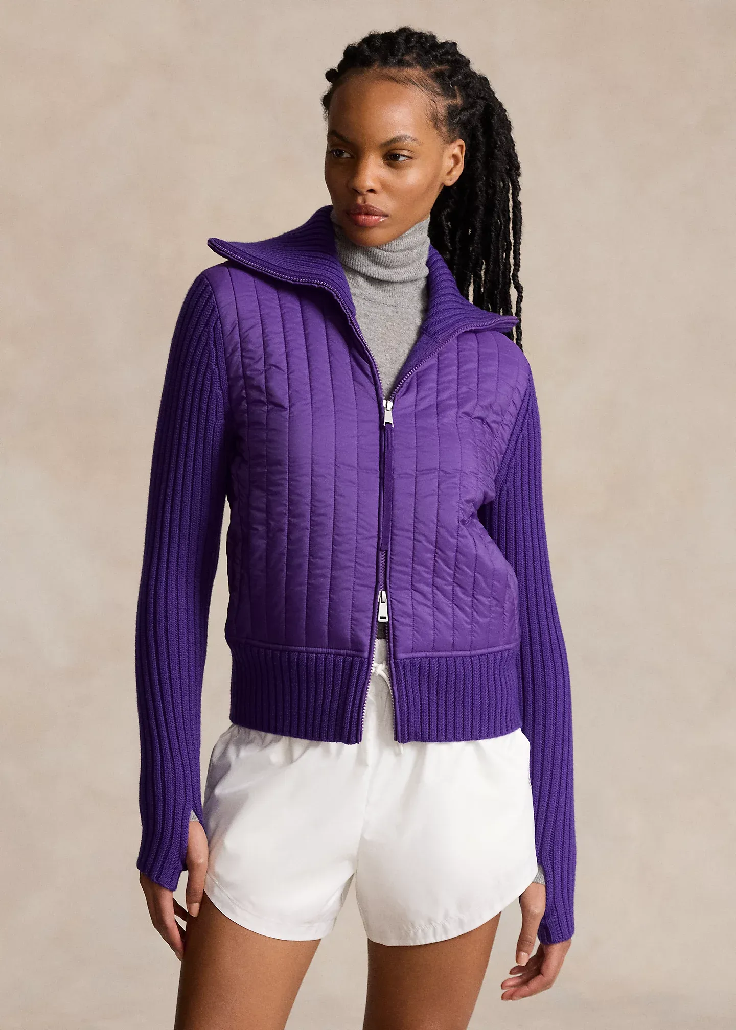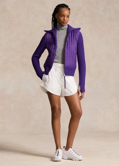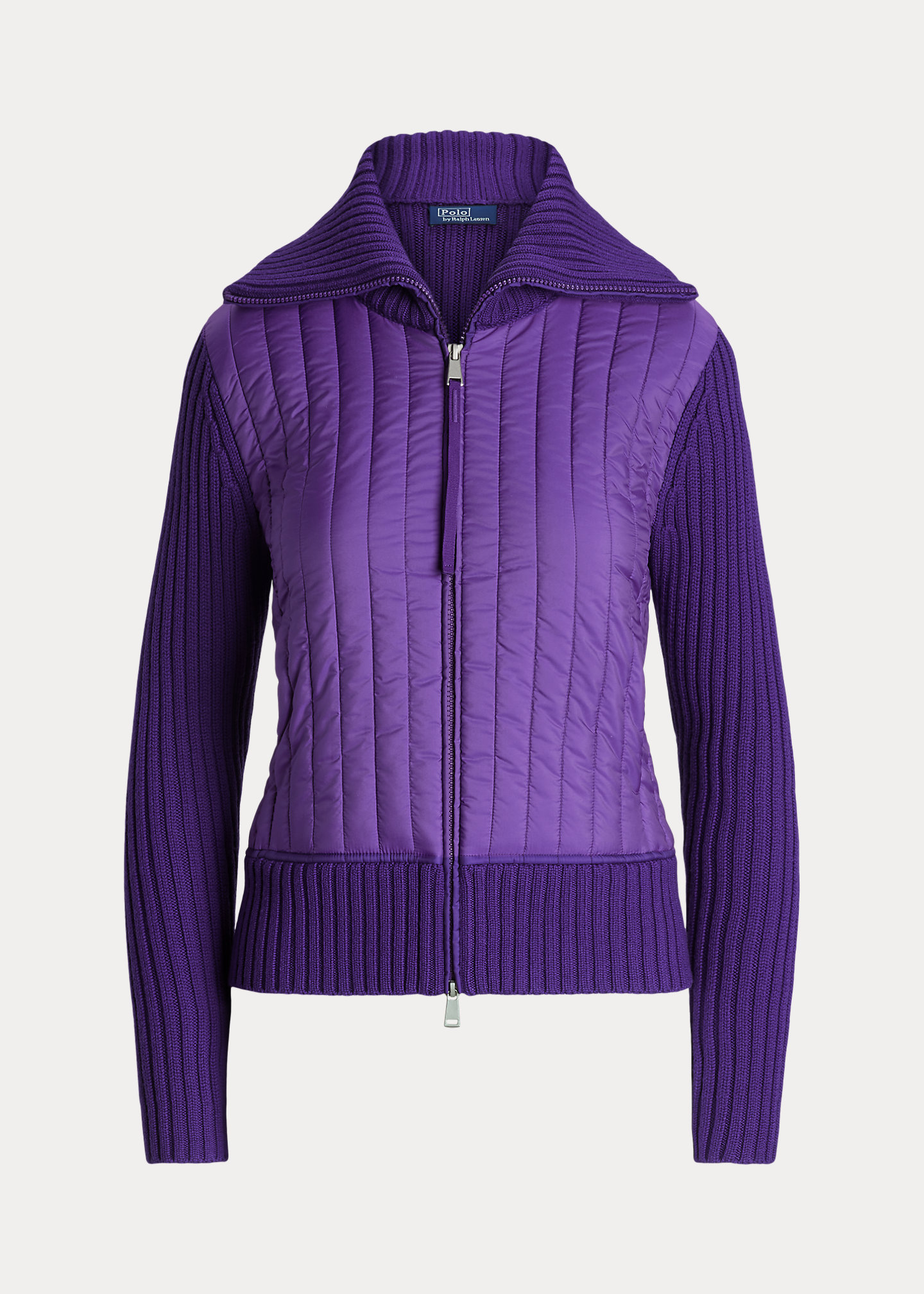 - Slim funnelneck. Two-way full-zip front. “Ralph Lauren” printed at the zipper pull.