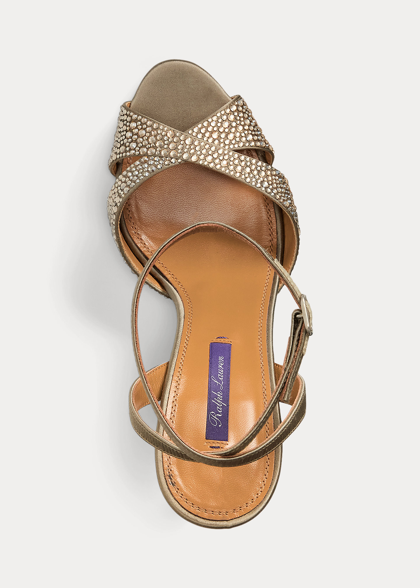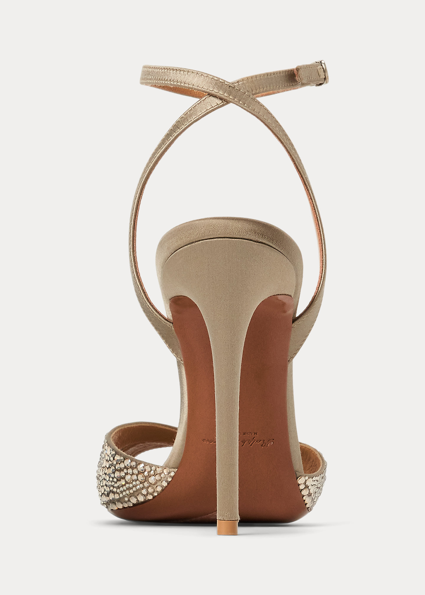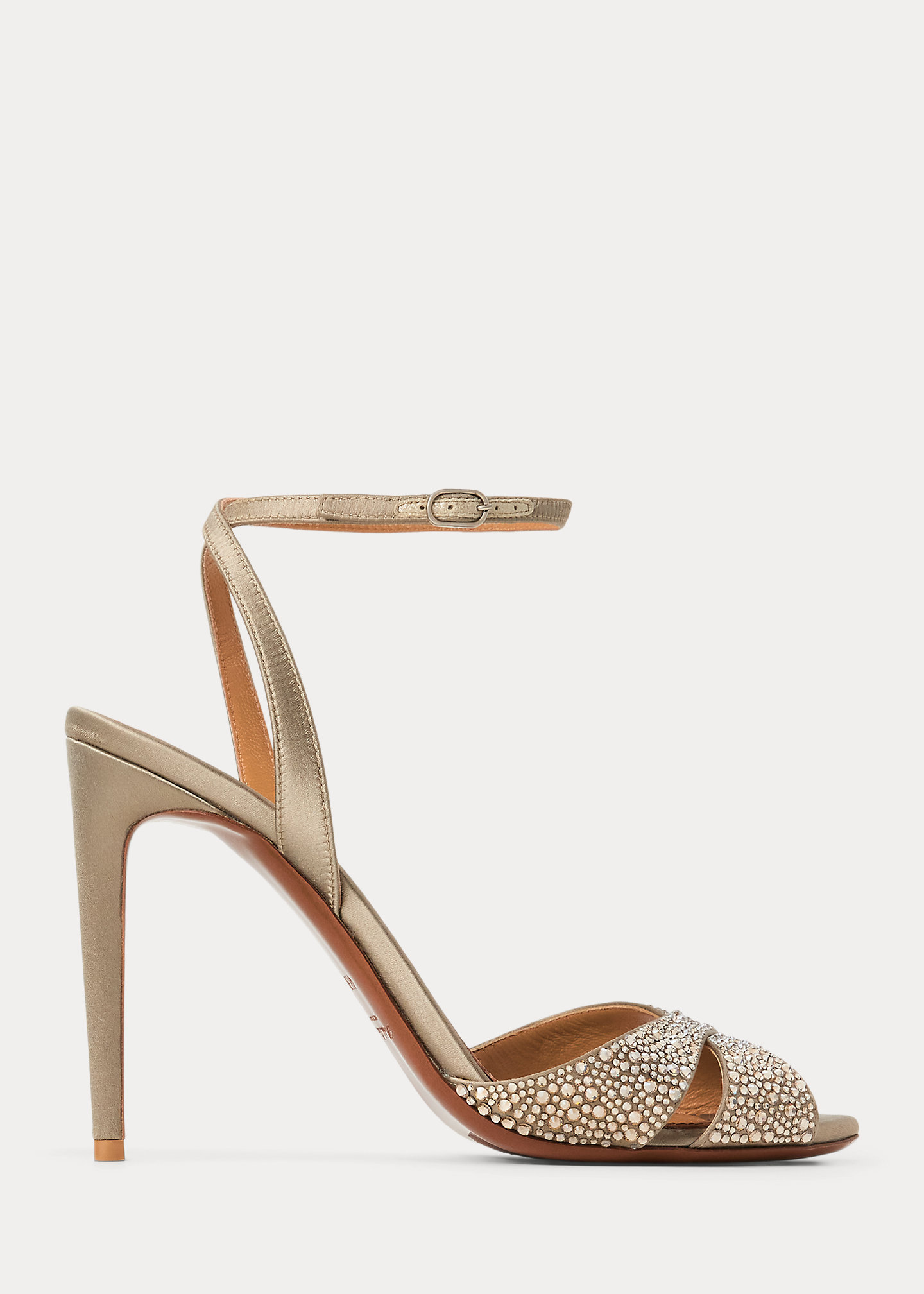 - Buckled wraparound ankle strap. Antiqued, silver-brown oval-shaped buckle.