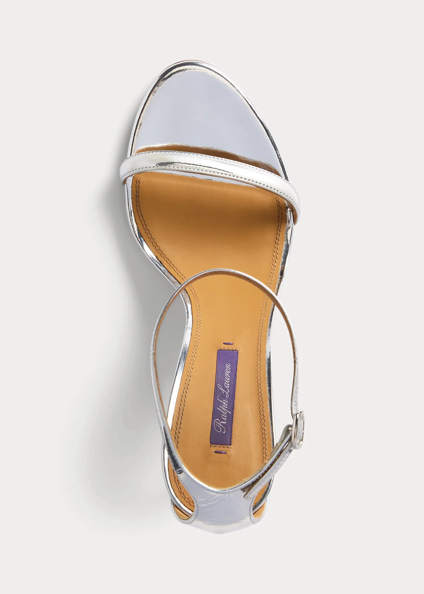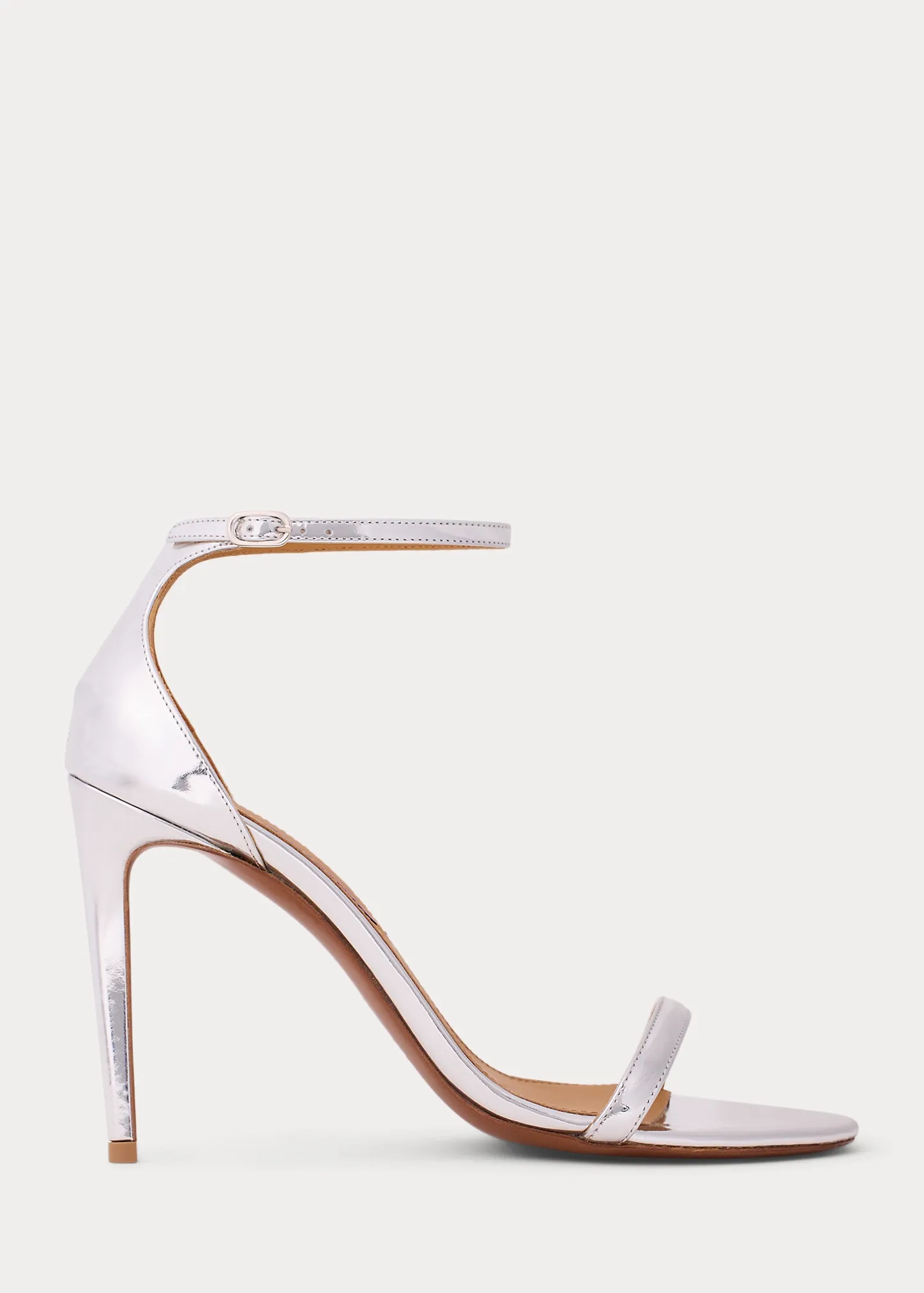 - Buckled ankle strap. Oval-shaped, silver-tone brass buckle.
