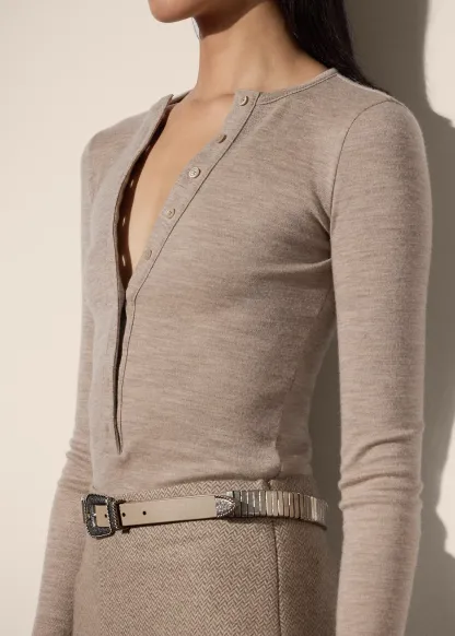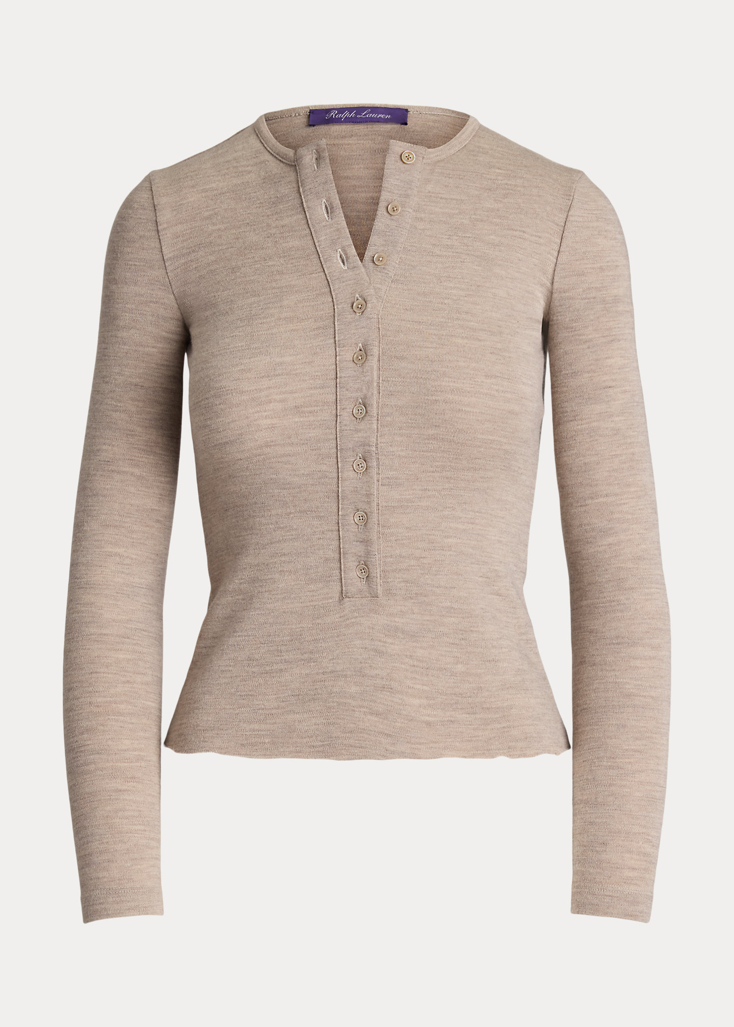 - Rib-knit crewneck. Rib-knit buttoned placket. Genuine mother-of-pearl buttons.
