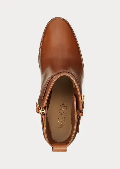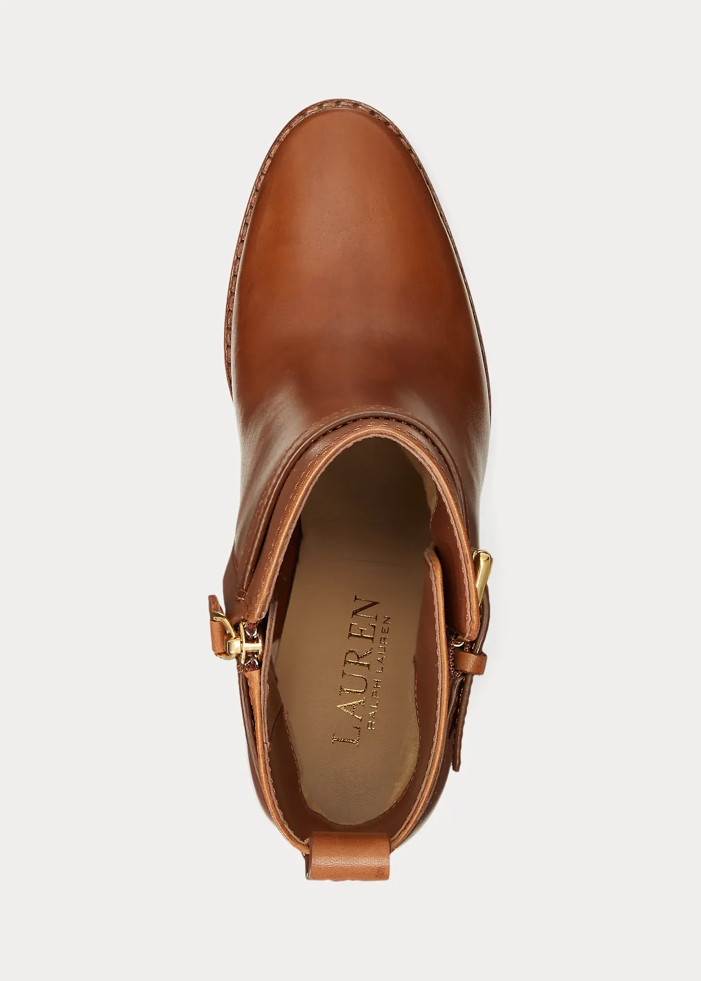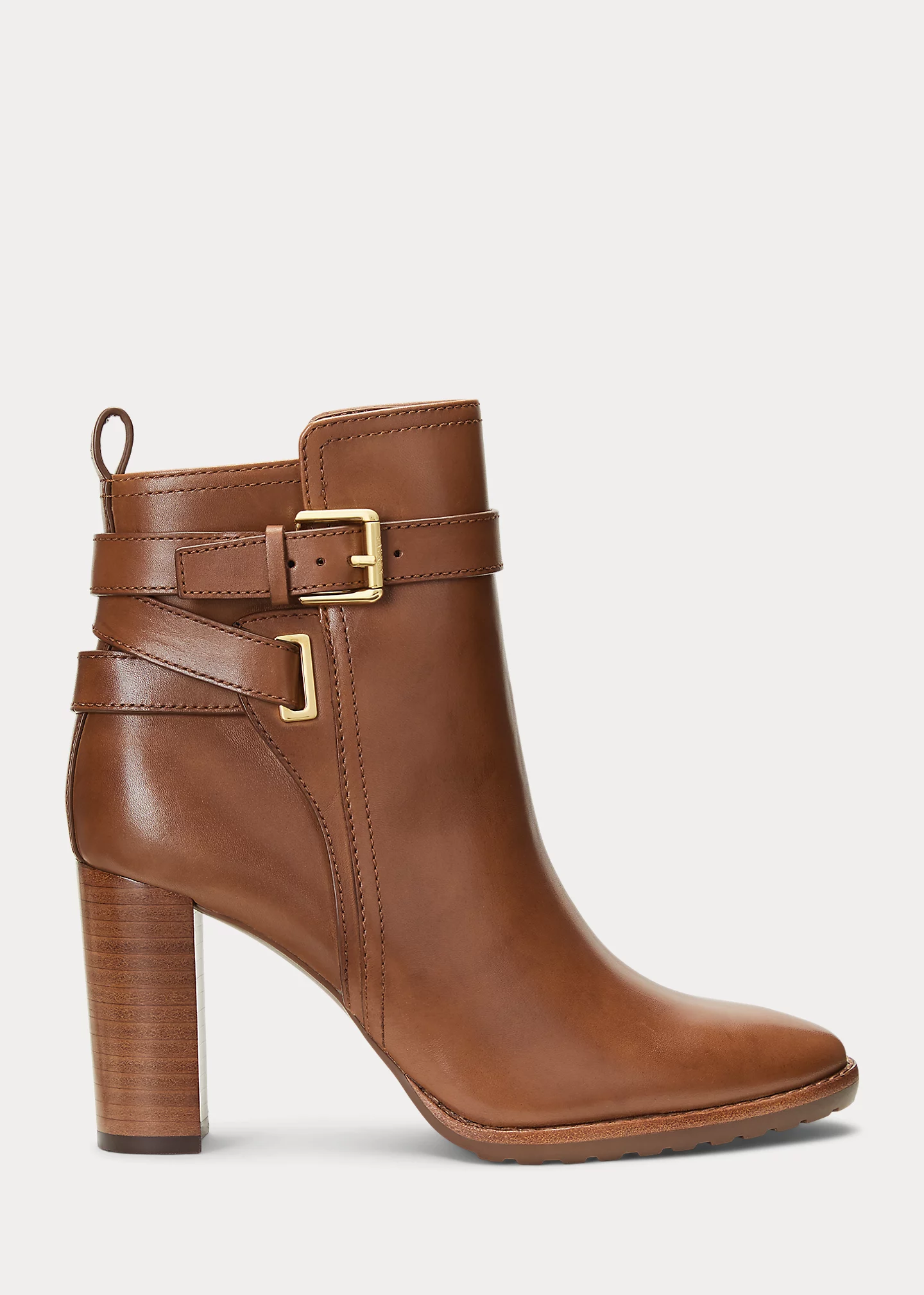 - Side zip closure. Wraparound buckled ankle strap. “LRL”-debossed pull tab at the back.