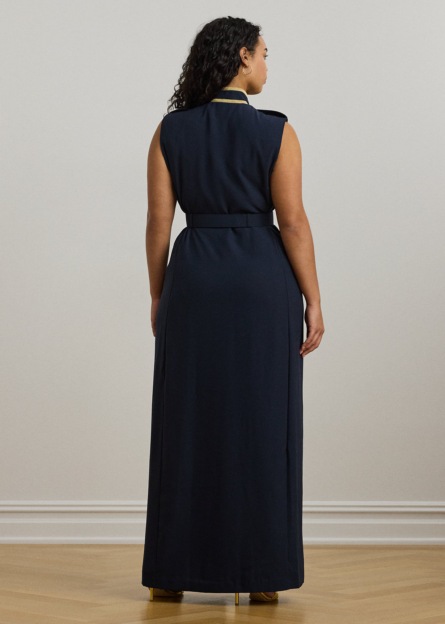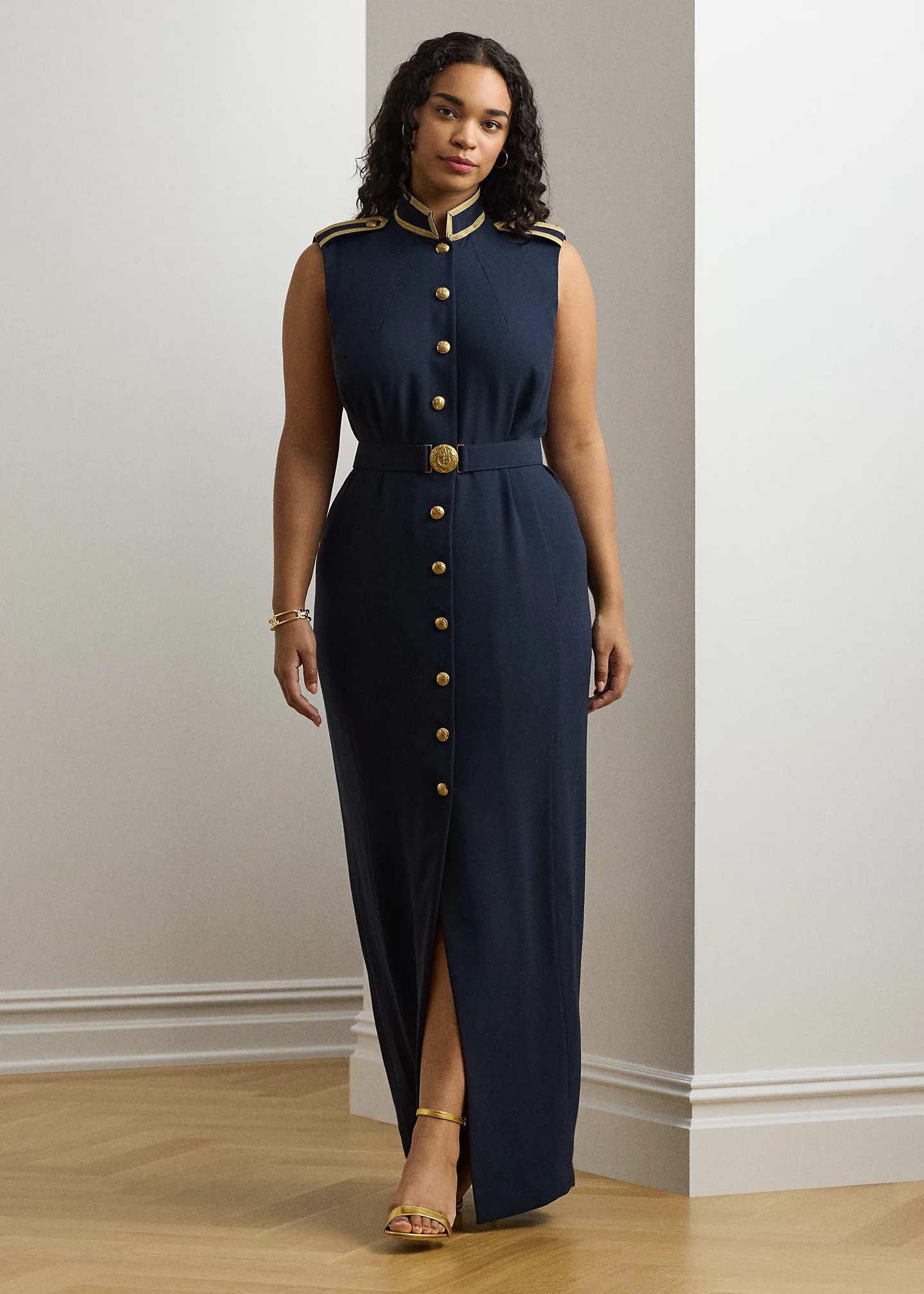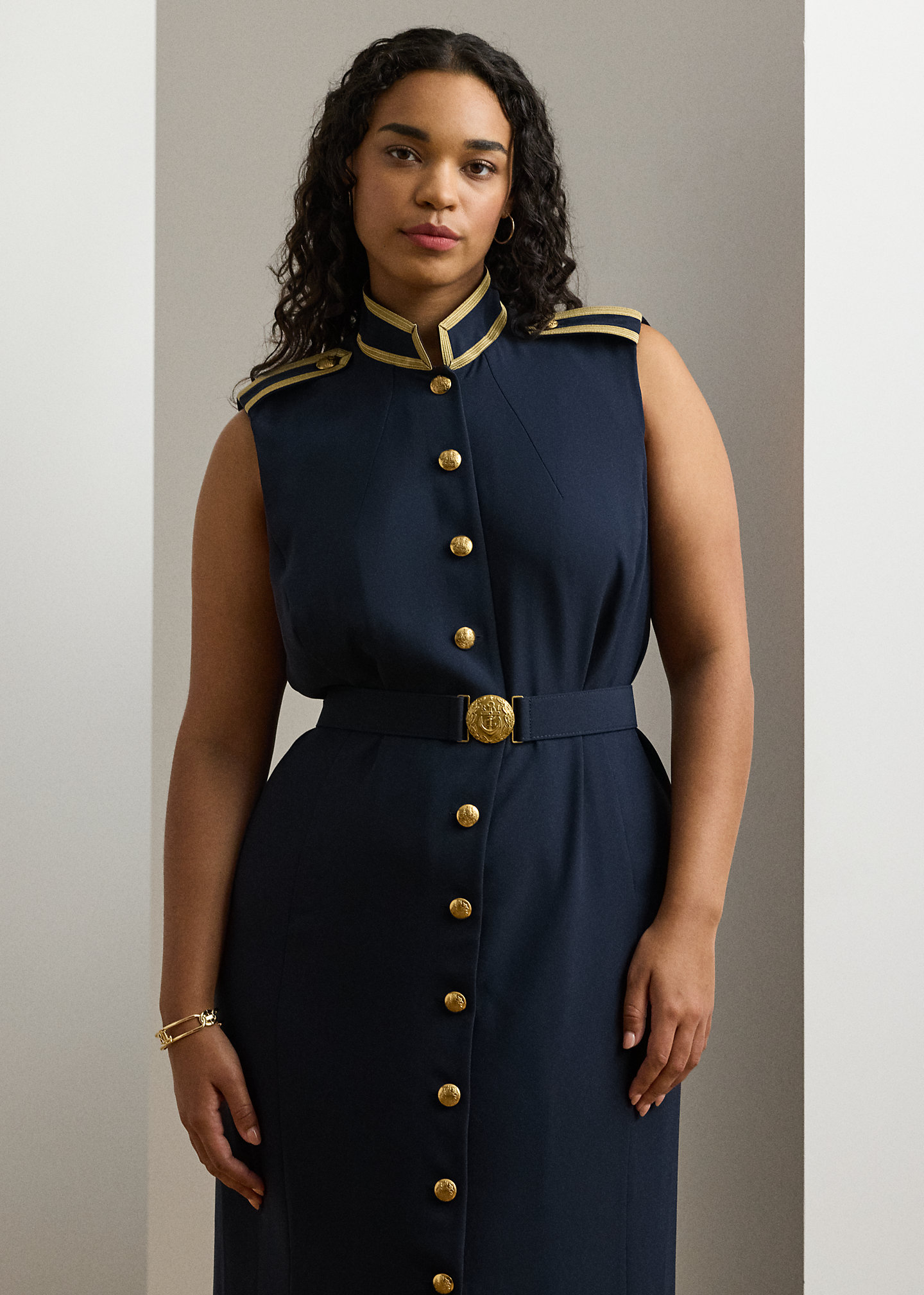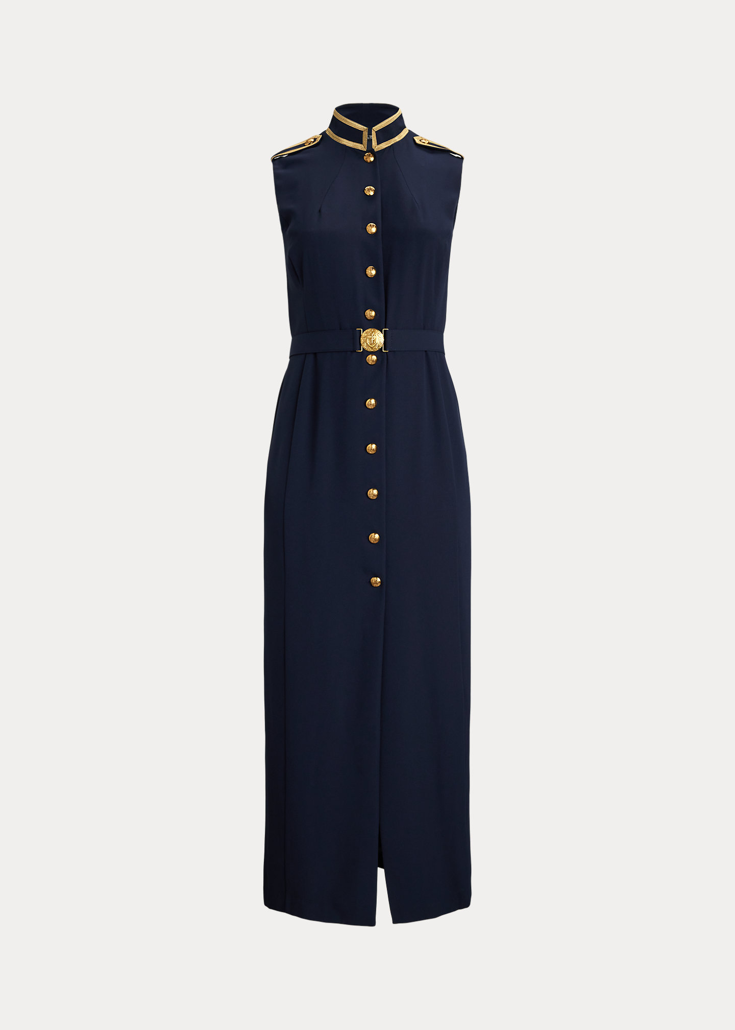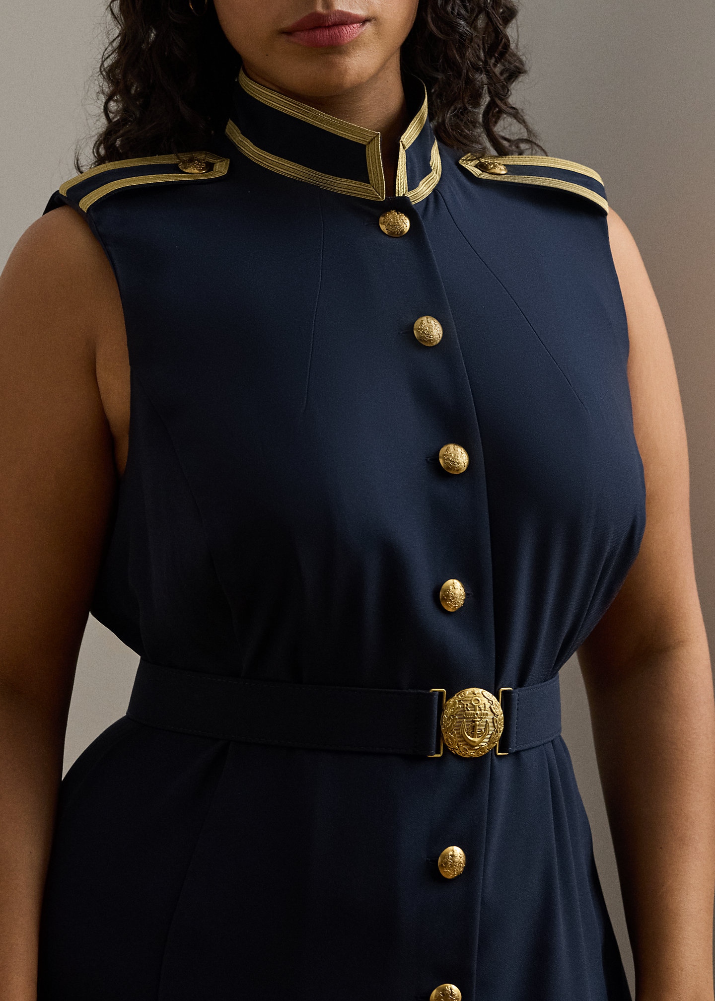 - Sleeveless silhouette. Buttoned shoulder epaulets. Gold-tone crest-embossed metal buttons. Metallic braided trim at the shoulders.