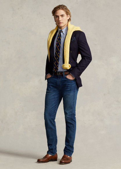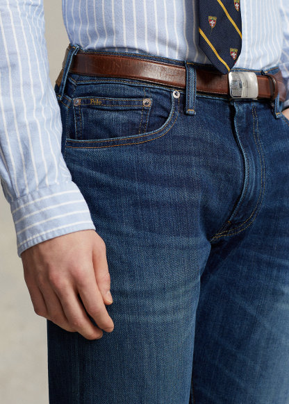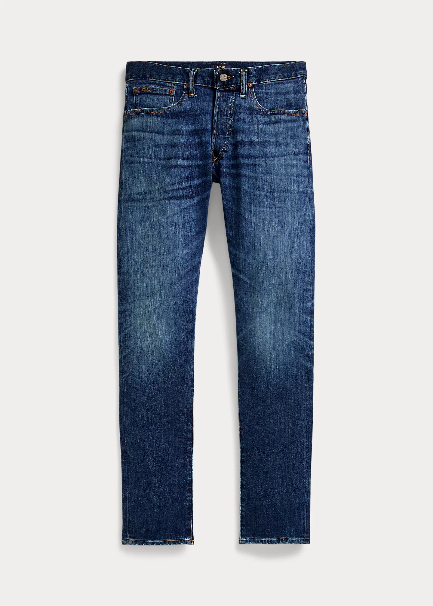- Five-pocket styling with signature metal rivets. "Polo" label at the coin pocket.