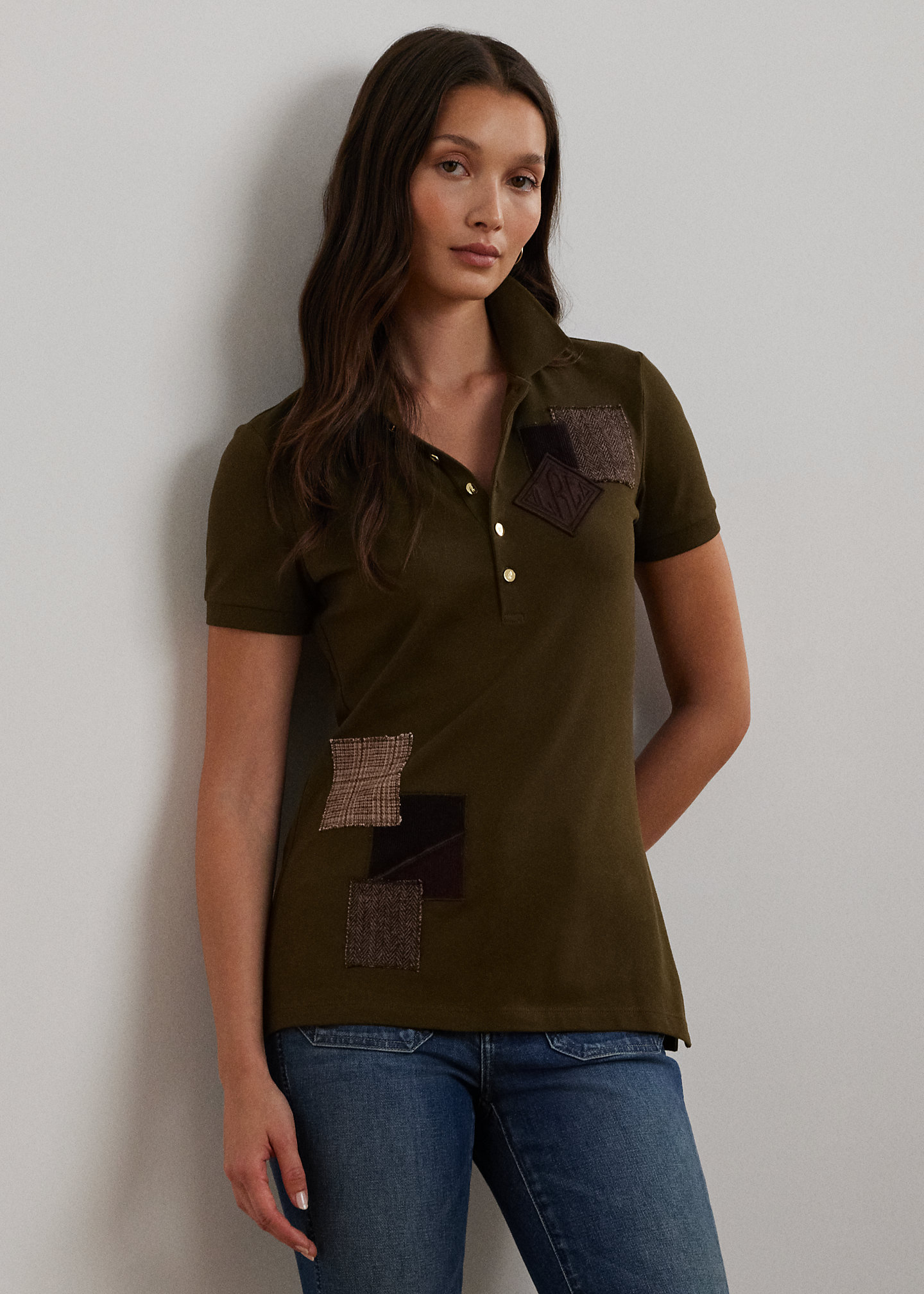- Short sleeves with ribbed armbands. Patchwork at the front. Diamond-shaped "LRL"-embroidered appliqué logo at the left chest. Side-split hem.