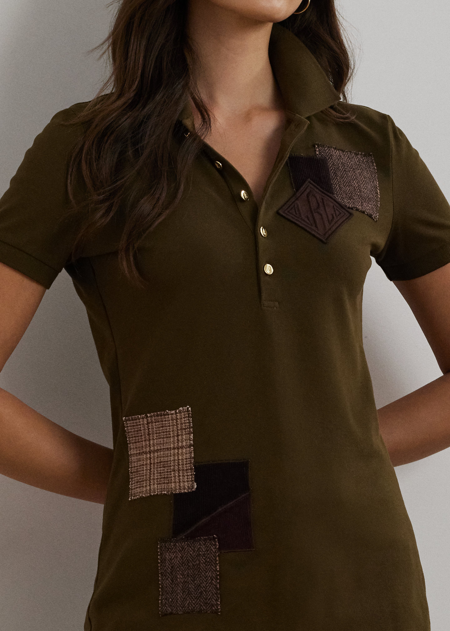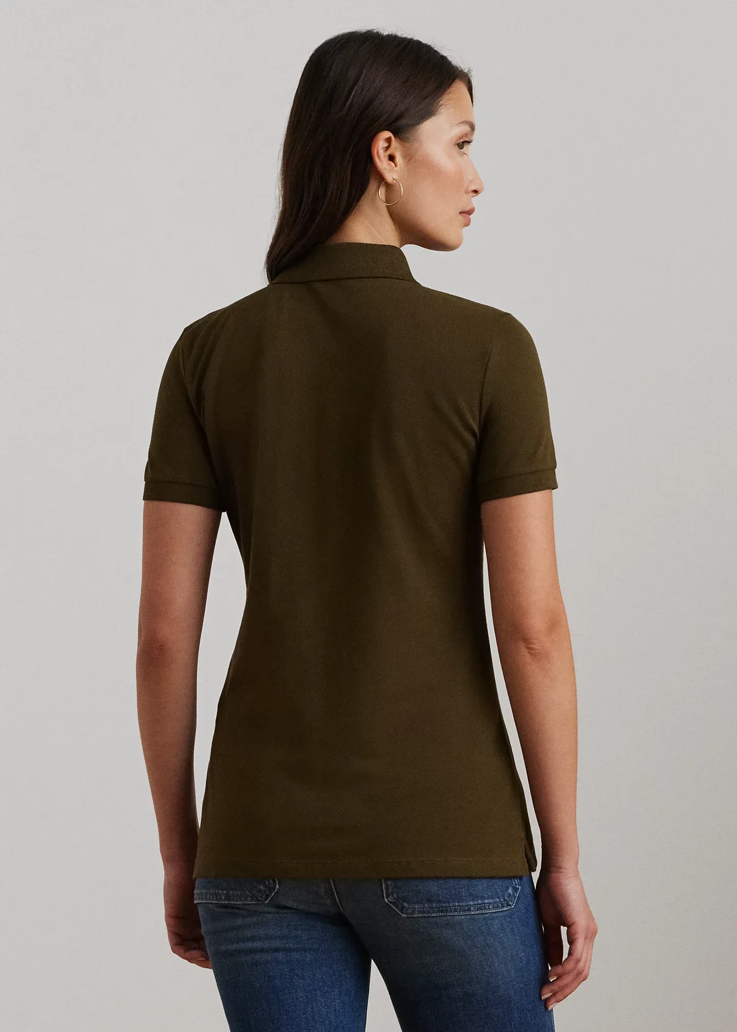 - Ribbed Polo collar. Five-button placket. "LRL"-engraved metal buttons.