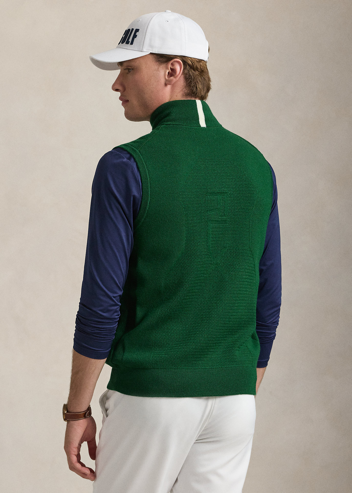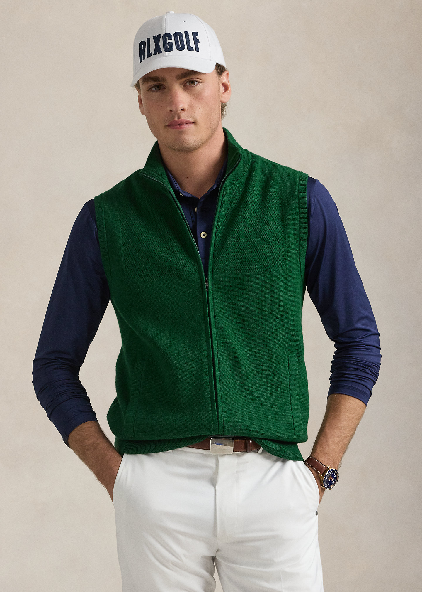 - “RLX” logo embroidered along right pocket and knit at the center back.