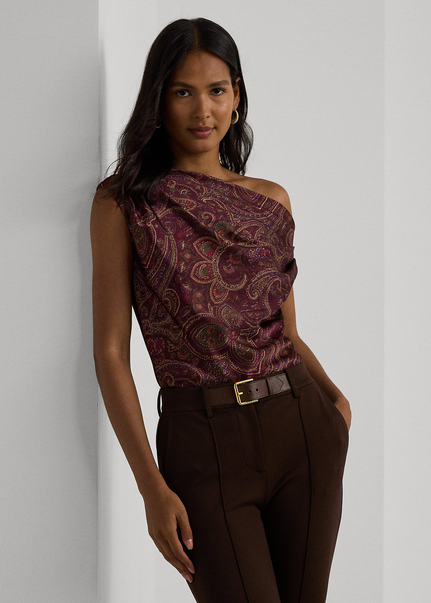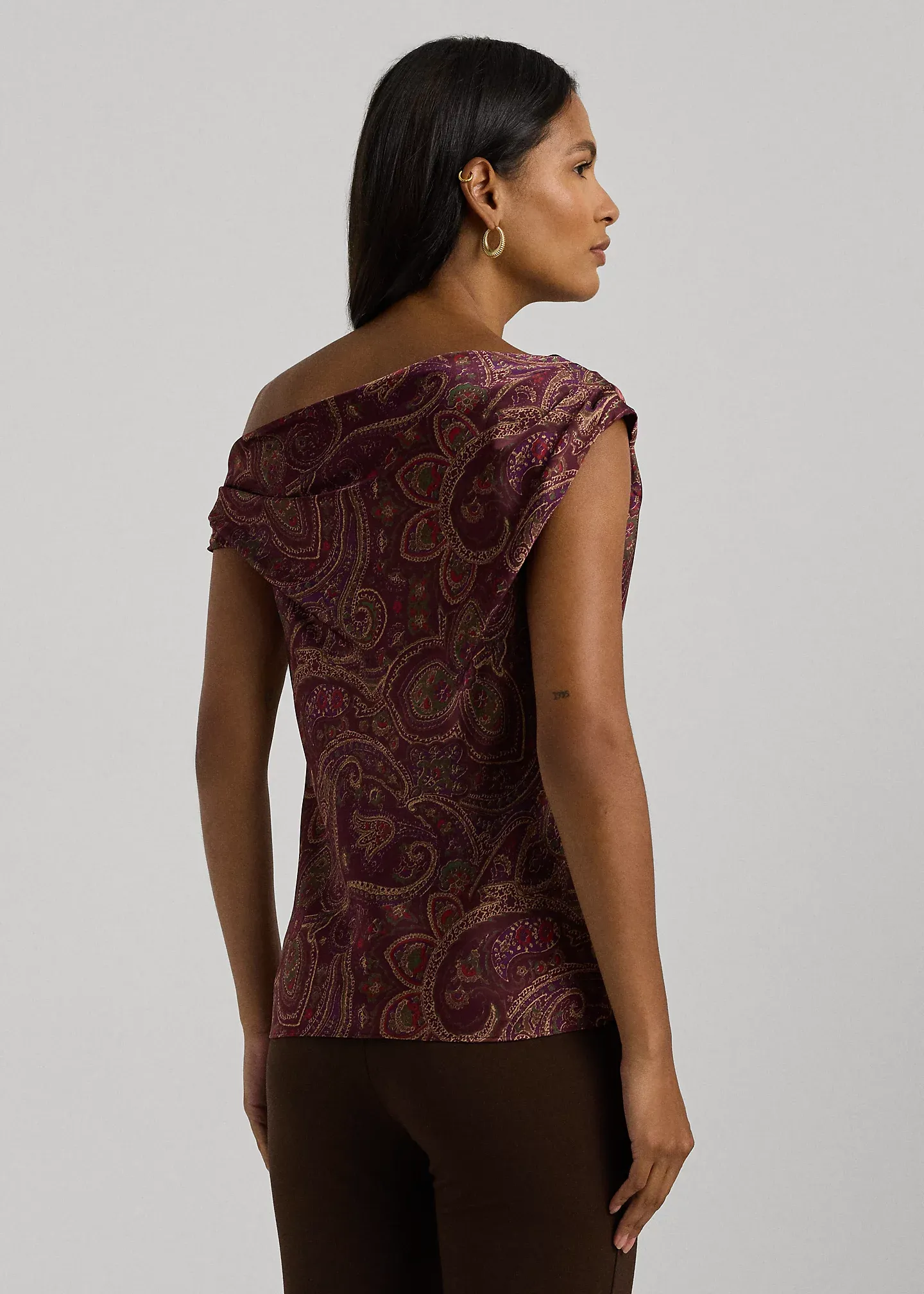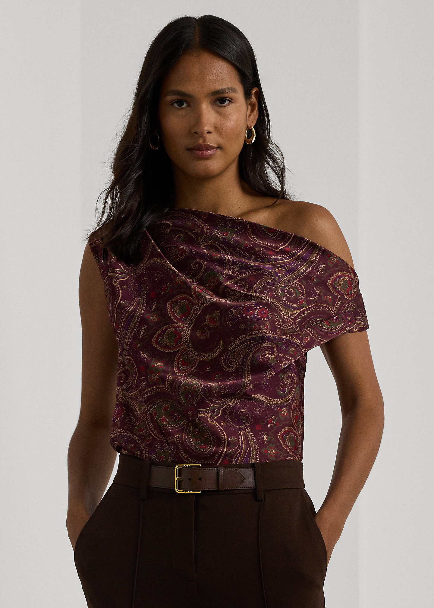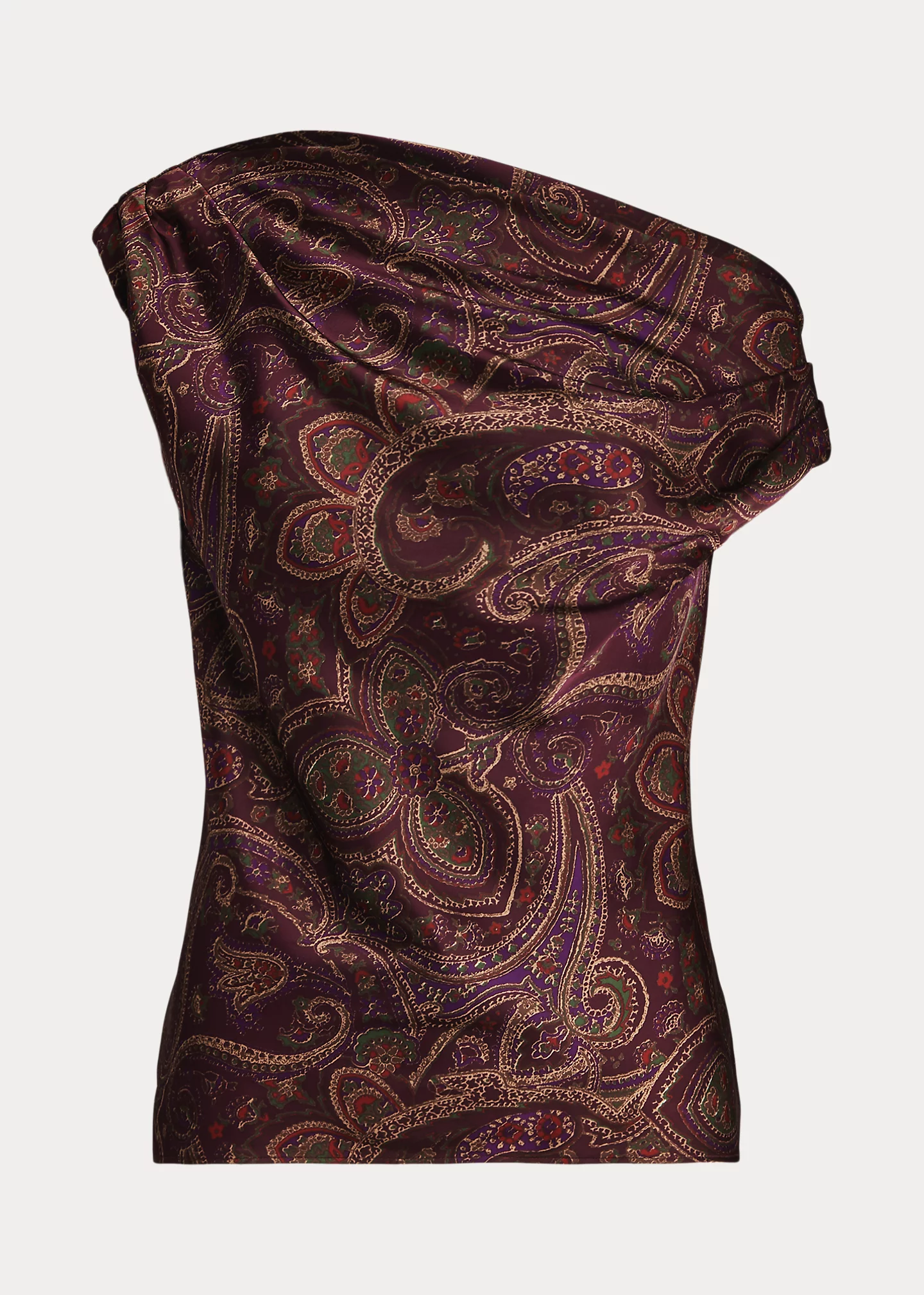 - Asymmetrical off-the-shoulder silhouette. Pull-on styling.