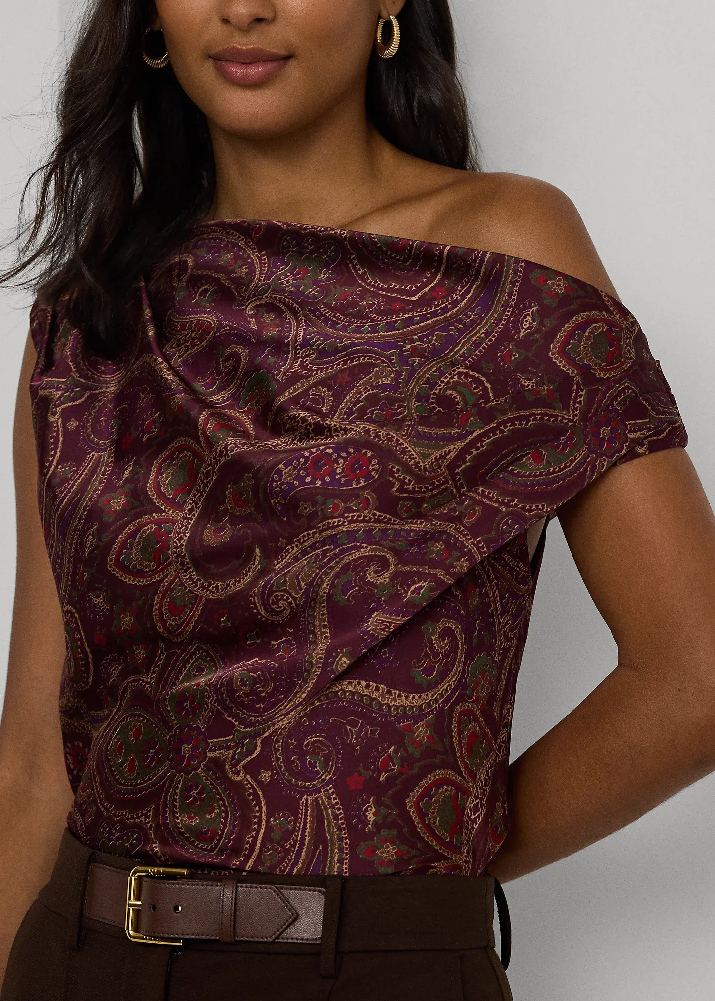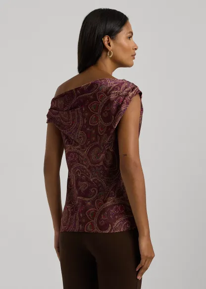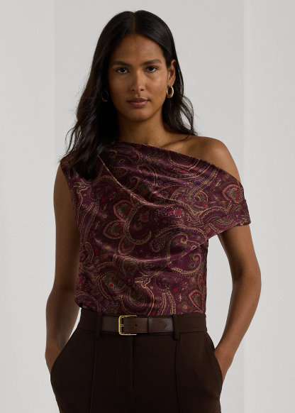Print Charmeuse Off-the-Shoulder Blouse