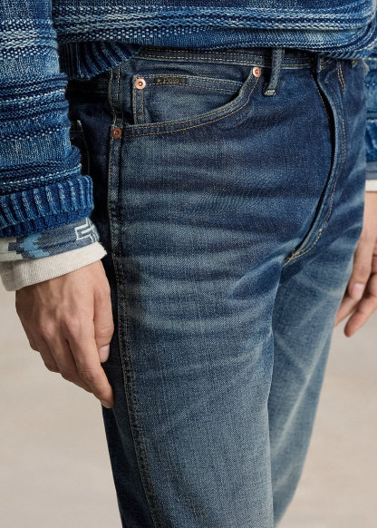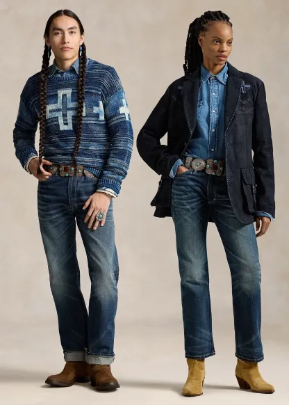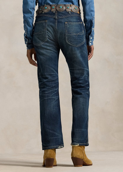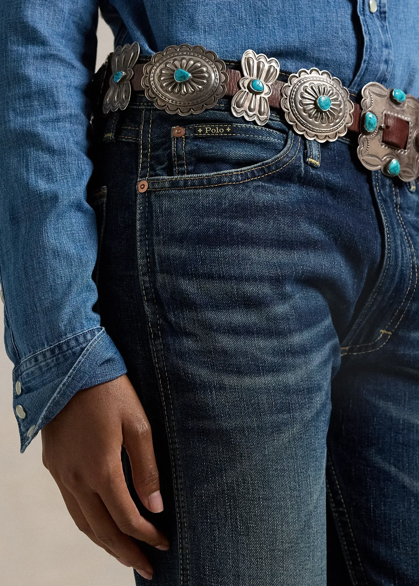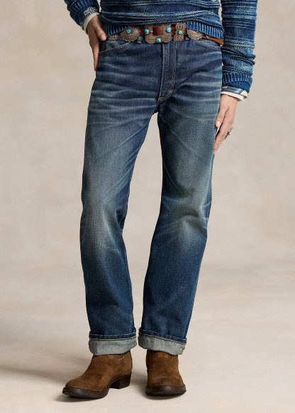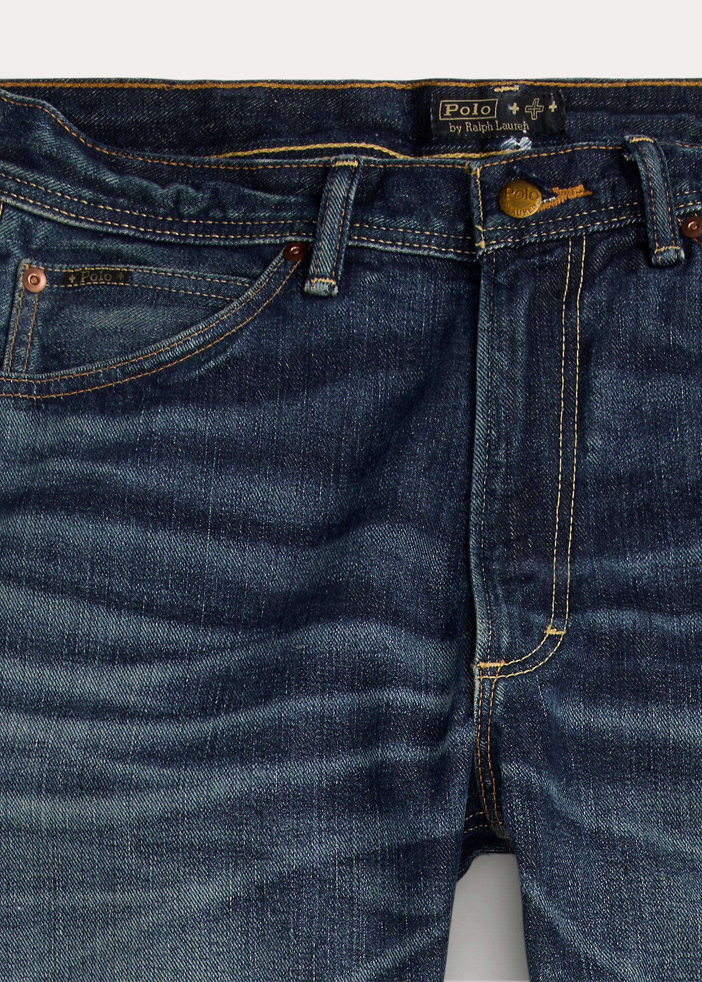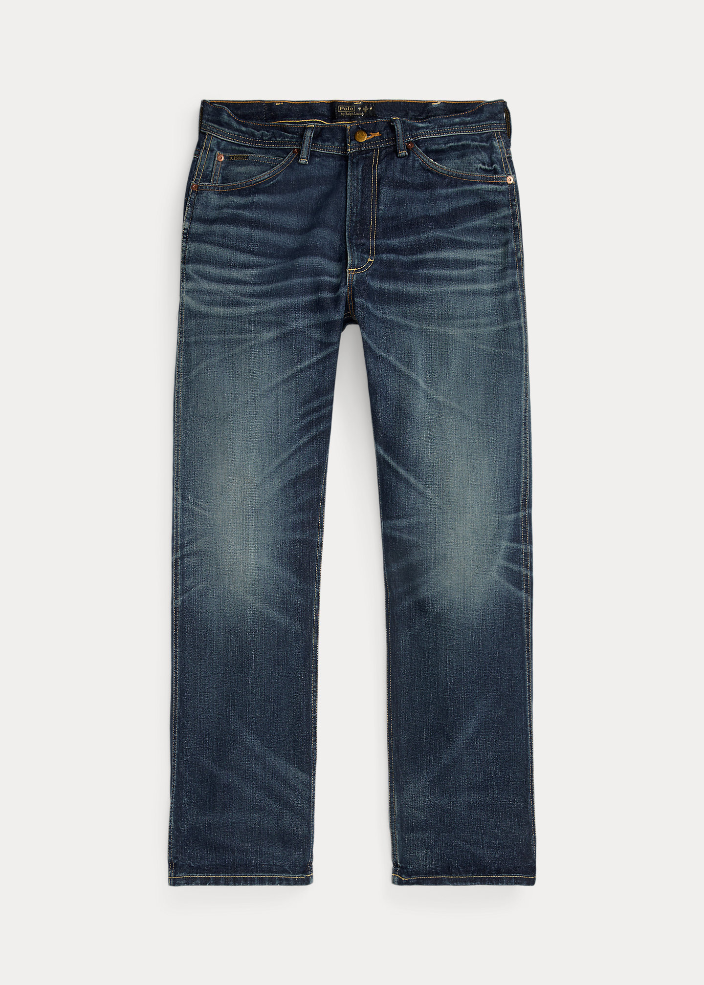 - Belt loops. Zip fly with a buttoned closure. Five-pocket styling with metal rivets. Custom “Polo” label with four-directional crosses at the coin pocket.