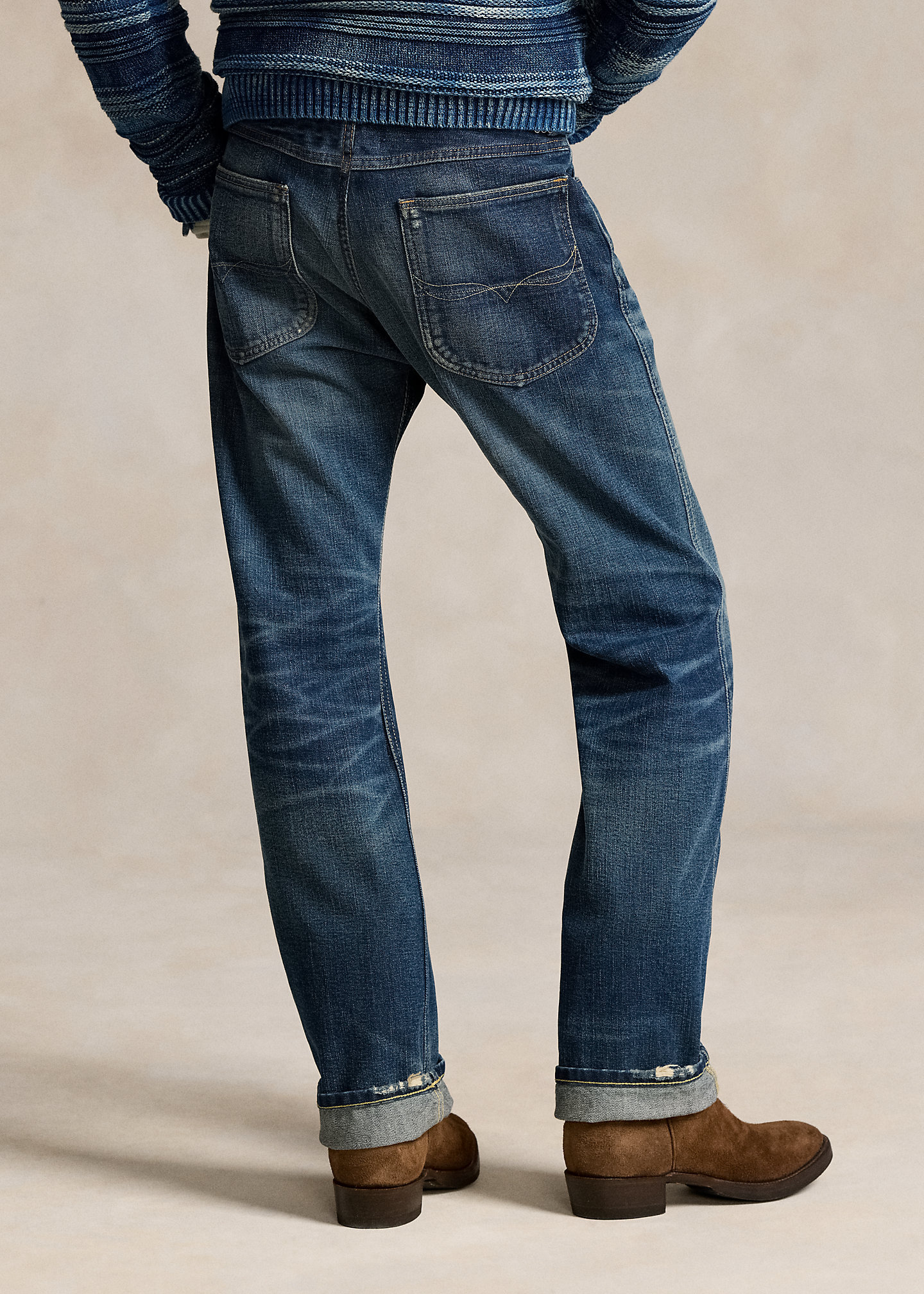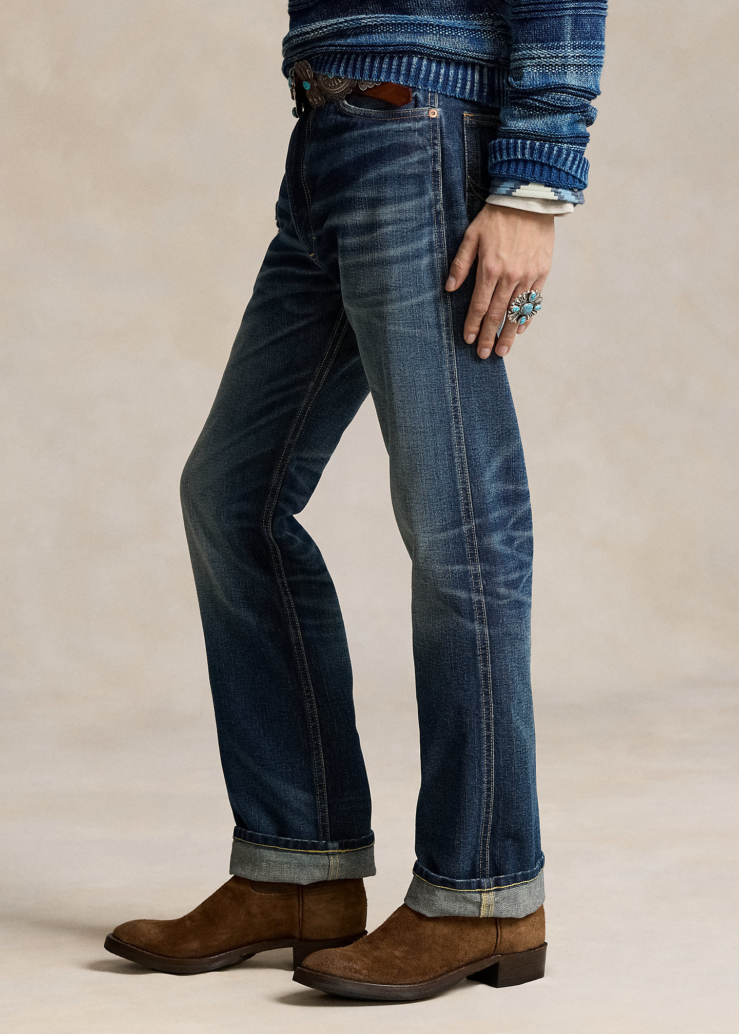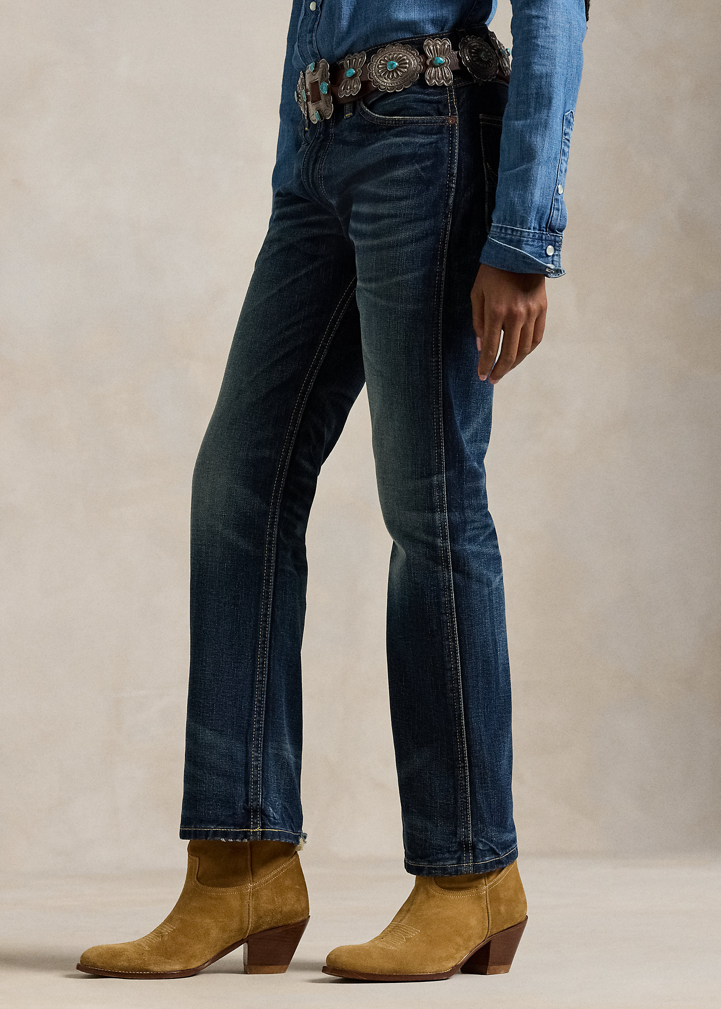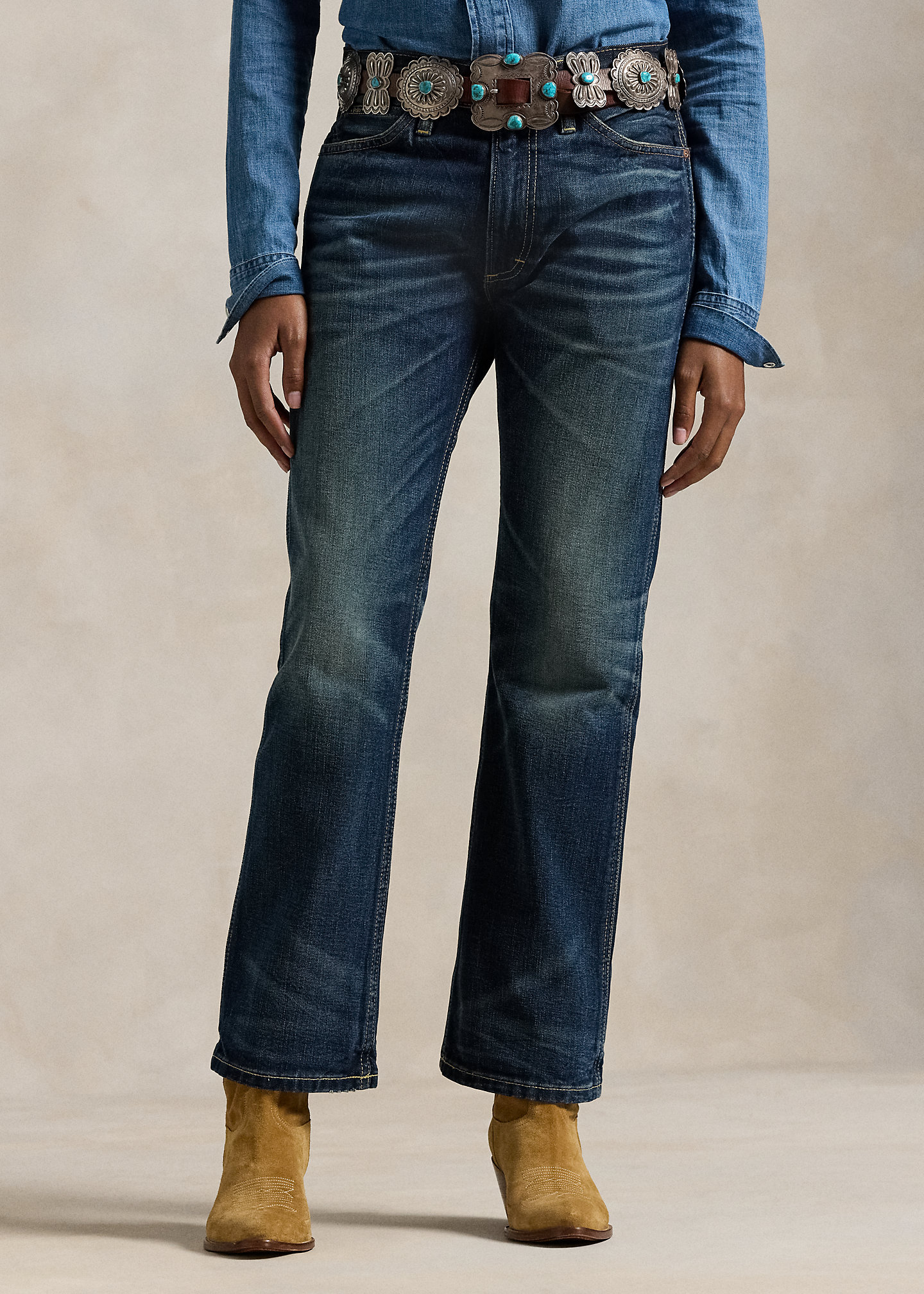 - Belt loops. Zip fly with a buttoned closure. Five-pocket styling with metal rivets. Custom “Polo” label with four-directional crosses at the coin pocket.