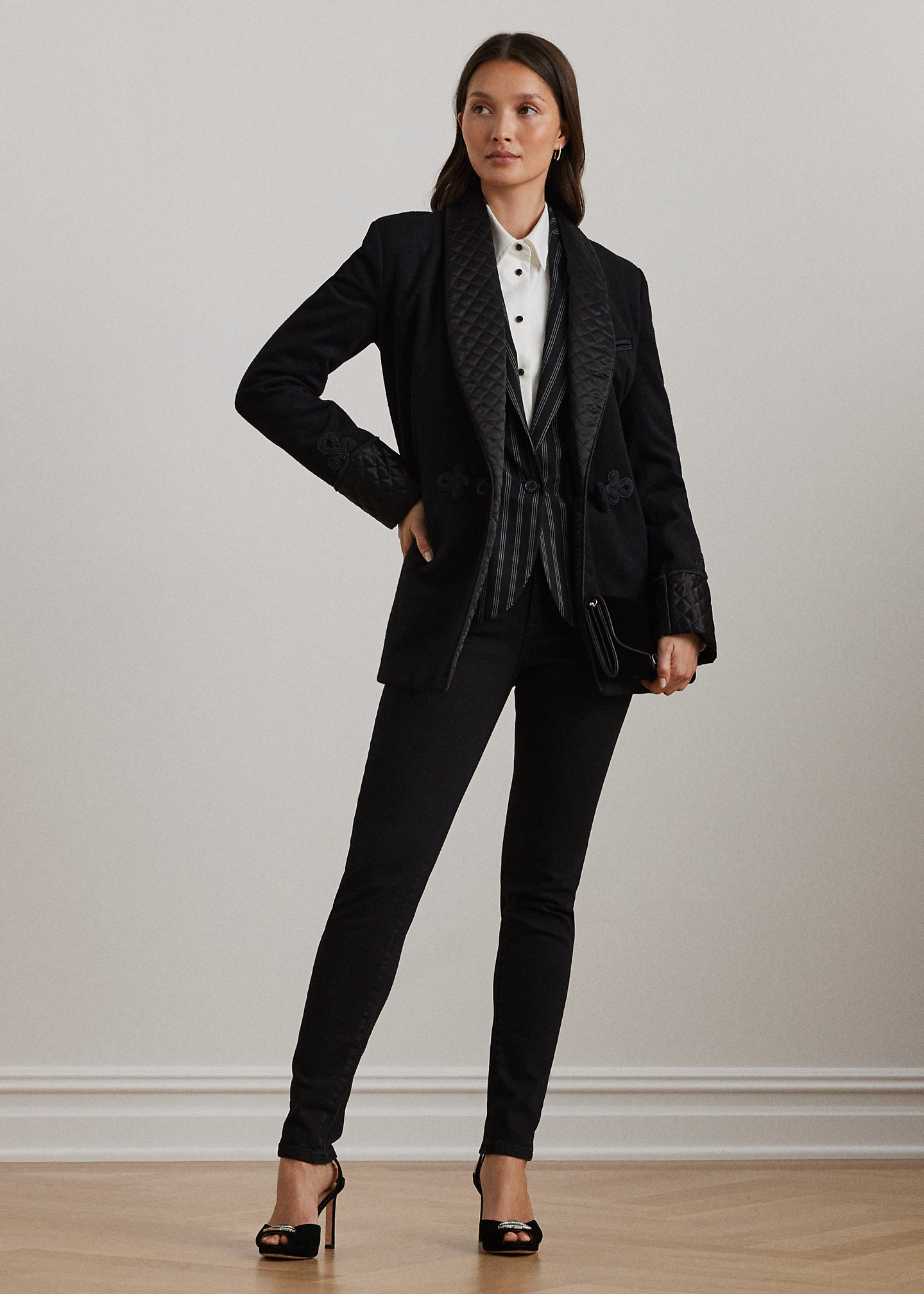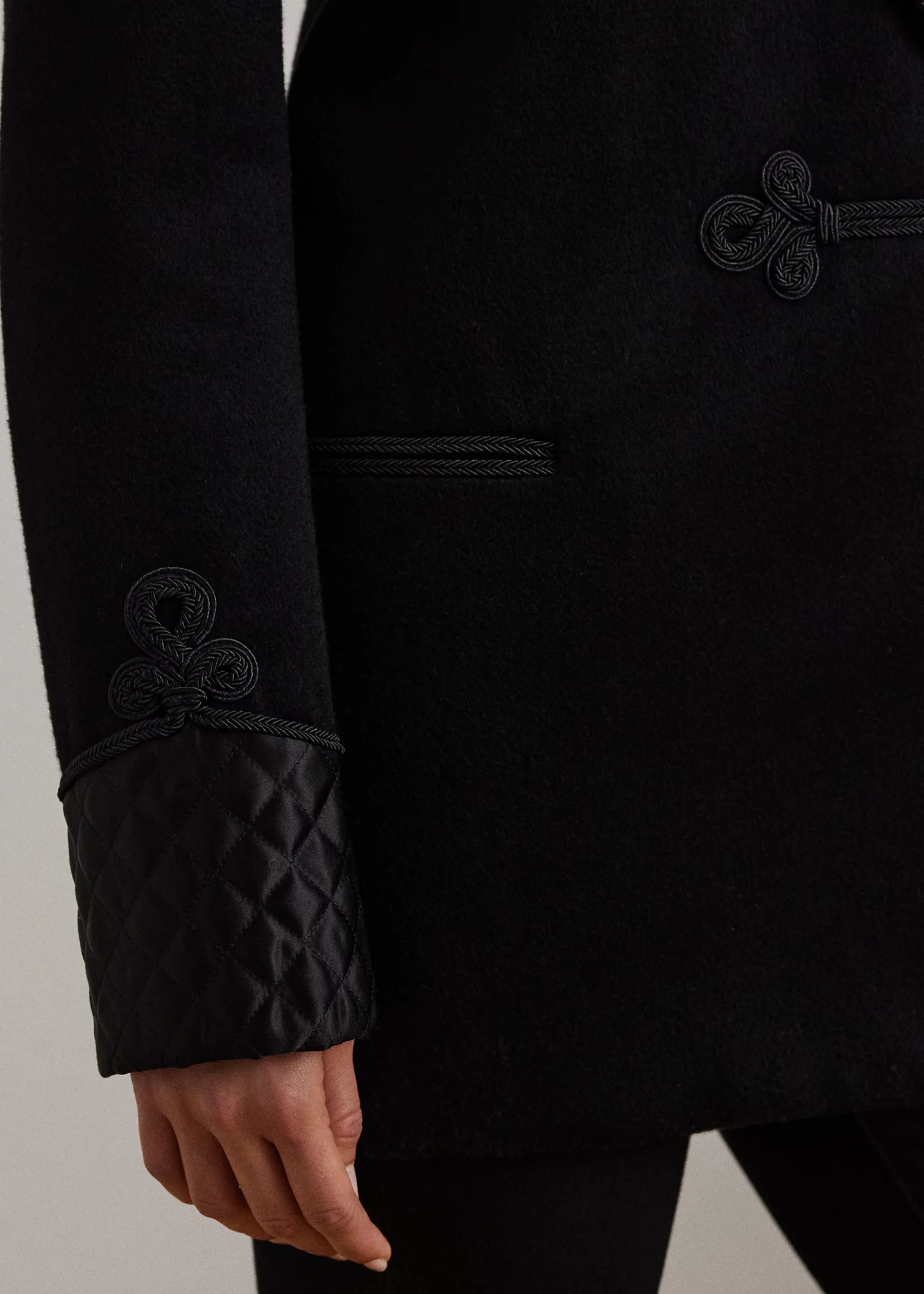 - Long sleeves with diamond-quilted satin cuffs. Decorative appliqué detailing above the cuffs. Shoulder pads. Left chest angled besom pocket. Two front waist besom pockets. Back panel seams.