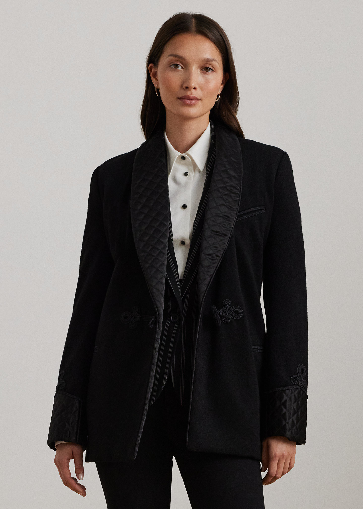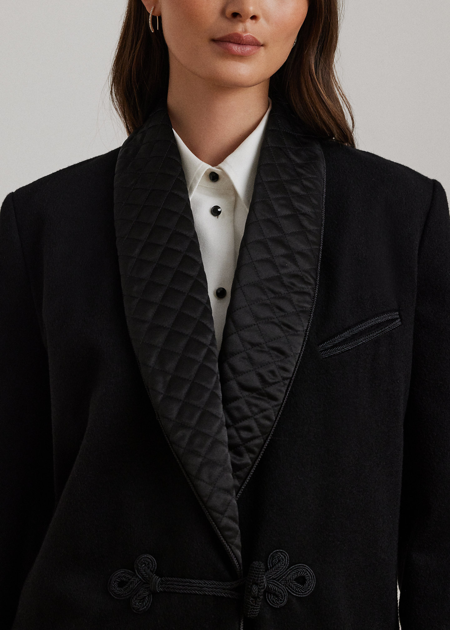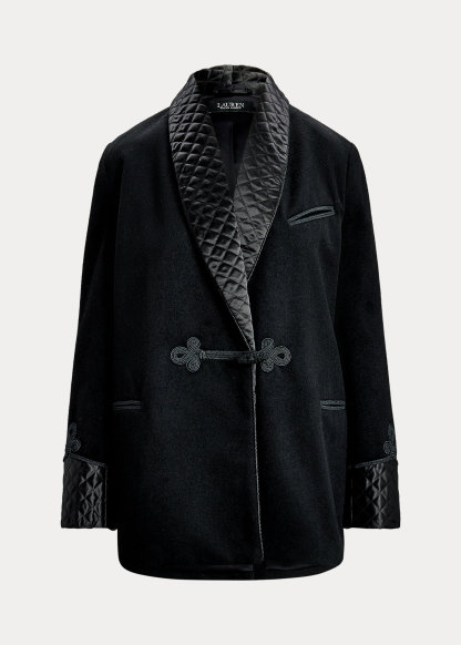 - Diamond-quilted satin shawl collar. Frog-loop closure at the center front. Interior stay button.