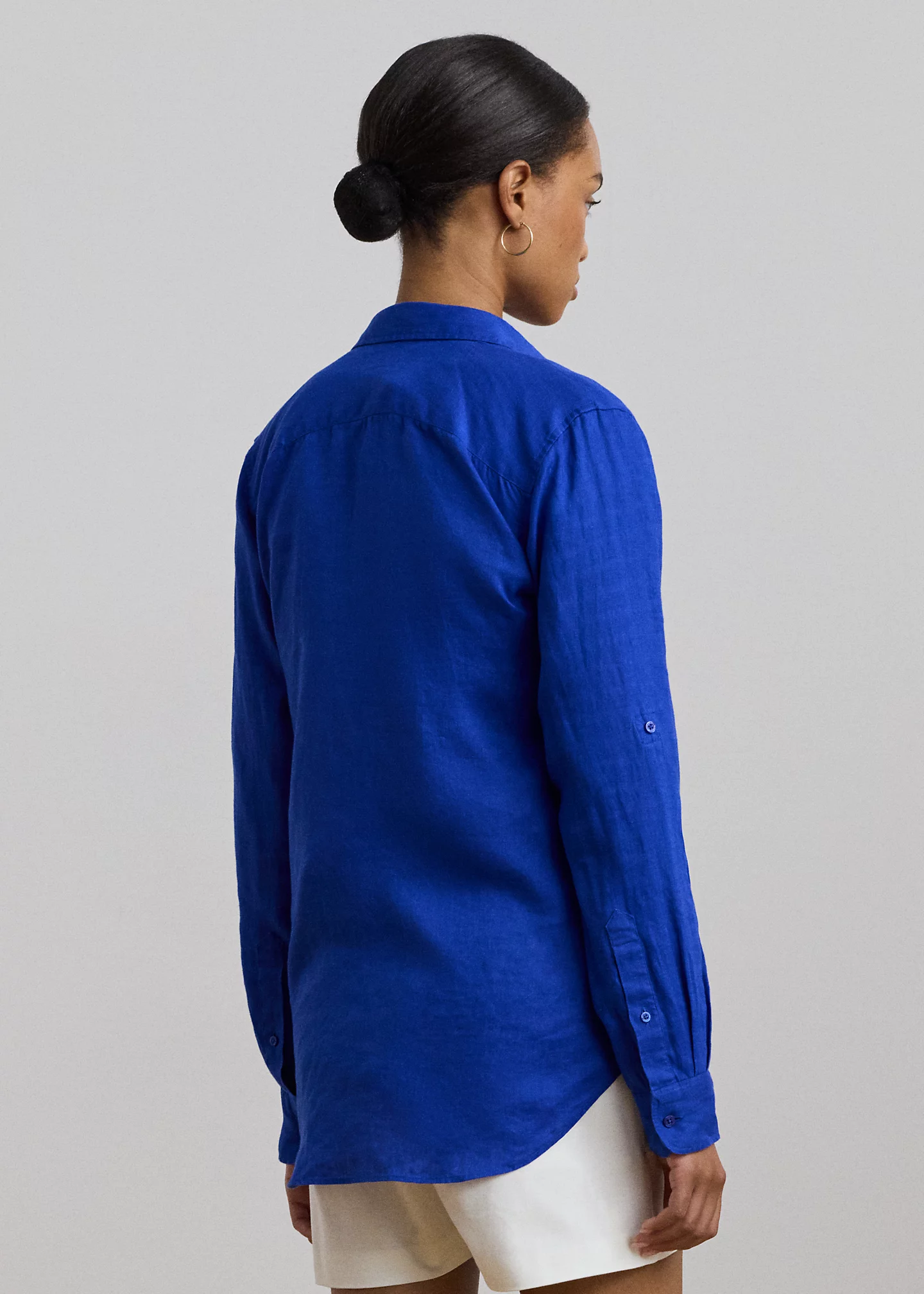 - Long roll-tab sleeves with buttoned barrel cuffs. Pleating at the cuffs.