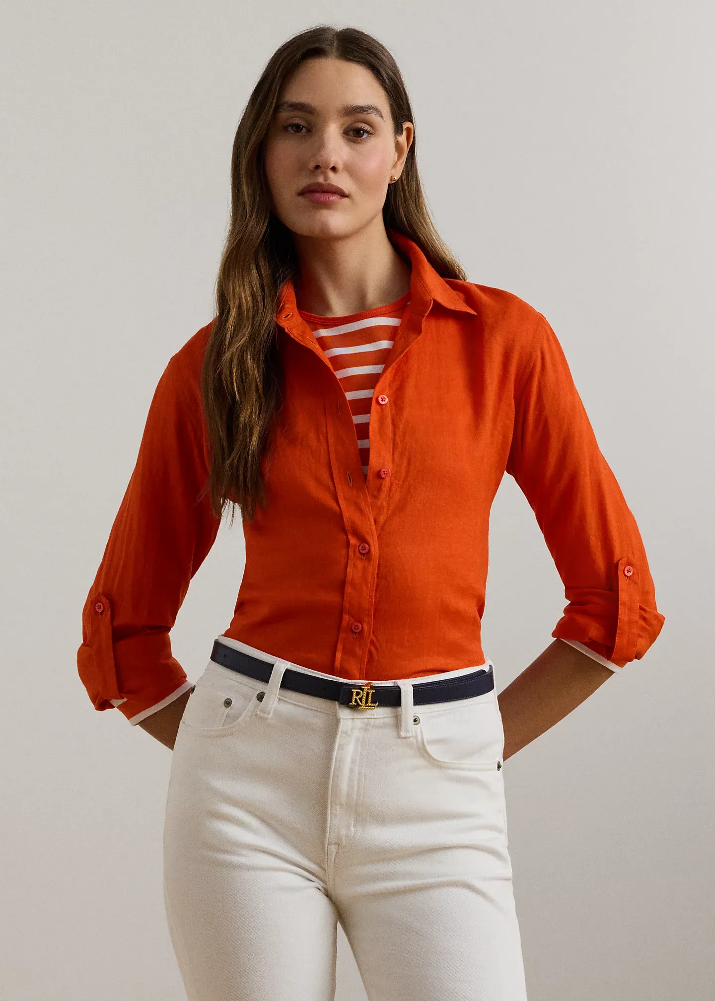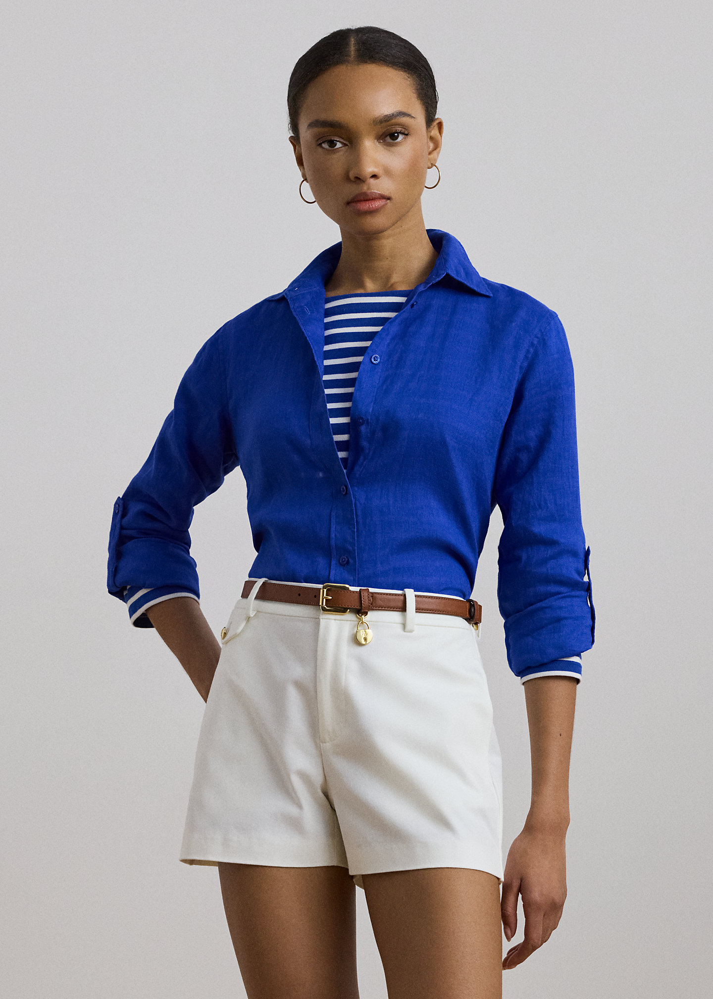 - Point collar. Buttoned placket with "Lauren Ralph Lauren"-engraved buttons.
