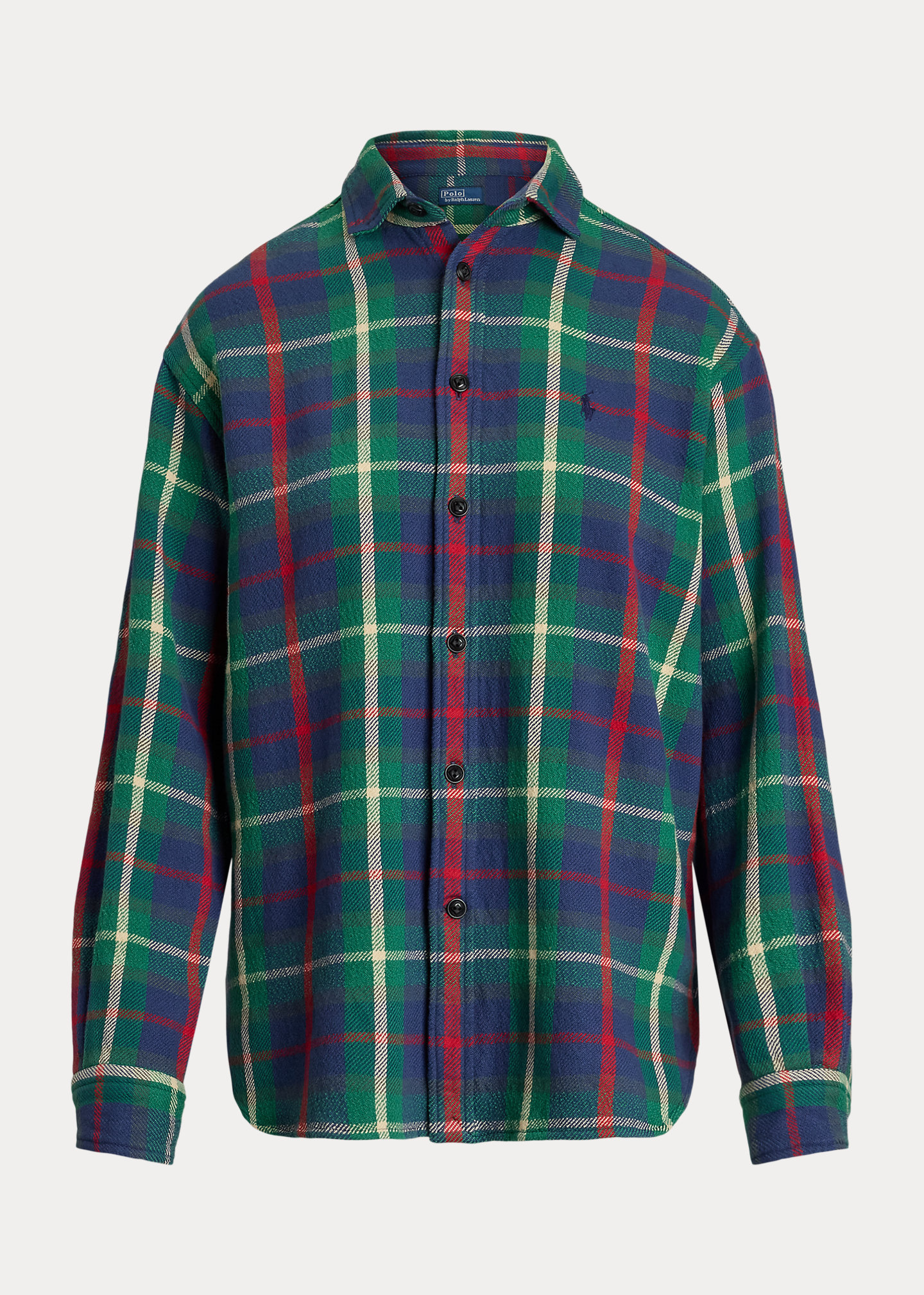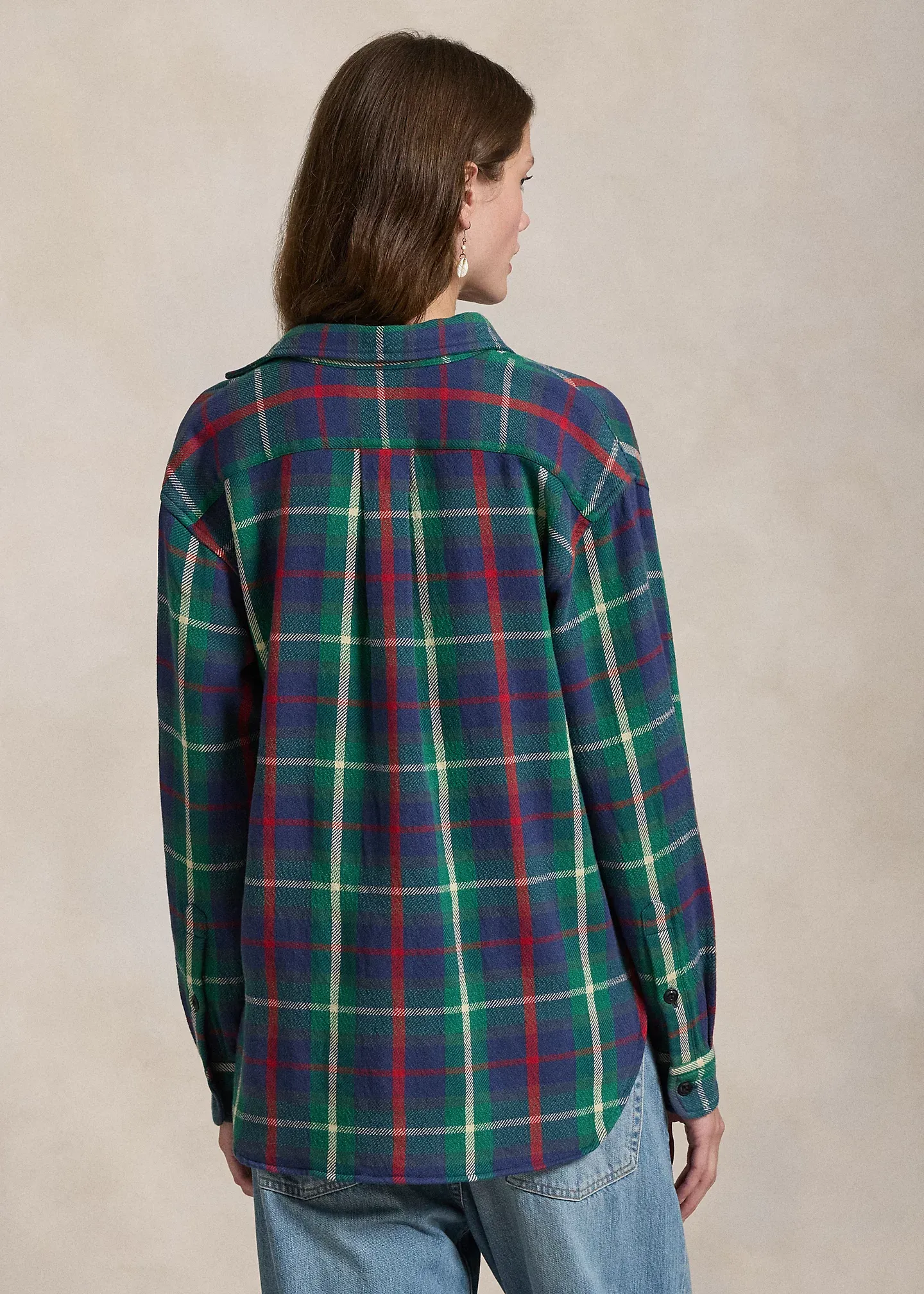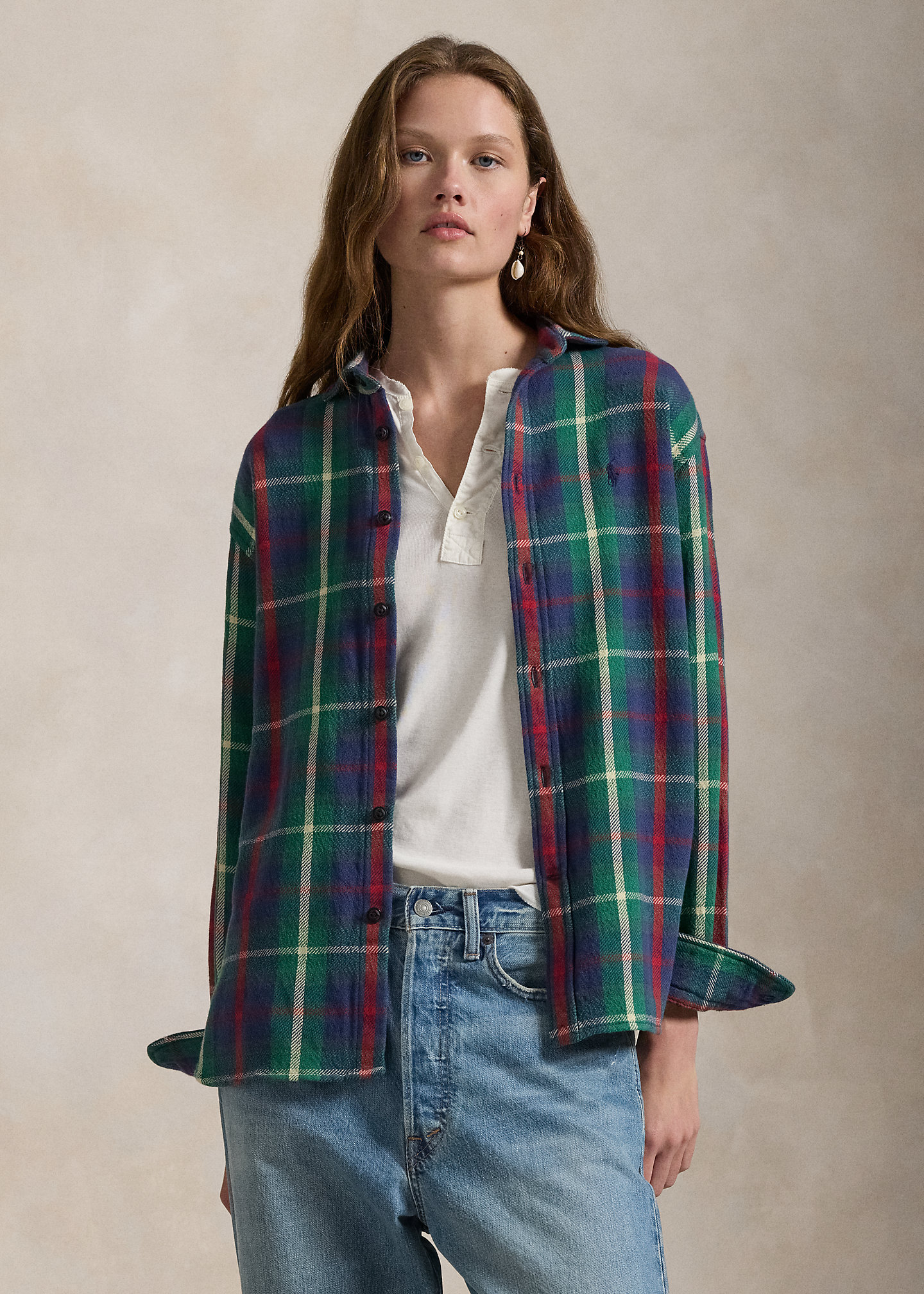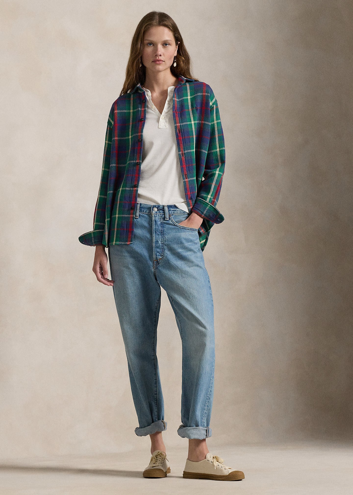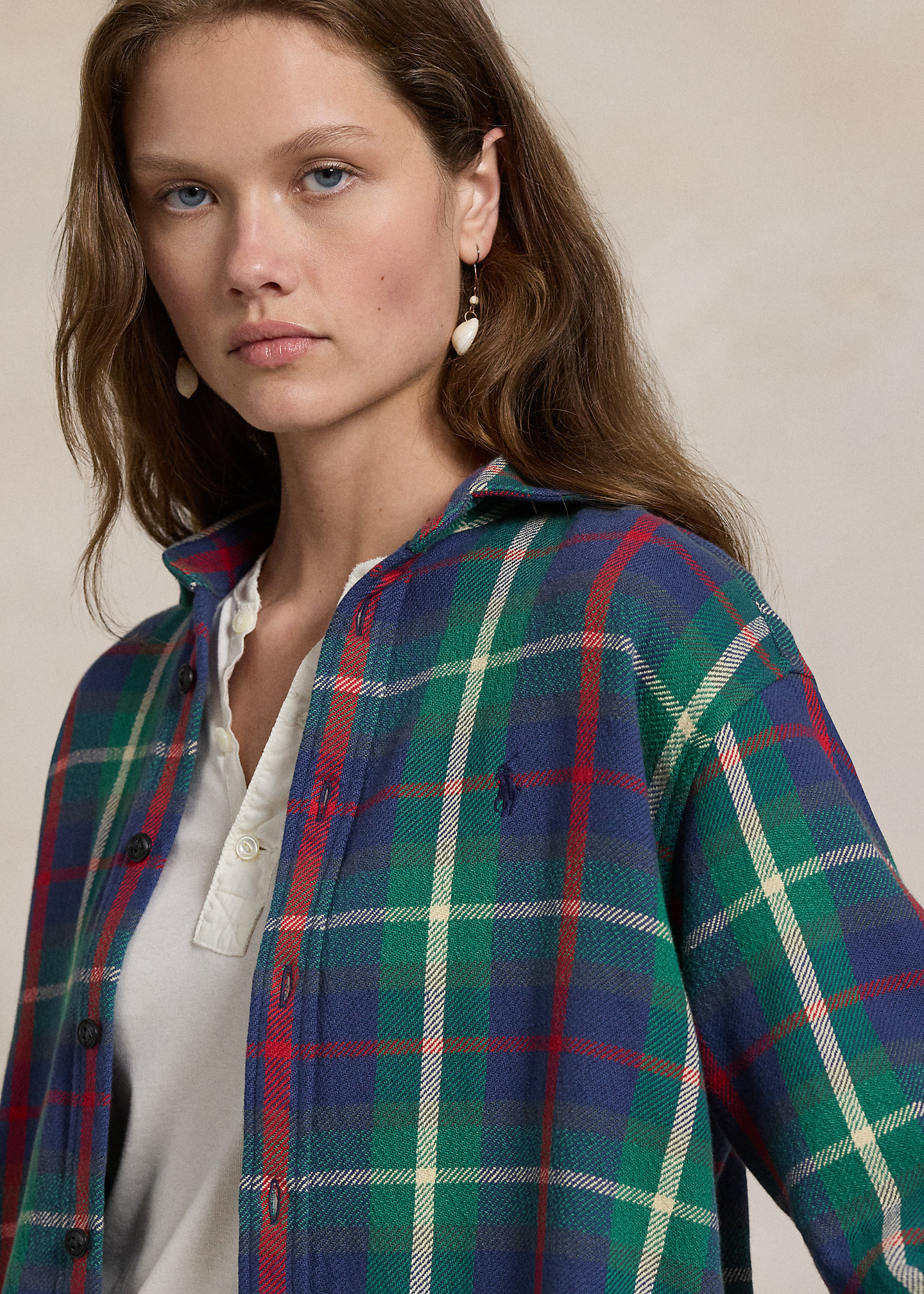 - Point collar. Buttoned placket. Long sleeves with buttoned barrel cuffs. Dropped shoulders. Box-pleated back yoke. High-low shirttail hem.