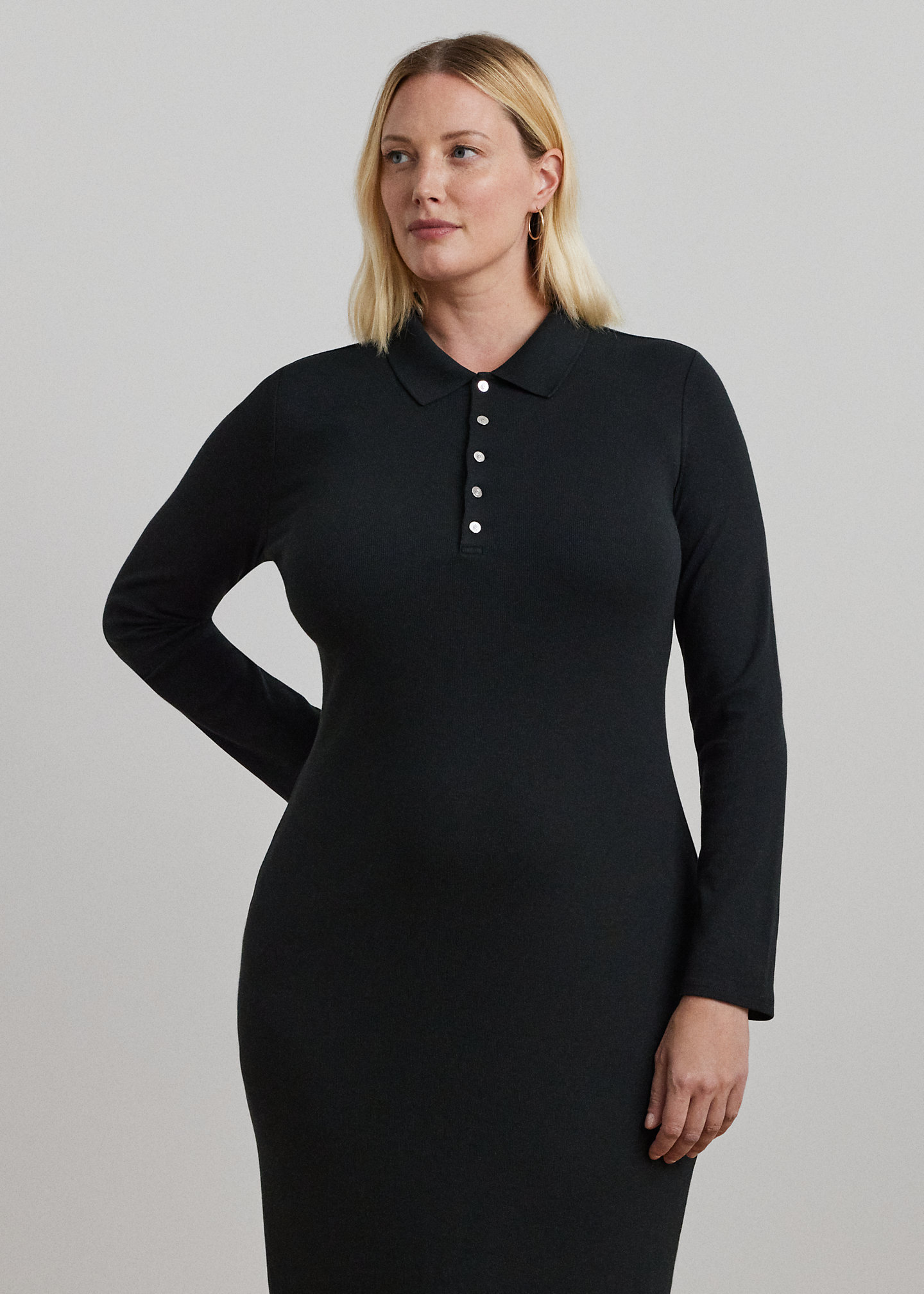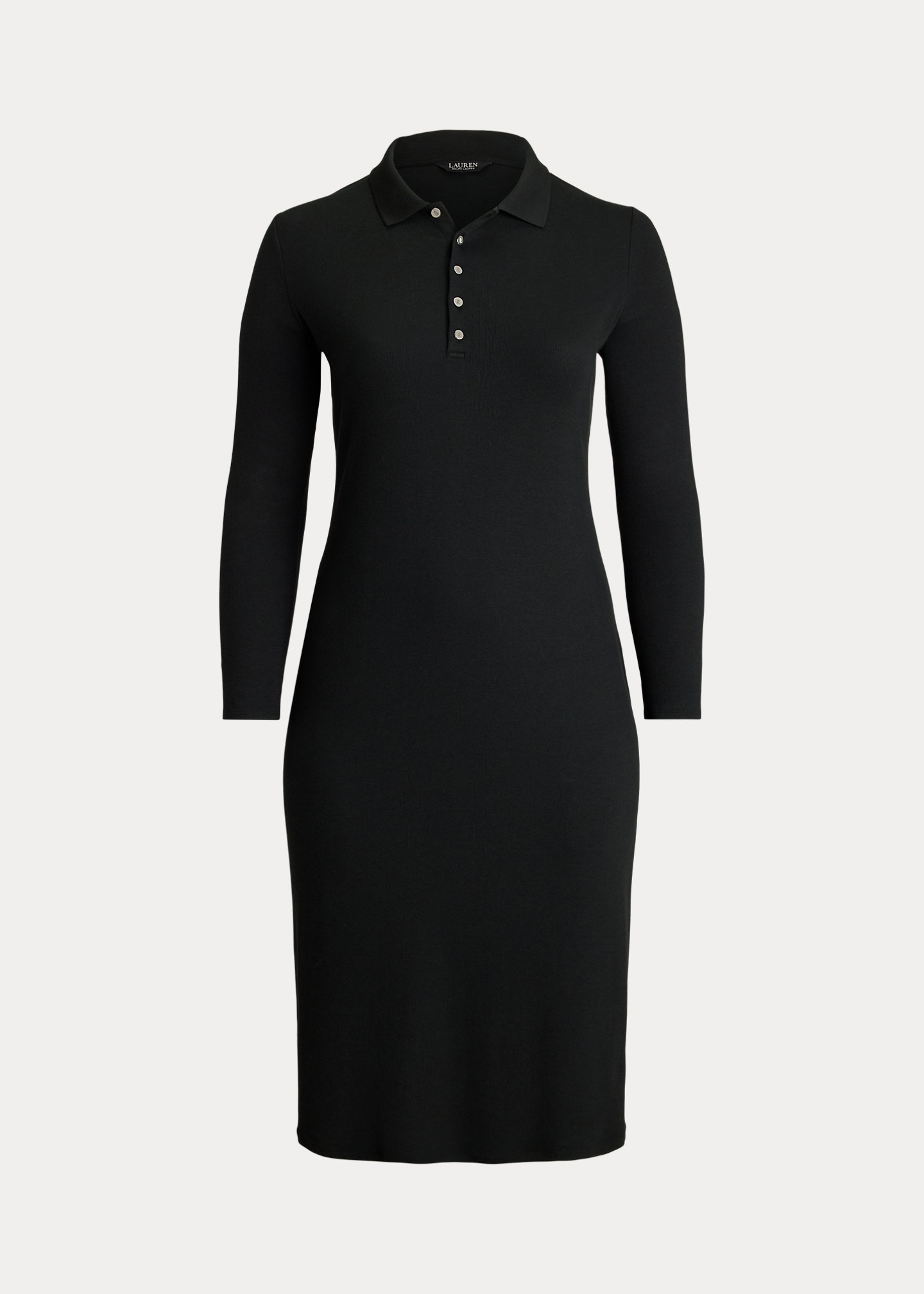 - Ribbed Polo collar. Five-button placket. “LRL”-engraved metal buttons.