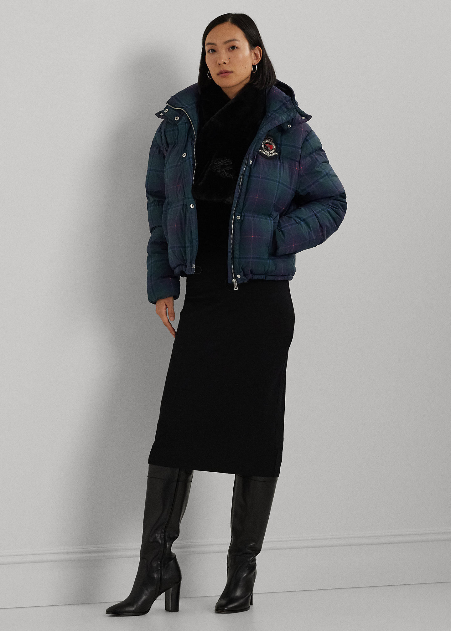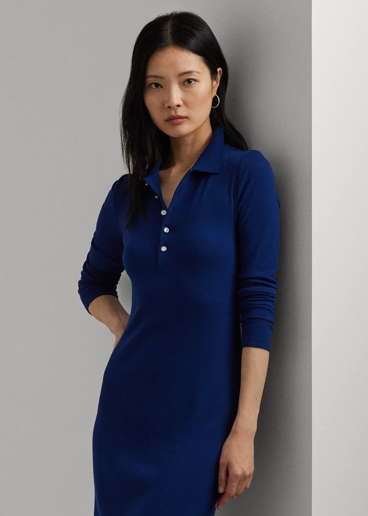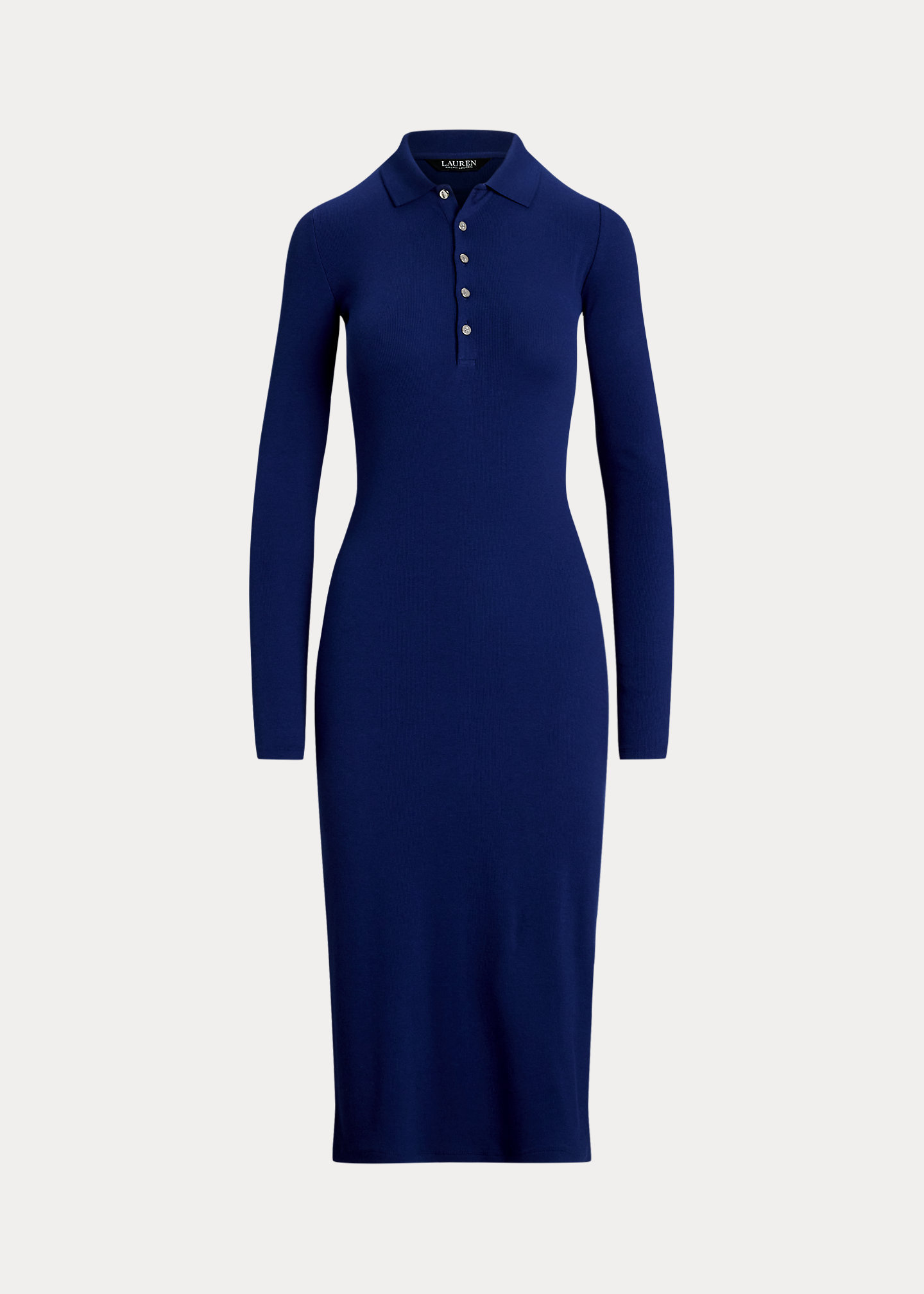 - Ribbed Polo collar. Five-button placket. “LRL”-engraved metal buttons.