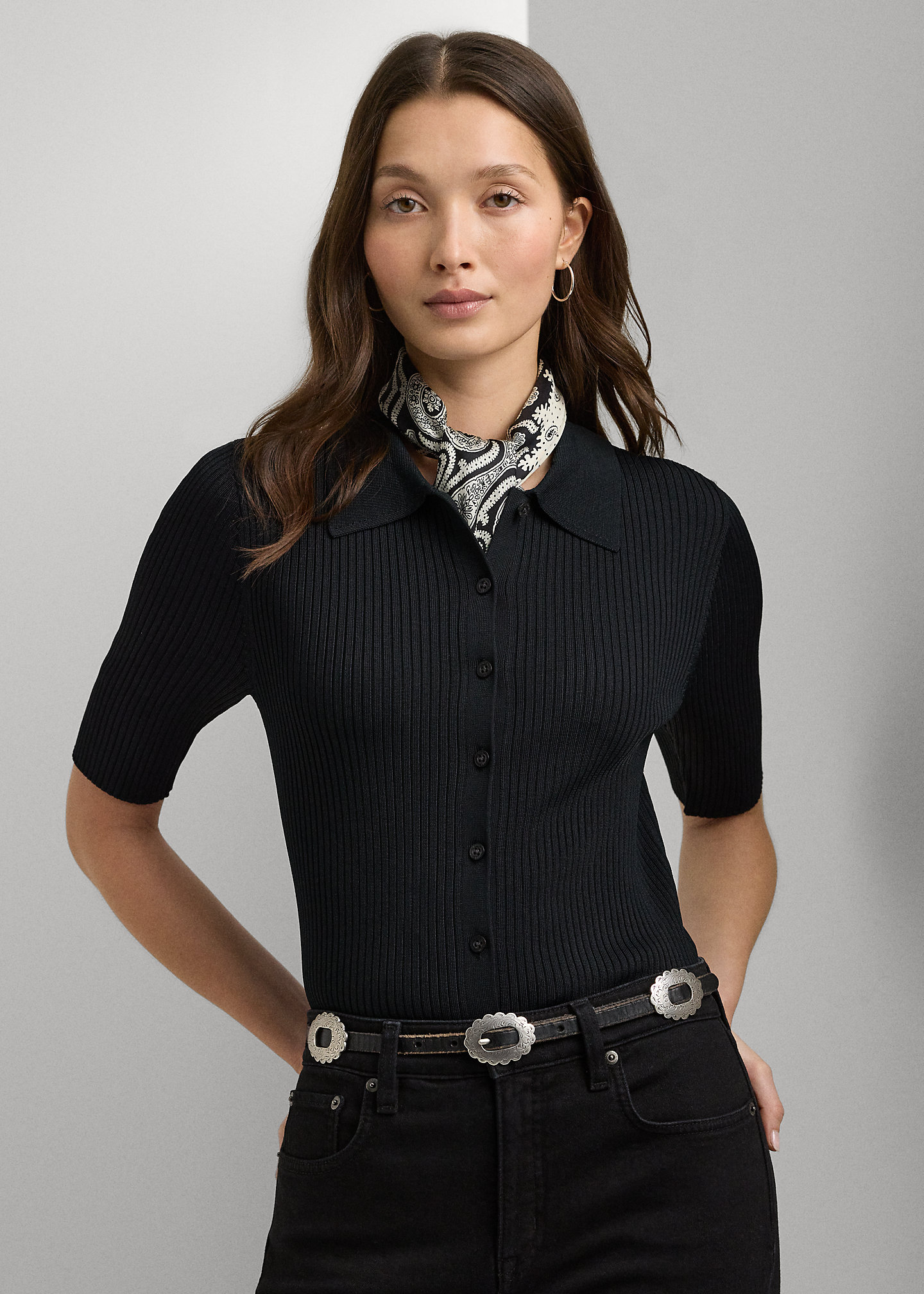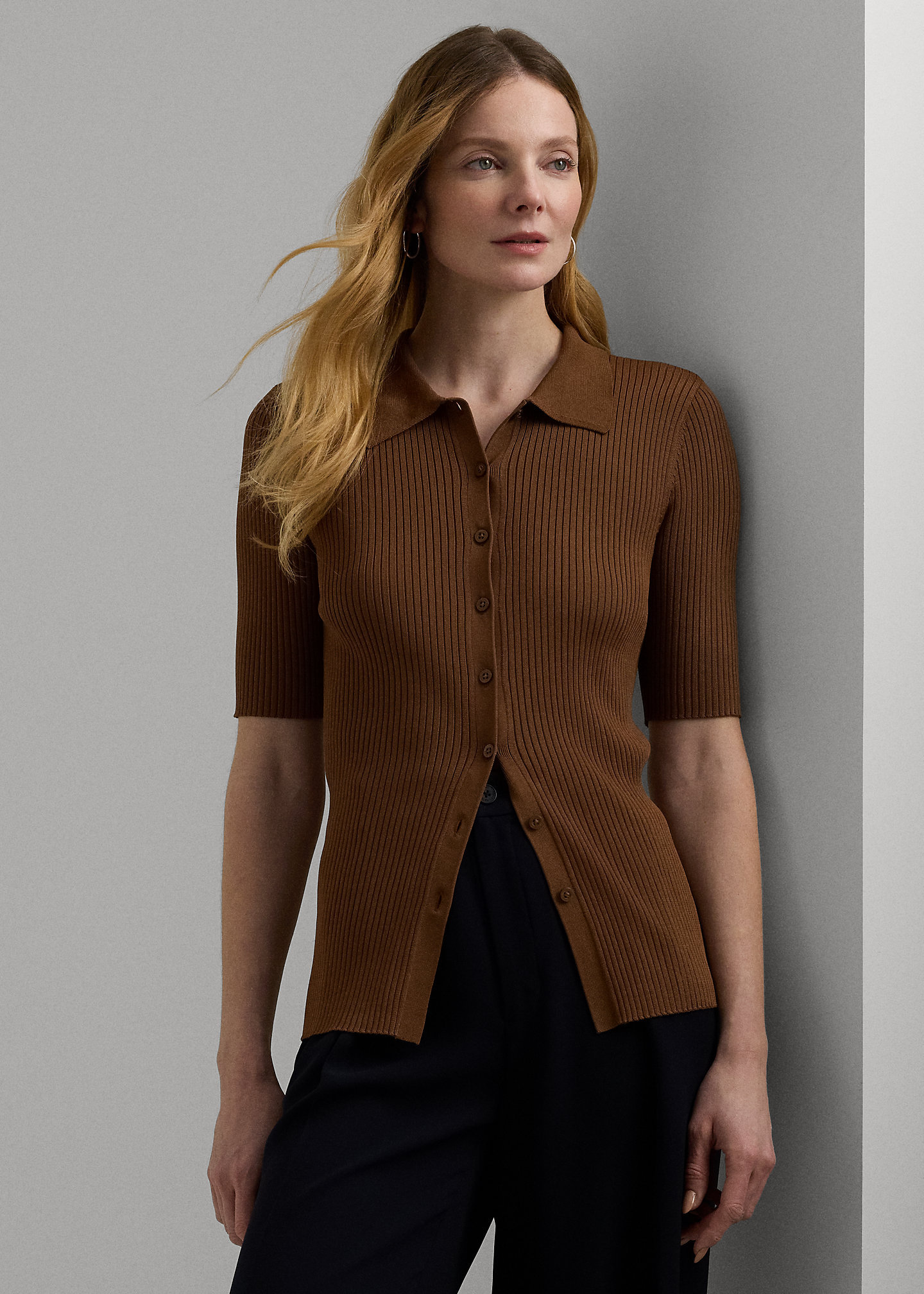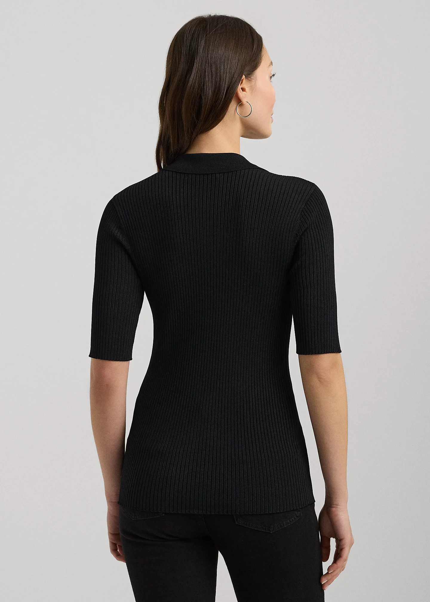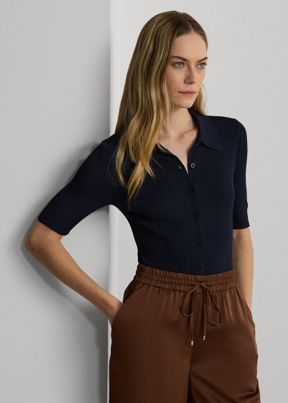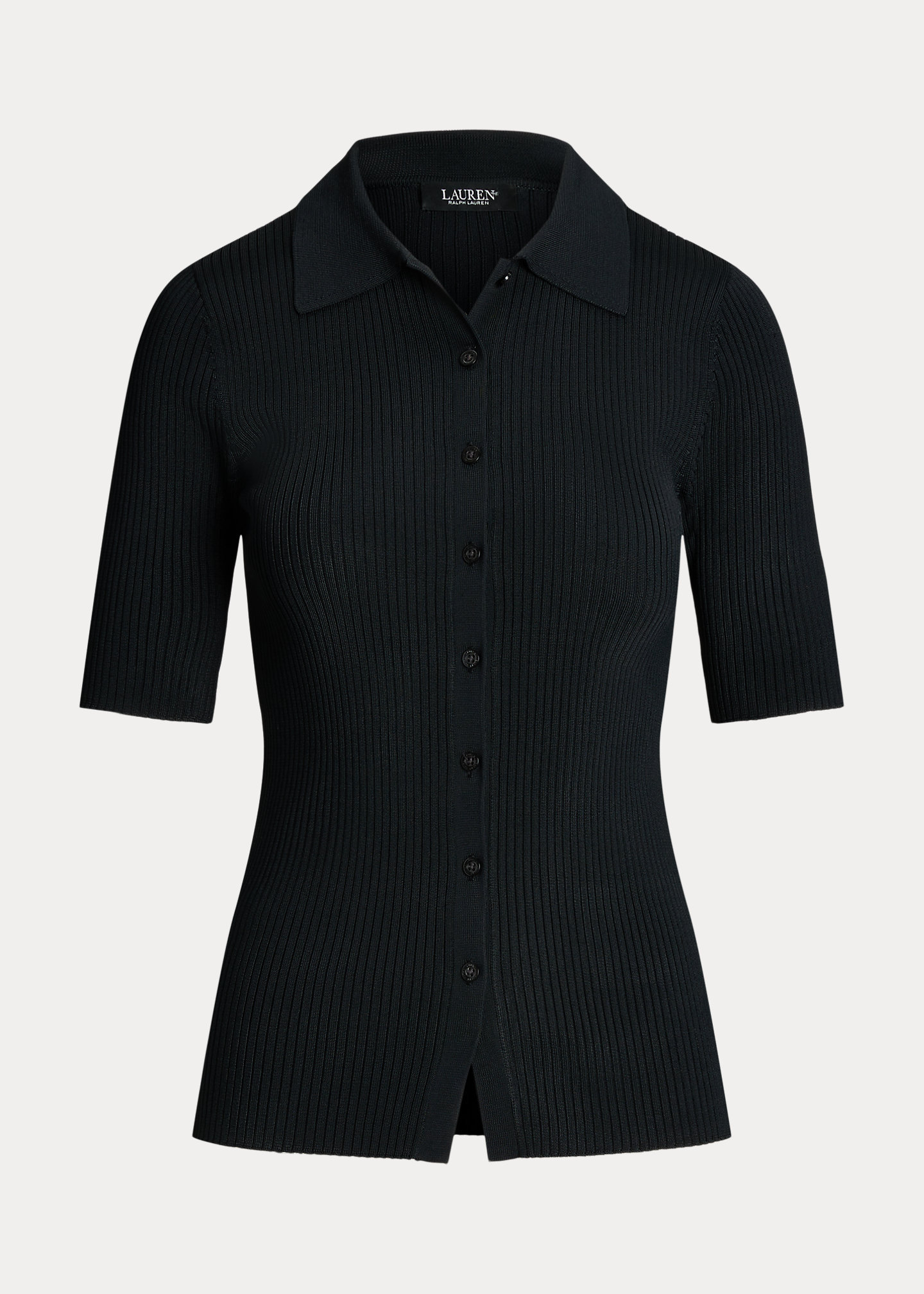 - Ribbed Polo collar. Buttoned placket. "Lauren Ralph Lauren"–engraved pearlized buttons.