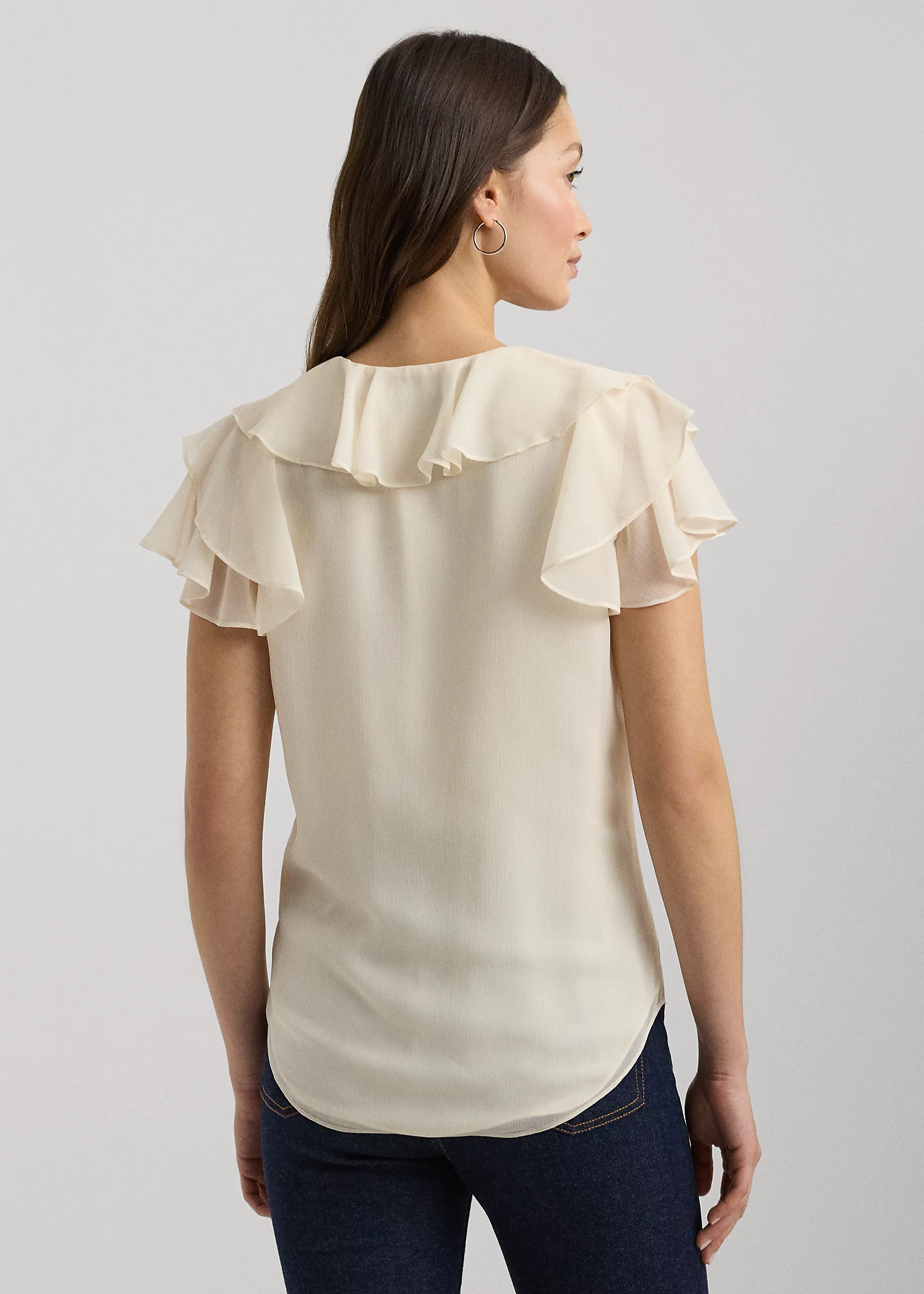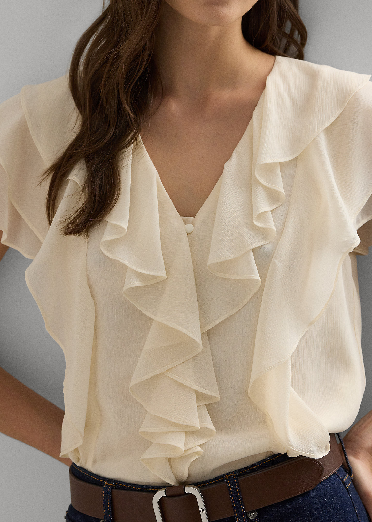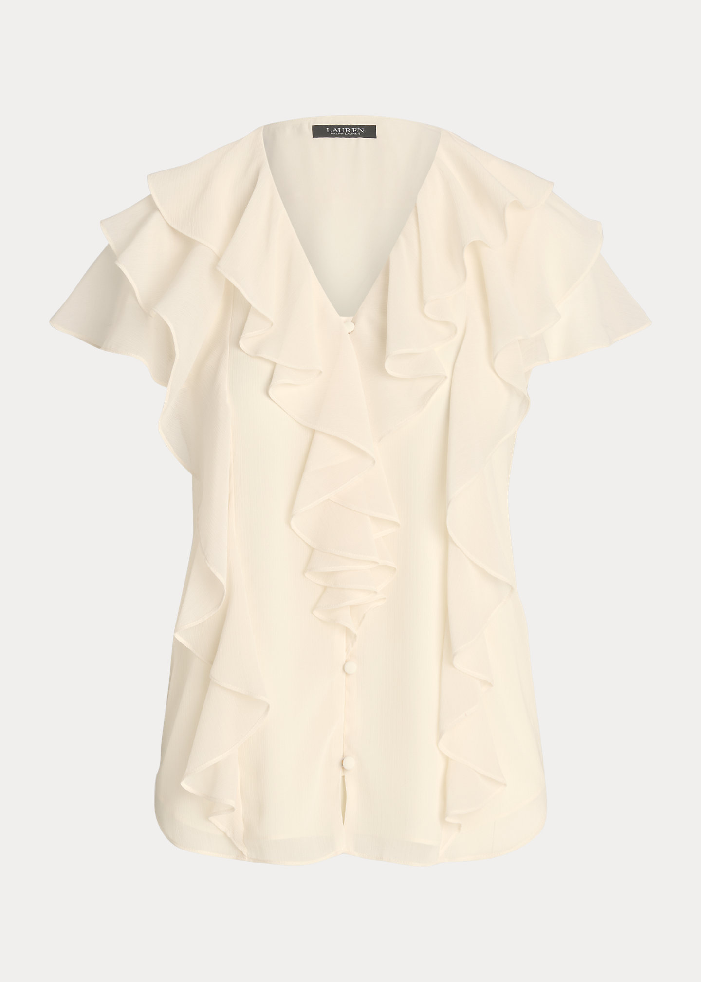 - Ruffle-trimmed V-neck. Ruffle-trimmed button-and-loop placket.