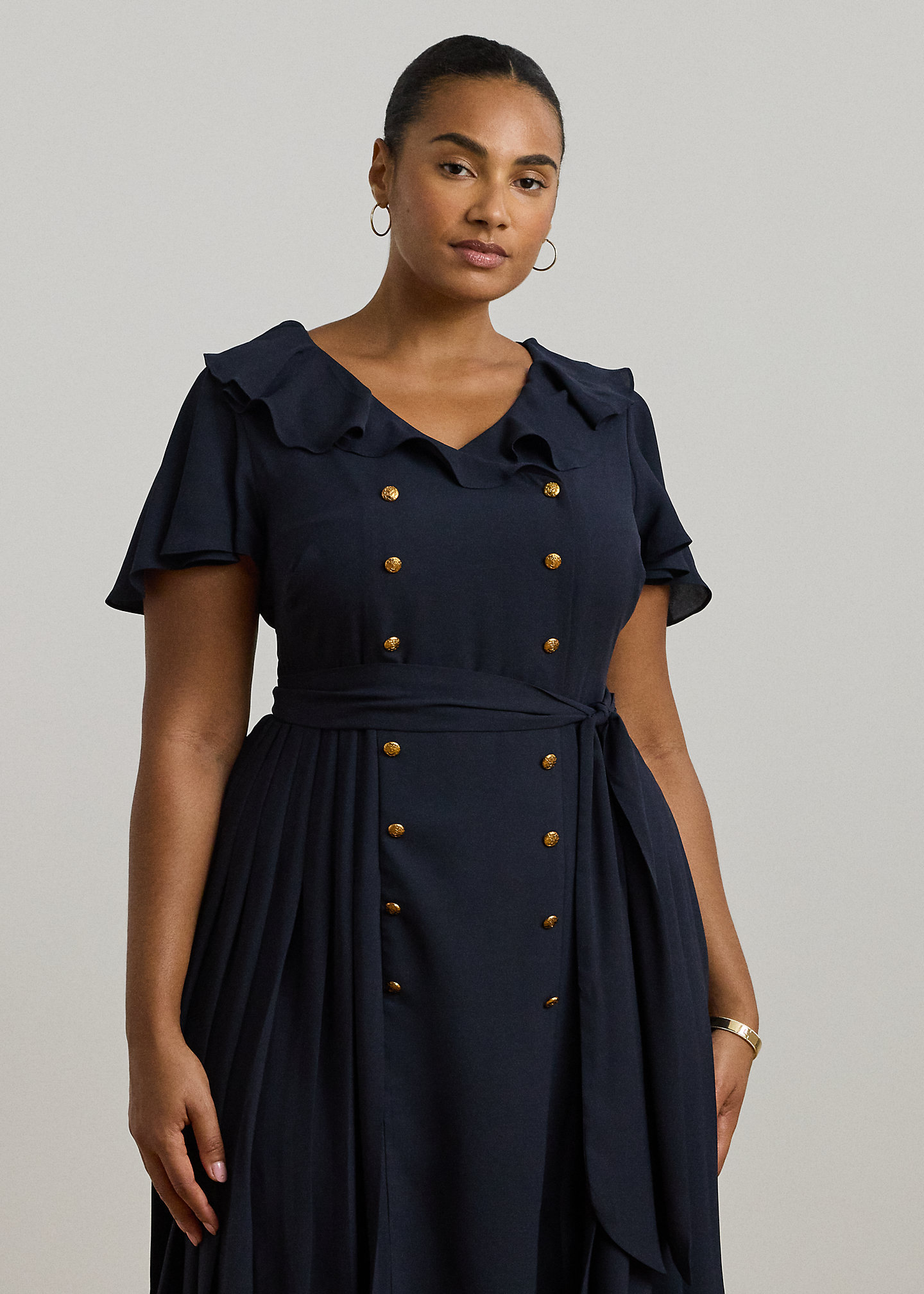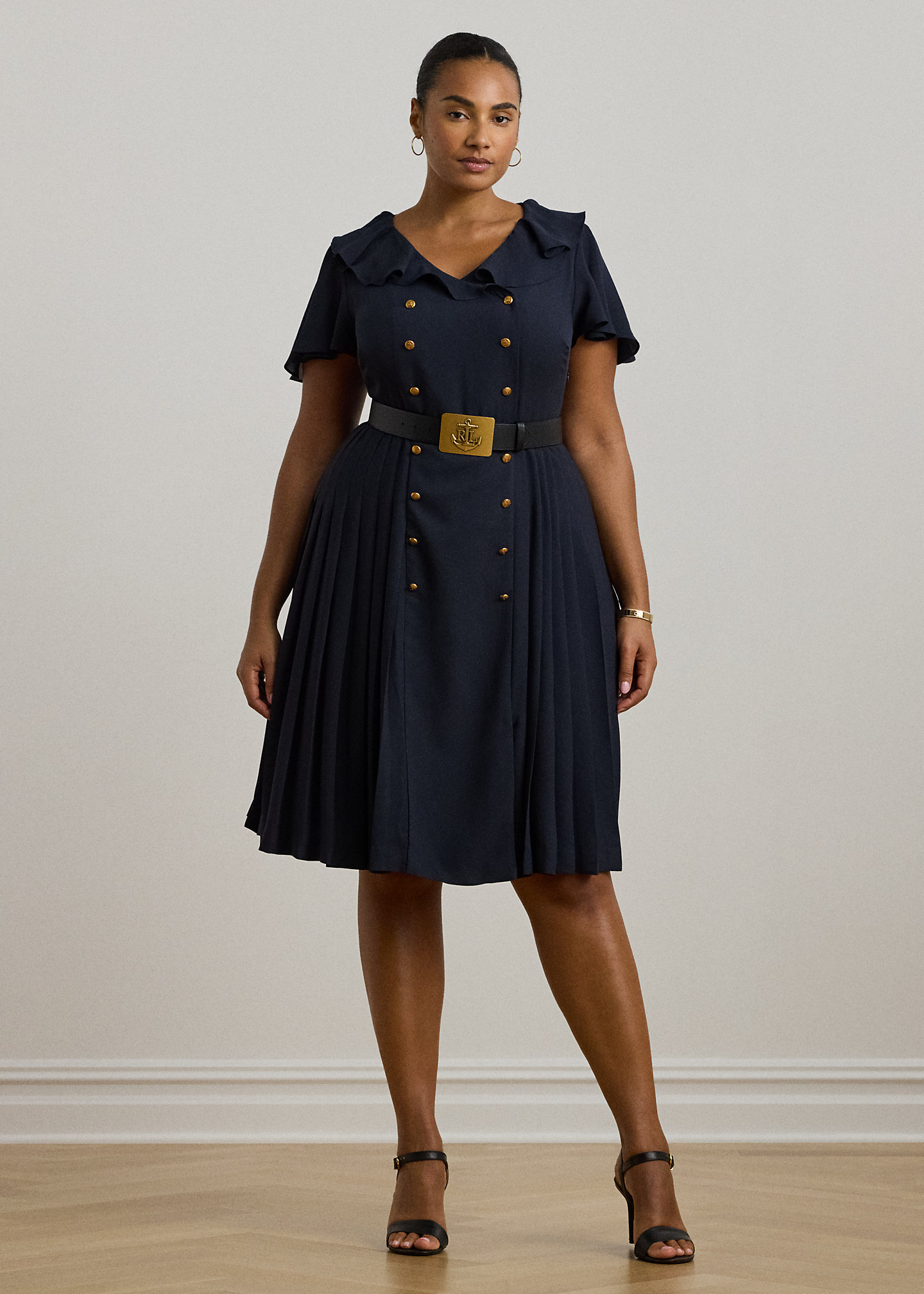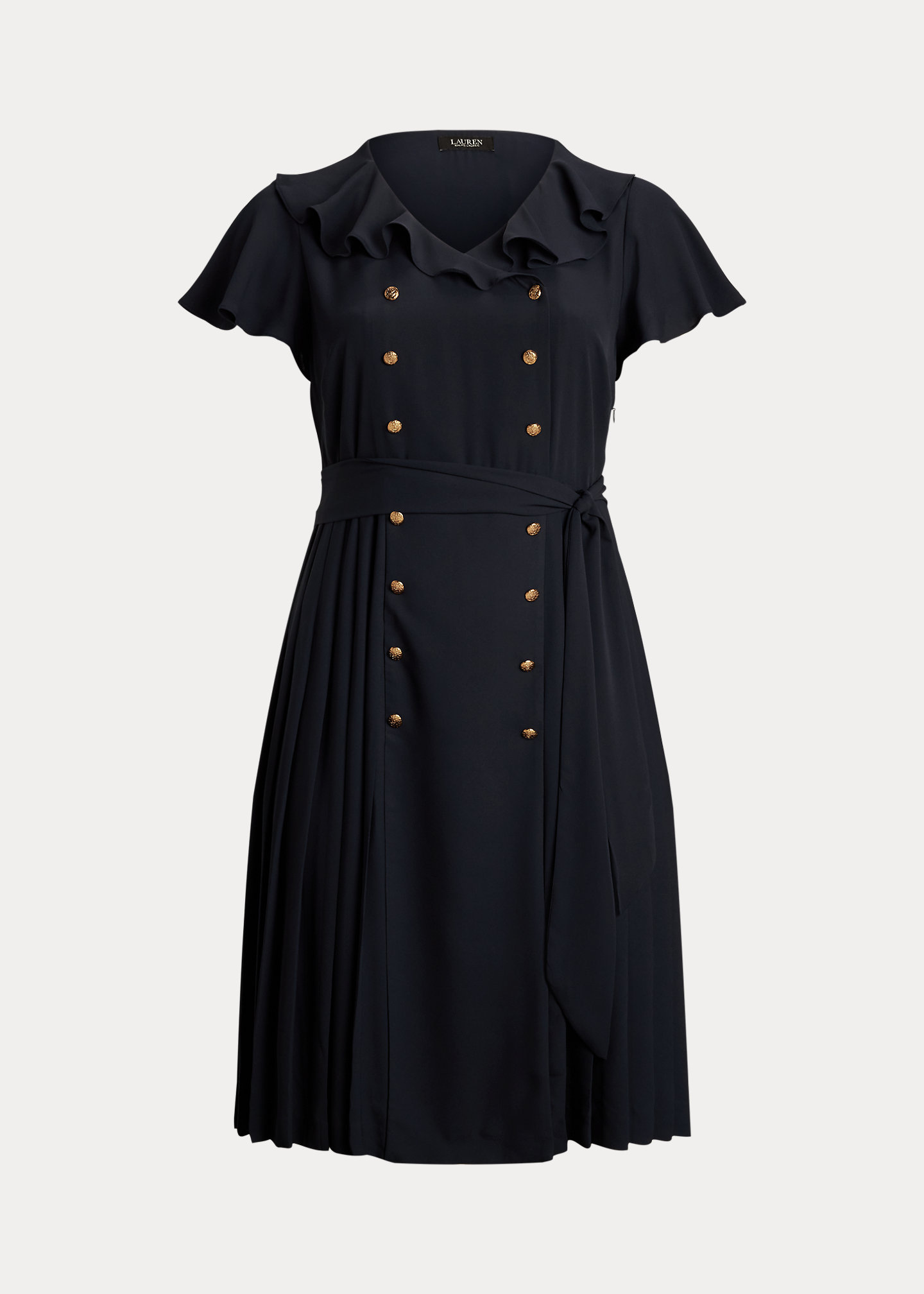 - Ruffle-trimmed surplice neckline. Double-breasted silhouette. Gold-tone anchor crest-embossed metal buttons. Concealed left-side-seam zipper.