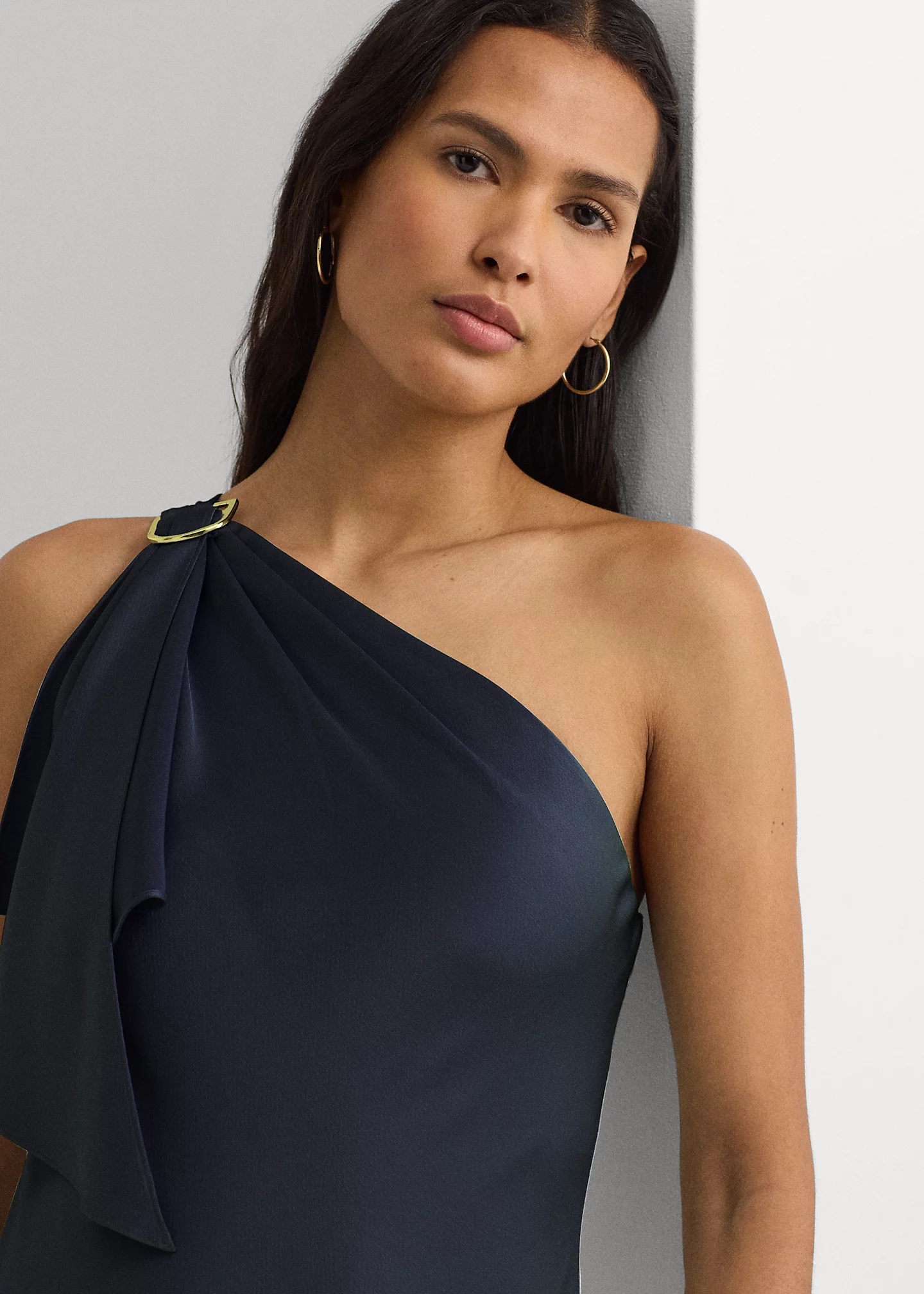 - Ruffle trim at the right shoulder cascades from an “LRL”-engraved metal buckle at the shoulder.