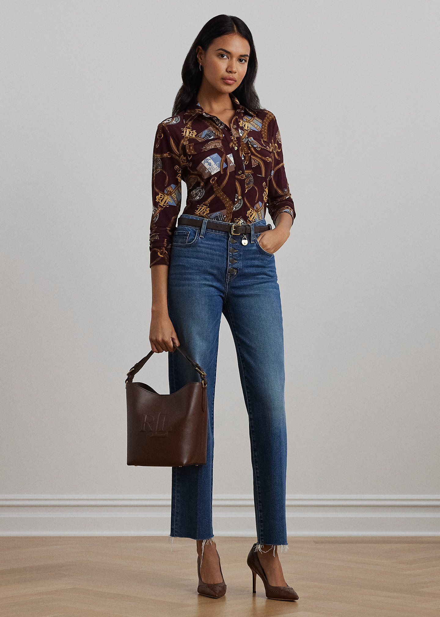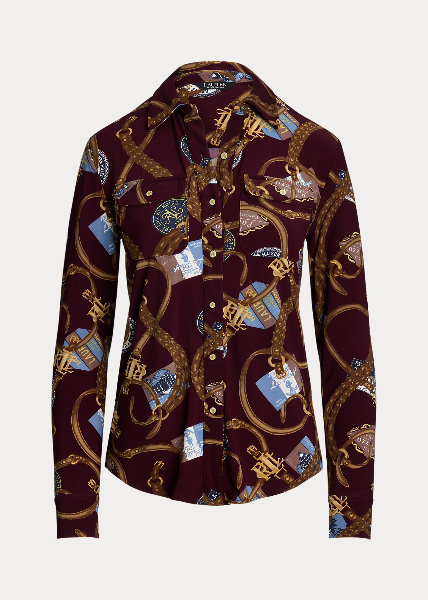 - Spread collar. Buttoned placket. “LRL”-engraved metal buttons.