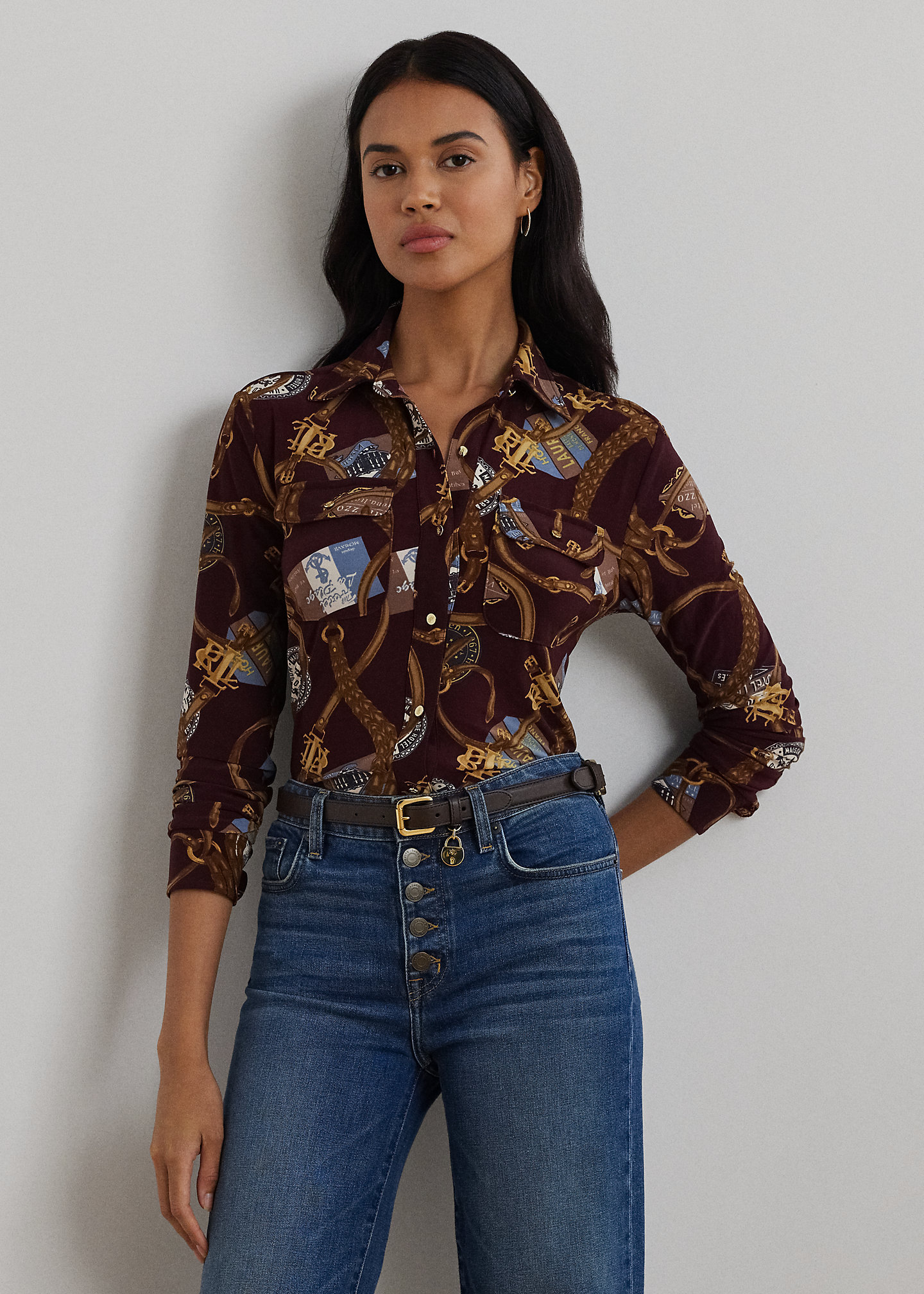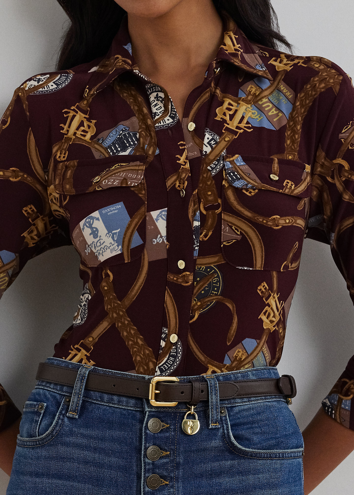 - Long sleeves with buttoned barrel cuffs. “Lauren Ralph Lauren”–engraved buttons at the sleeve placket. Two chest buttoned-flap patch pockets. “LRL”-engraved metal buttons at the cuffs and pockets.