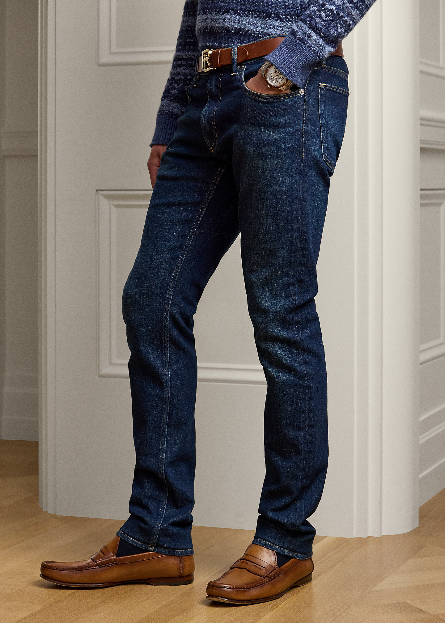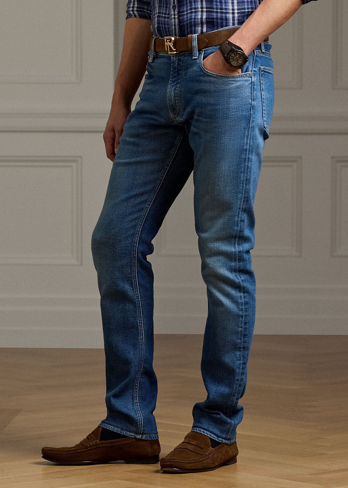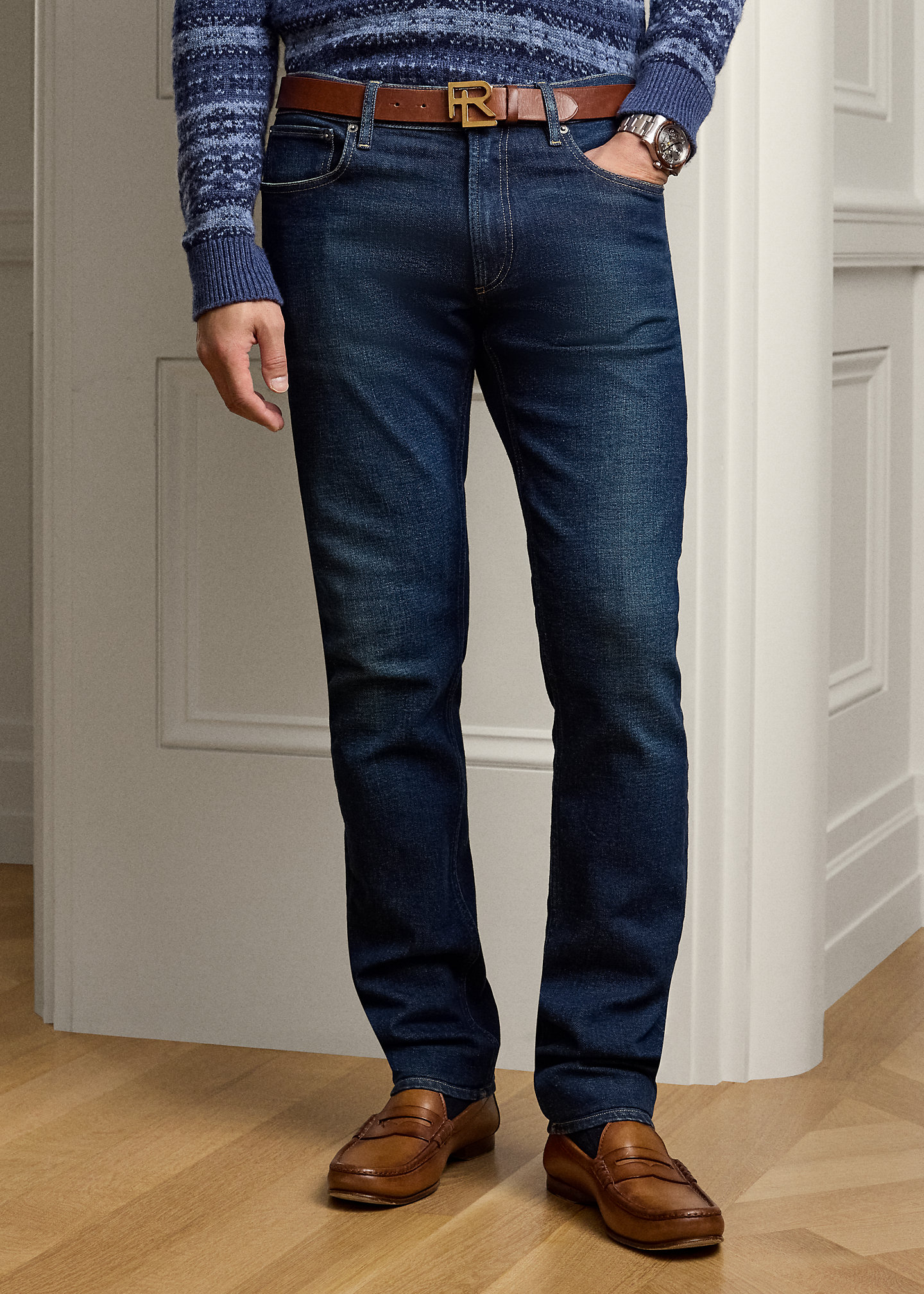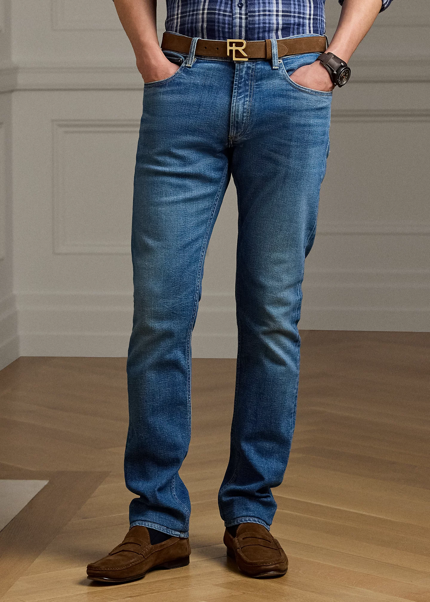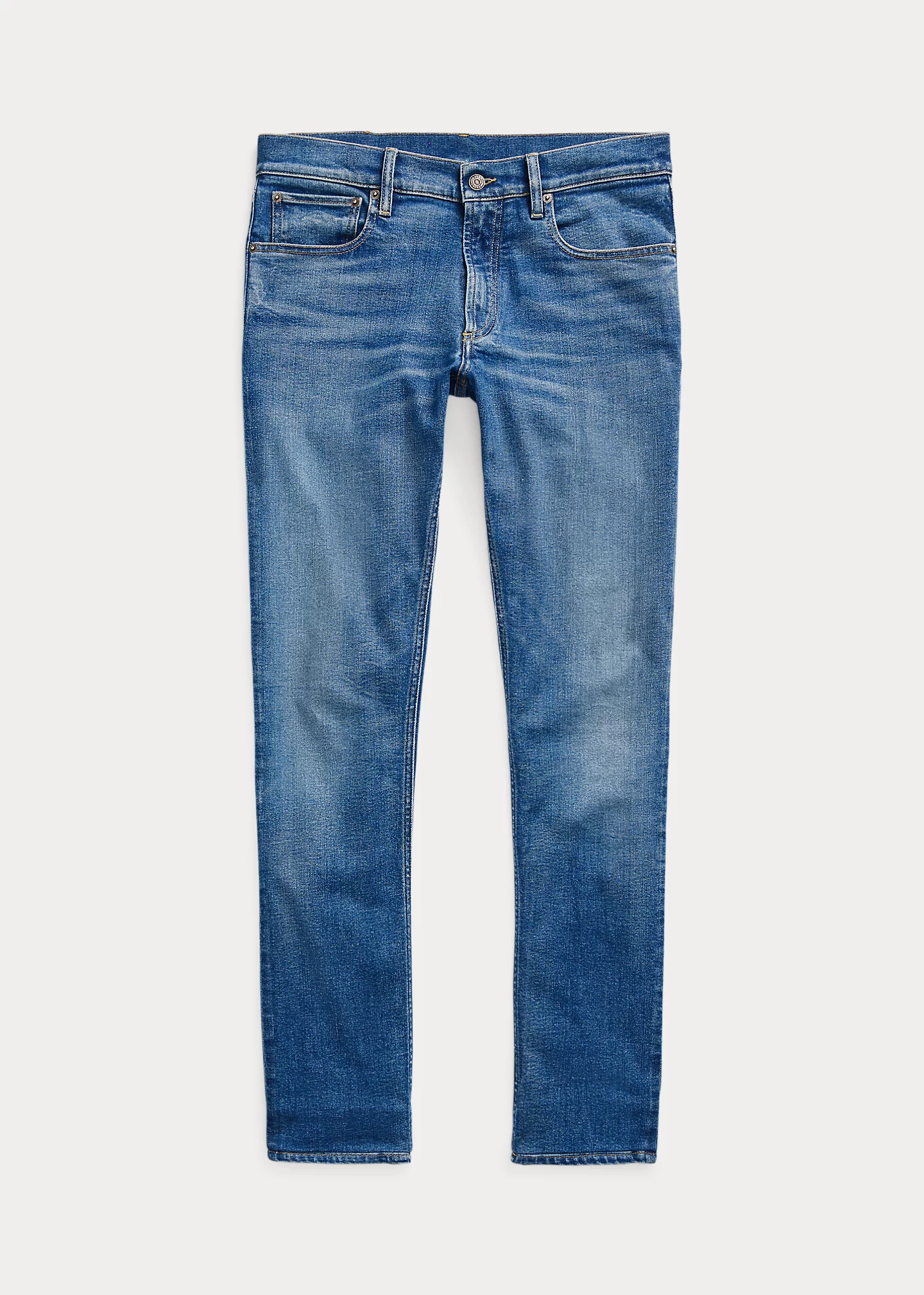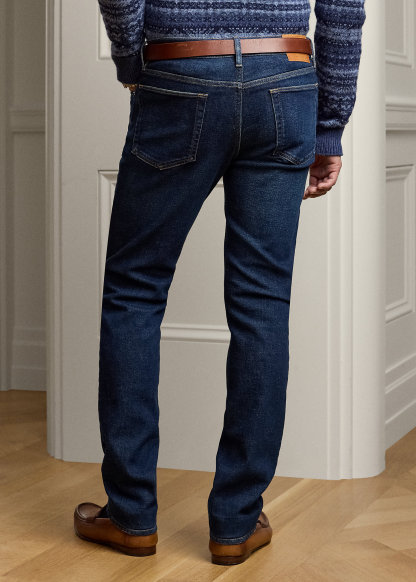 - Five-pocket styling with signature metal rivets. Stacked RL logo label at the coin pocket.