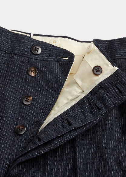 - Belt loops. Button fly with a buttoned closure. Genuine horn buttons. Curtain waistband. Interior buttons for braces.